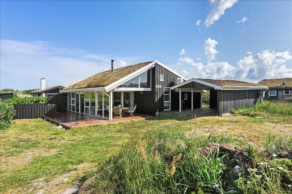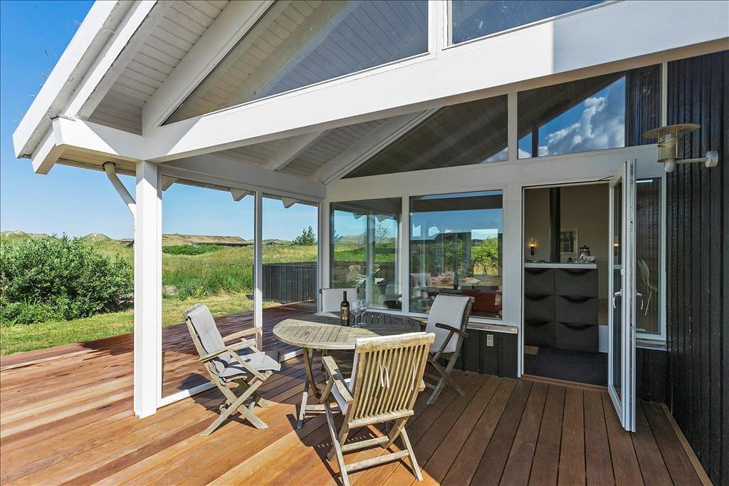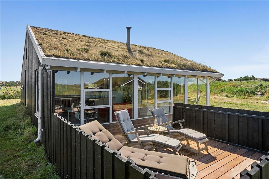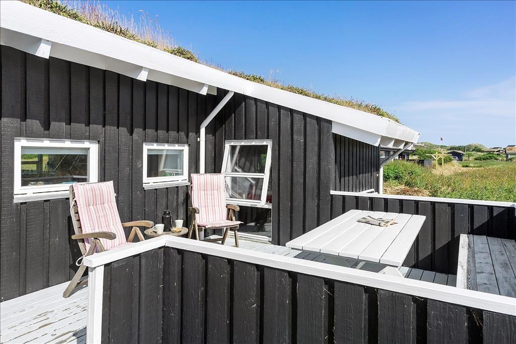 Sommerhuset ligger i pragtfuldt område ved Rødhus. På dejlig naturgrund hvor der også er en lille plæne. Den store terrasse hvoraf en del er overdækket, giver masser af muligheder for udetimer i den danske sommer. Grill og havemøbler står naturligvis til rådighed. Ved sommerhuset findes en carport, hvor bilen under hele ferien kan placeres sikkert i læ for Vesterhavets sand og salt.