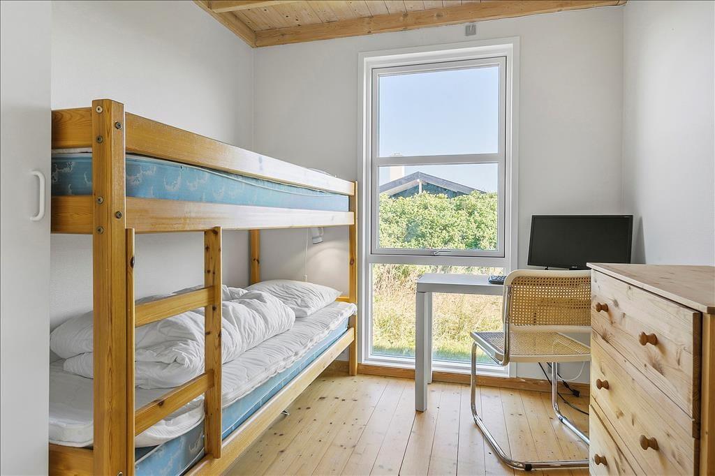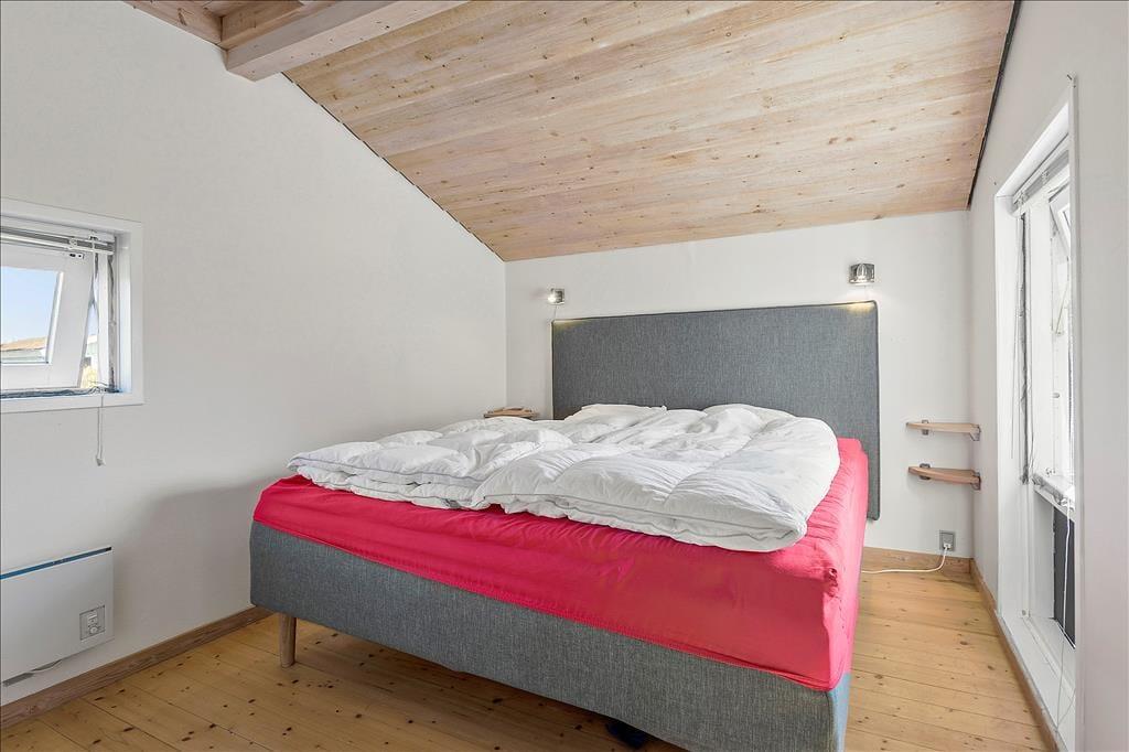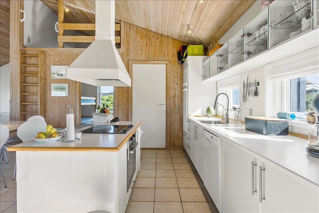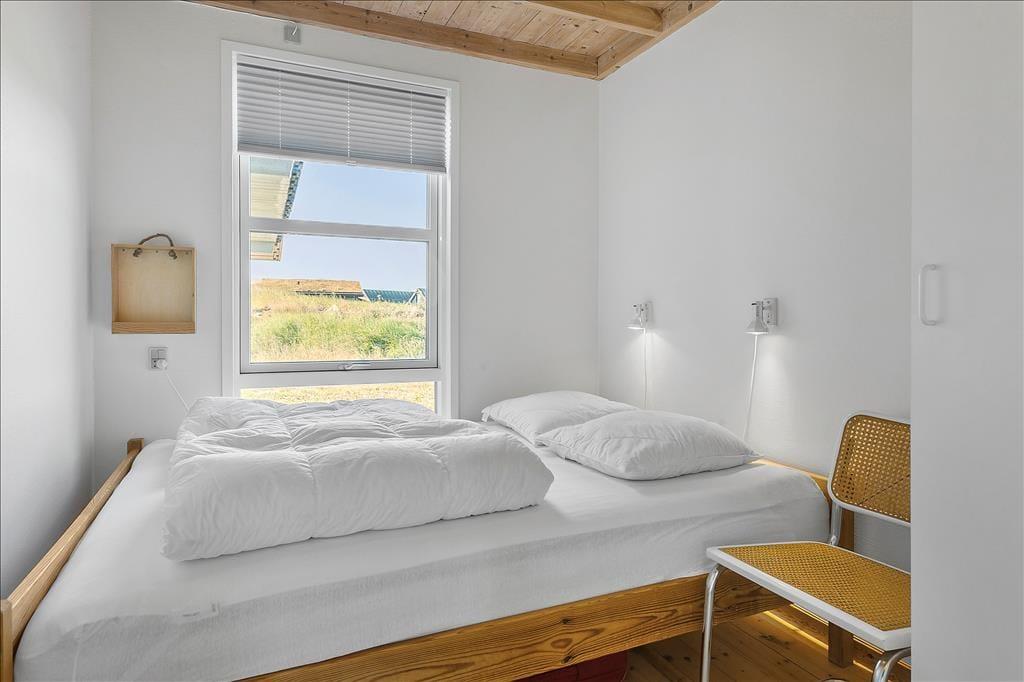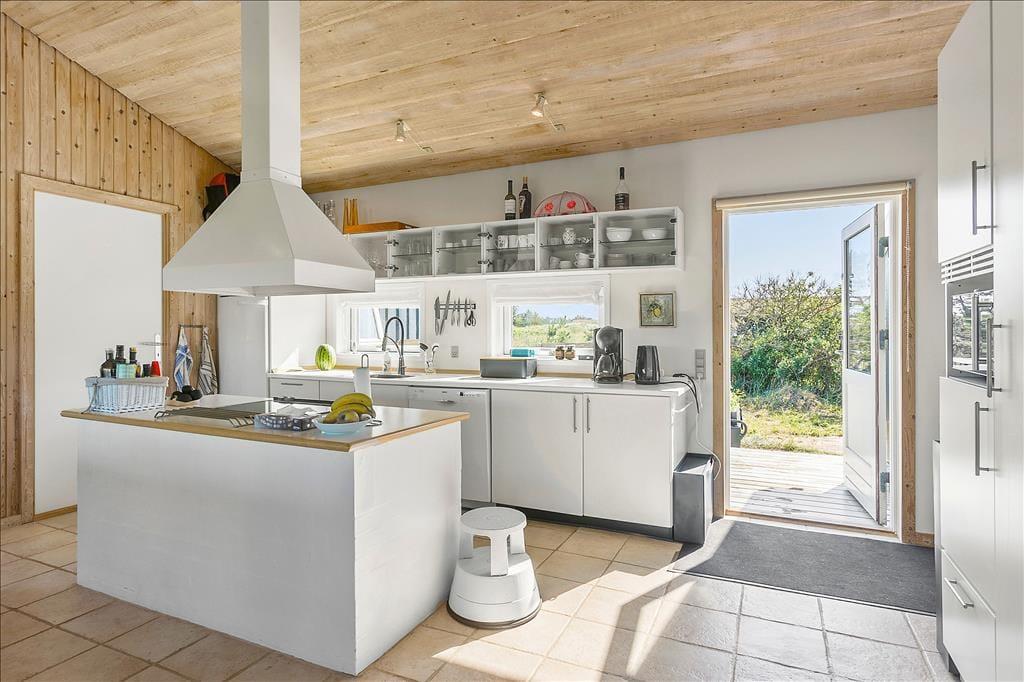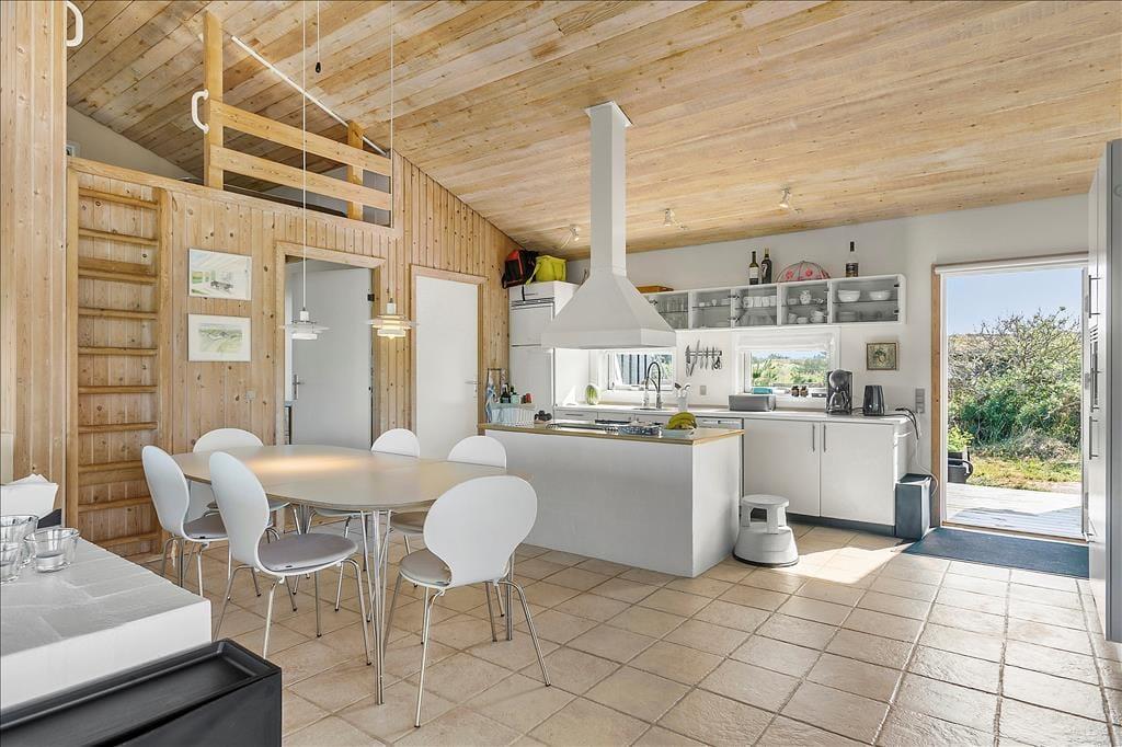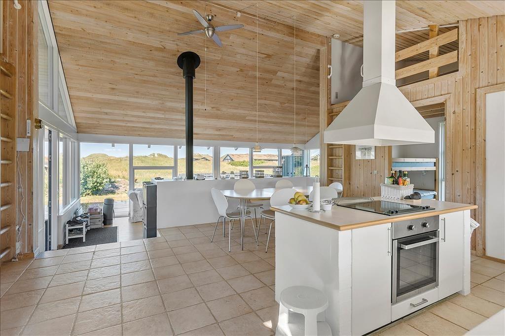 Husets hjerte er det store lyse køkken der via et par trin ned forbindes med den hyggelige stue. Her er der god udsigt til den omkringliggende natur. Fra køkkenet er der adgang til badeværelse med brus og her findes også husets sauna. Her er det skønt at kunne varme sig enten efter en tur i det brusende Vesterhav eller efter en oplevelsesrig dag i det nordjyske. Fra køkkenet er der ligeledes adgang til de tre gode soverum hvor de to er med dobbeltseng og det sidste med køjer. Derudover forefindes to hemse i huset. Så her er rigelig plads til hele familien. Eller par der ønsker sig høj kvalitet i de helt rigtige omgivelser. Huset råder over både vaskemaskine, tørretumbler og naturligvis frit internet, så man kan holde sig orienteret om f.eks vejret eller oplevelser i det nordjyske.