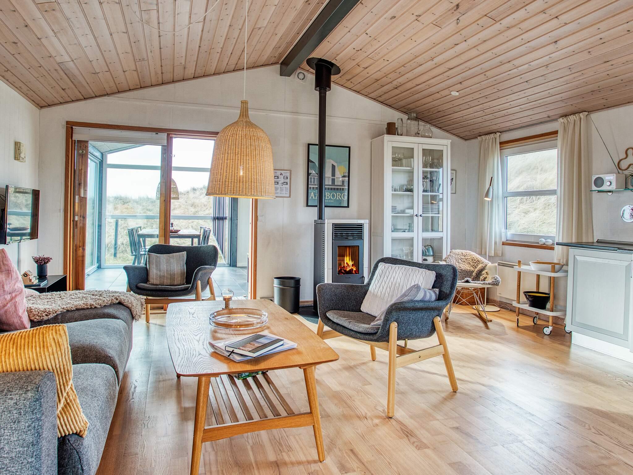 Huset er moderne og komfortabelt indrettet med tre soveværelser - to med dobbeltsenge og et med en køjeseng - ideelt til børn eller ekstra gæster. Det åbne køkken og opholdsstue giver masser af plads til familieliv, spisning og socialt samvær, mens store vinduespartier giver panoramaudsigt over de omkringliggende klitter. Køkkenet er fuldt udstyret, inklusive en Nespresso-maskine, hvilket gør det praktisk at tilberede måltider og nyde en hyggelig indendørs atmosfære.