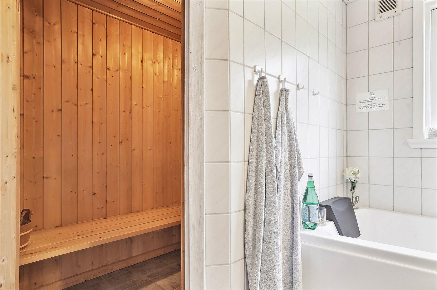 Der er 2 badeværelser med bruseniche og 2 toiletter. Der er gulvvarme på 2 badeværelser. I saunaen er der mulighed for afslapning.