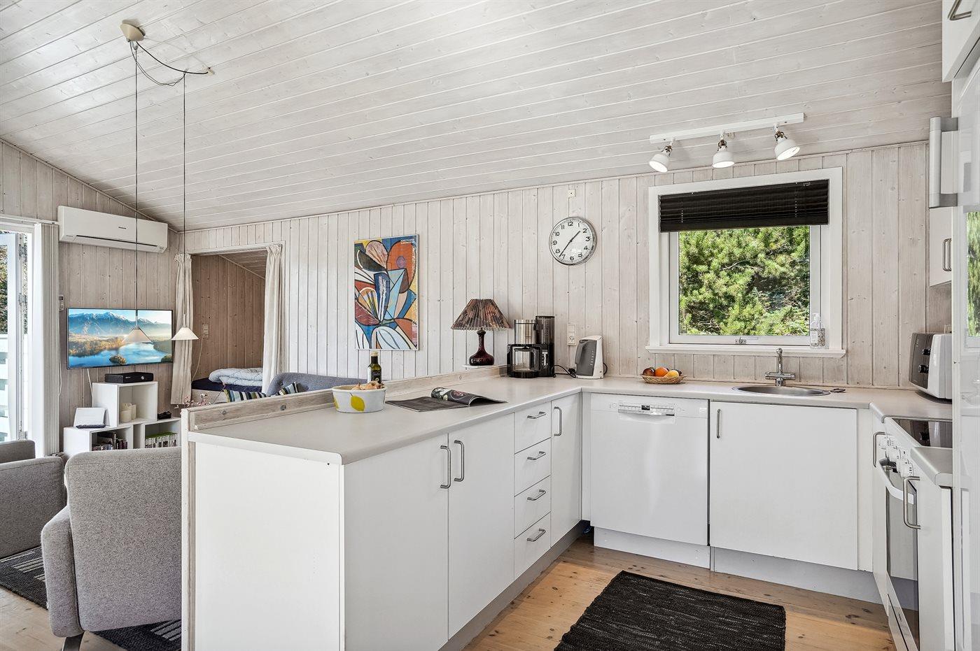 Køkkenet er udstyret med 1 køleskab. Der er 4 keramiske kogeplader, bageovn, mikrobølgeovn samt opvaskemaskine.