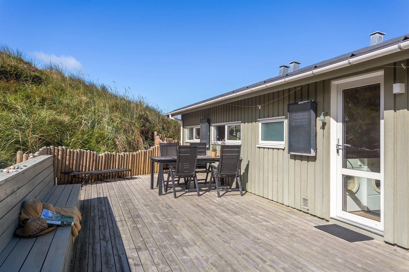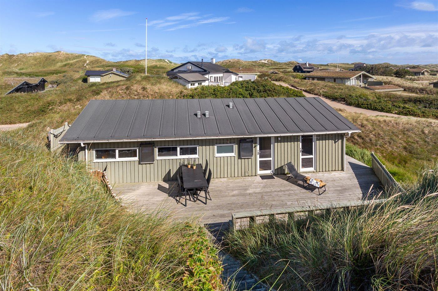 Velholdt og hyggeligt sommerhus i træ, beliggende kun 100 m fra havet på en dejlig stor og kuperet klitgrund. Bemærk: En trappe fører ned til legeområdet med gynge og sandkasse.