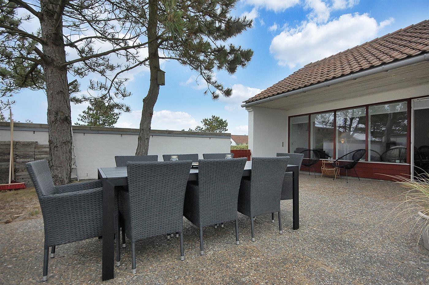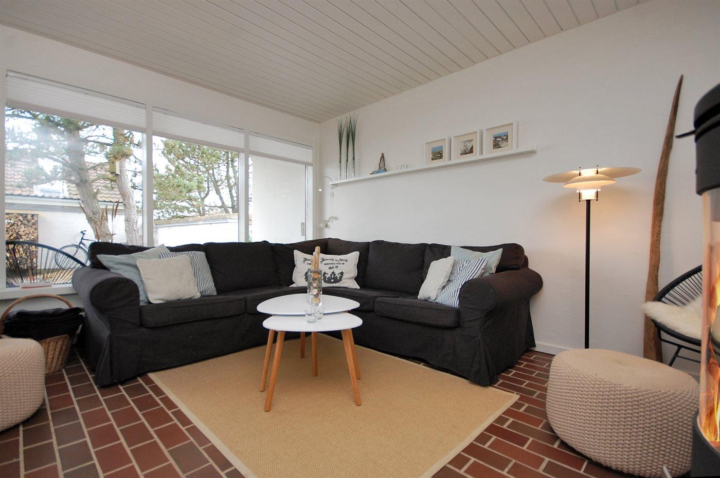 Velindrettet og rummelig feriebolig beliggende i ferieby lige bag klitterne til stranden og Vesterhavet i et naturskønt og kuperet område.