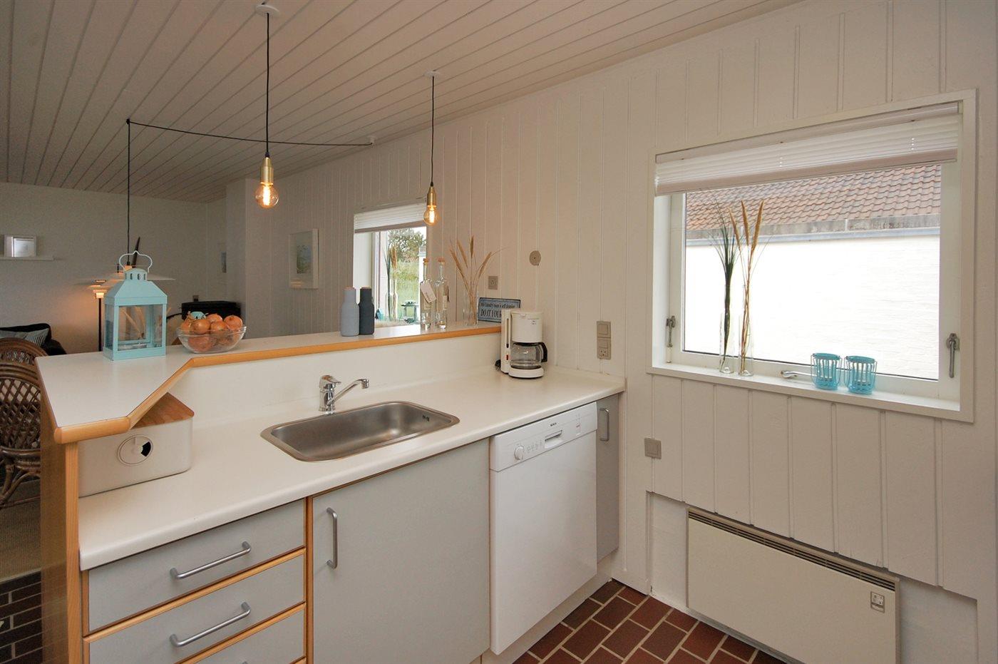 Køkkenet er udstyret med 1 køleskab. Der er 4 elkogeplader, varmluftovn samt opvaskemaskine.