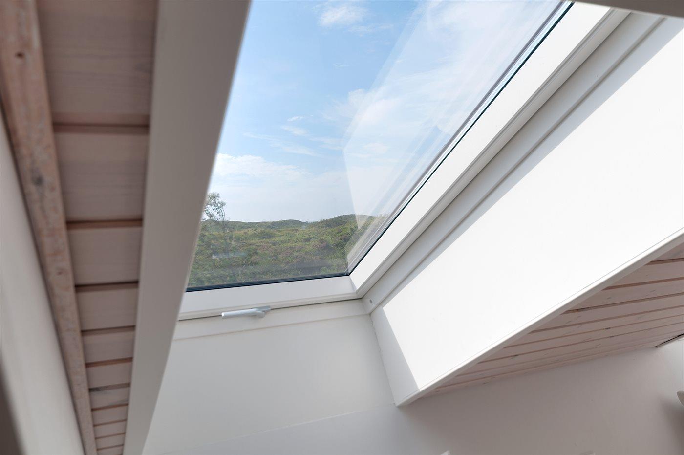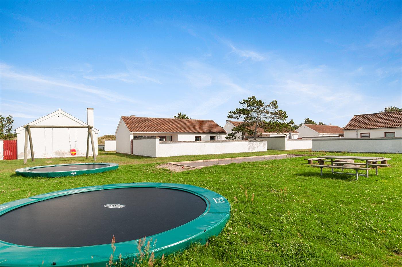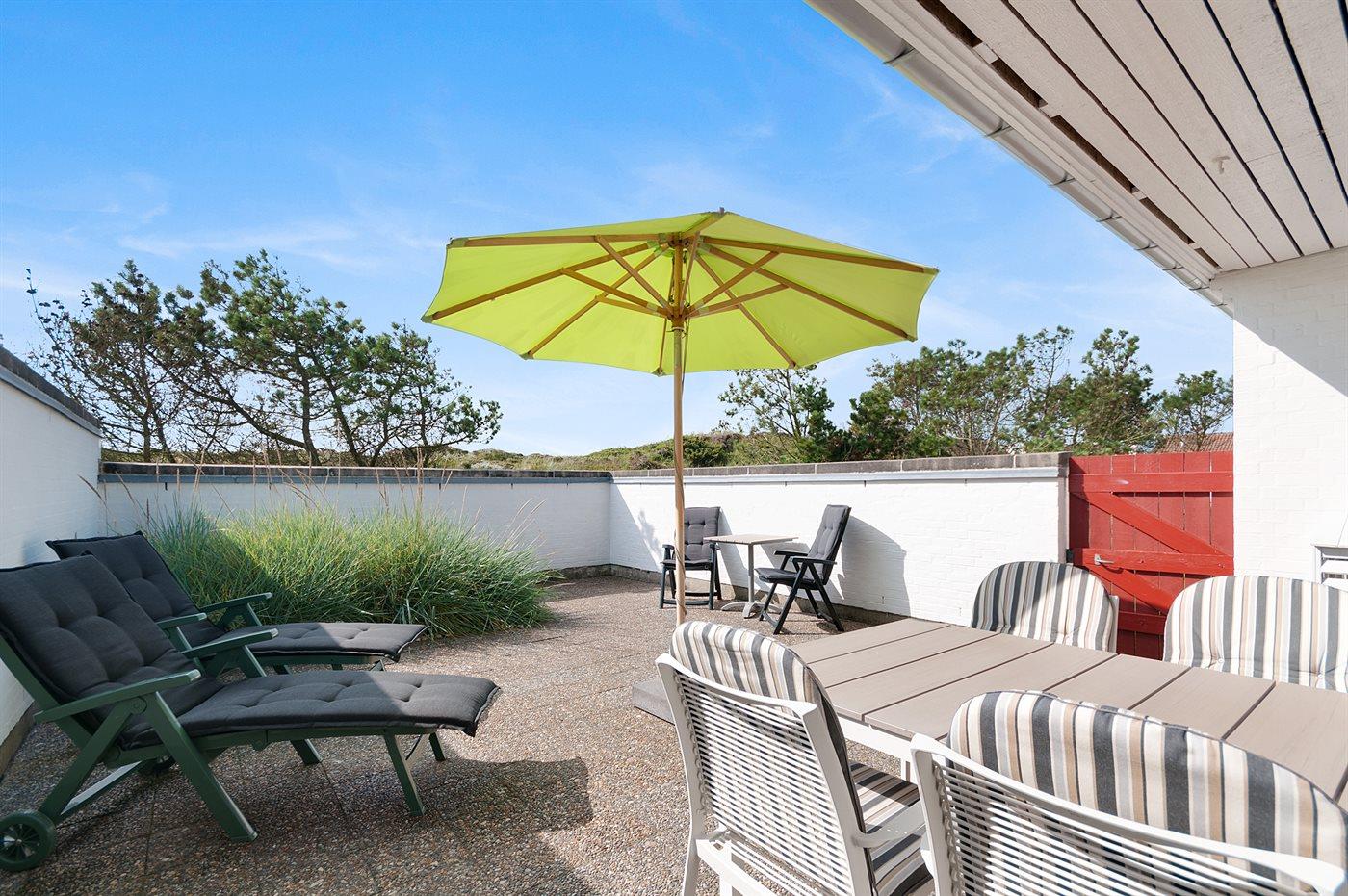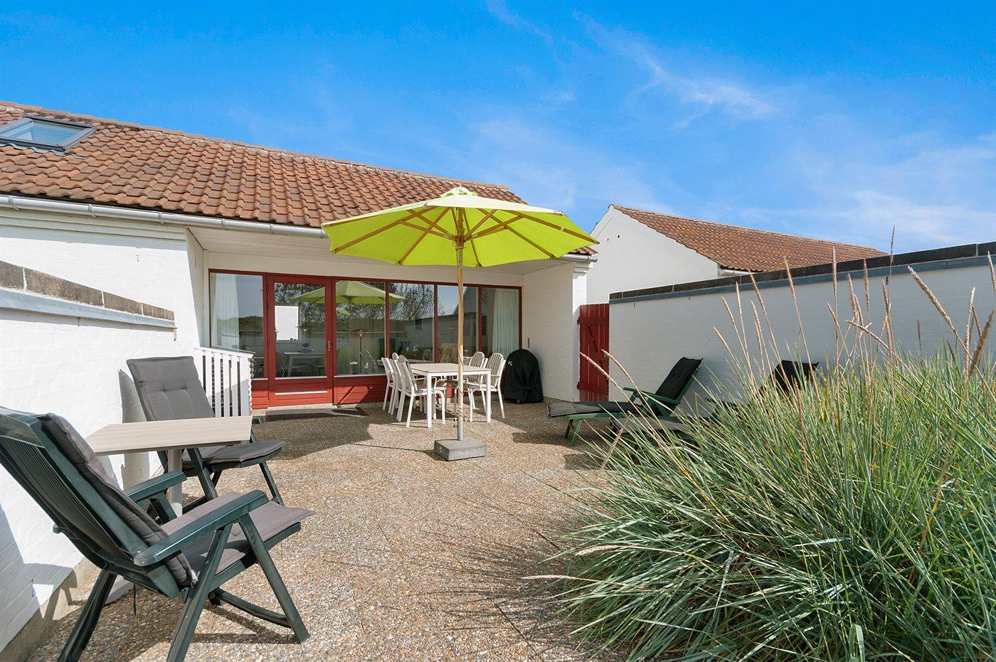 Hyggelig og lyst indrettet feriebolig beliggende i ferieby lige bag klitterne til stranden og Vesterhavet i et naturskønt og kuperet område.
