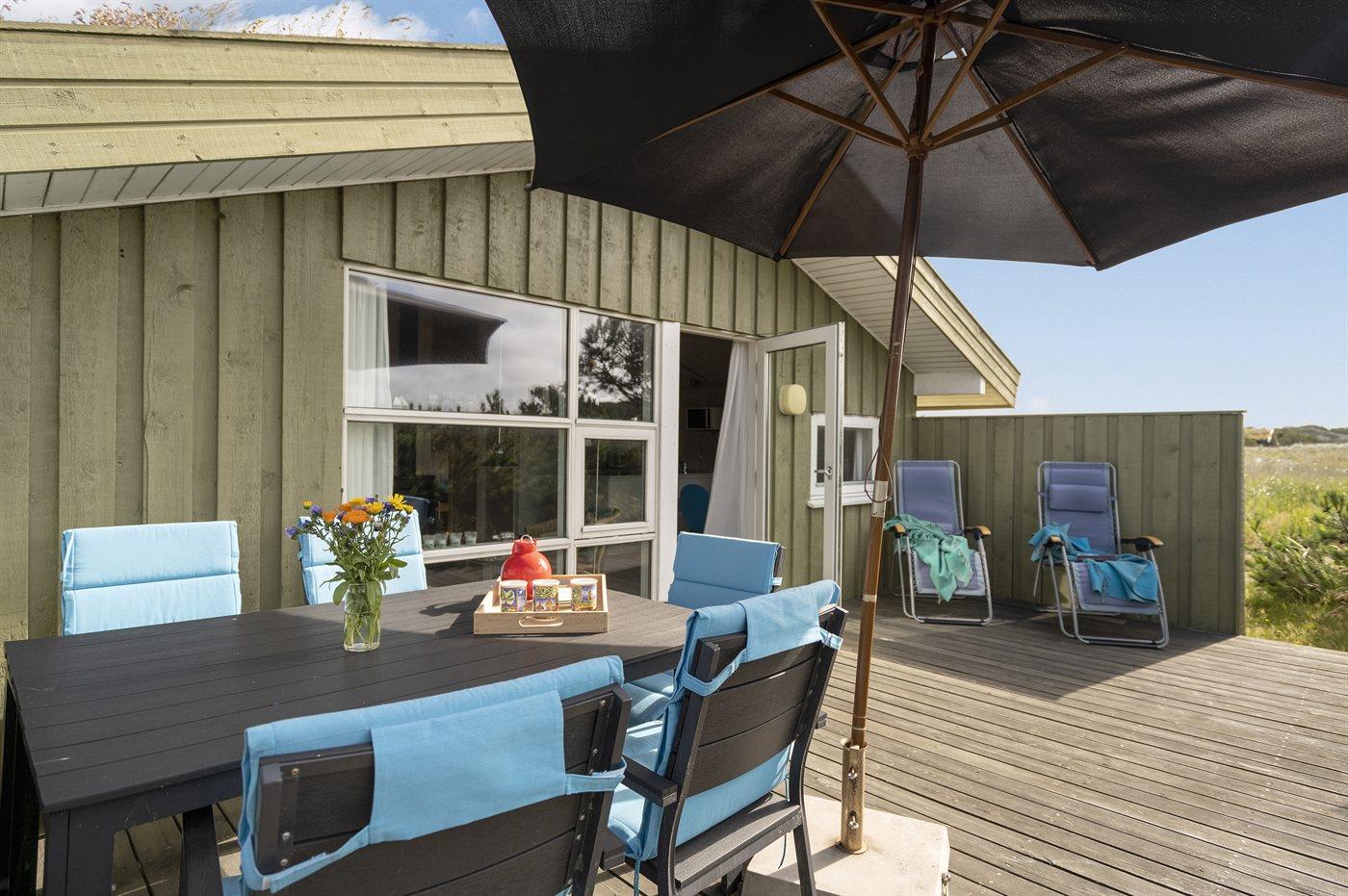 Hyggeligt, lille sommerhus beliggende tilbagetrukket på en kuperet grund i et naturskønt område bag klitterne til stranden og Vesterhavet.