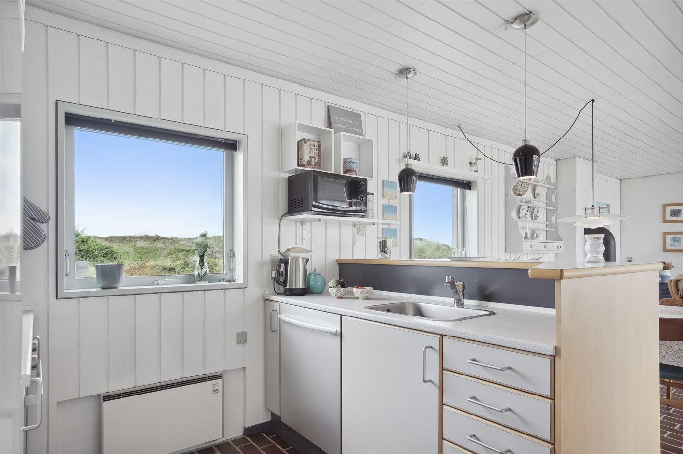 En hyggelig og lyst indrettet feriebolig beliggende i en ferieby lige bag klitterne til stranden og Vesterhavet - i et naturskønt og kuperet område.
