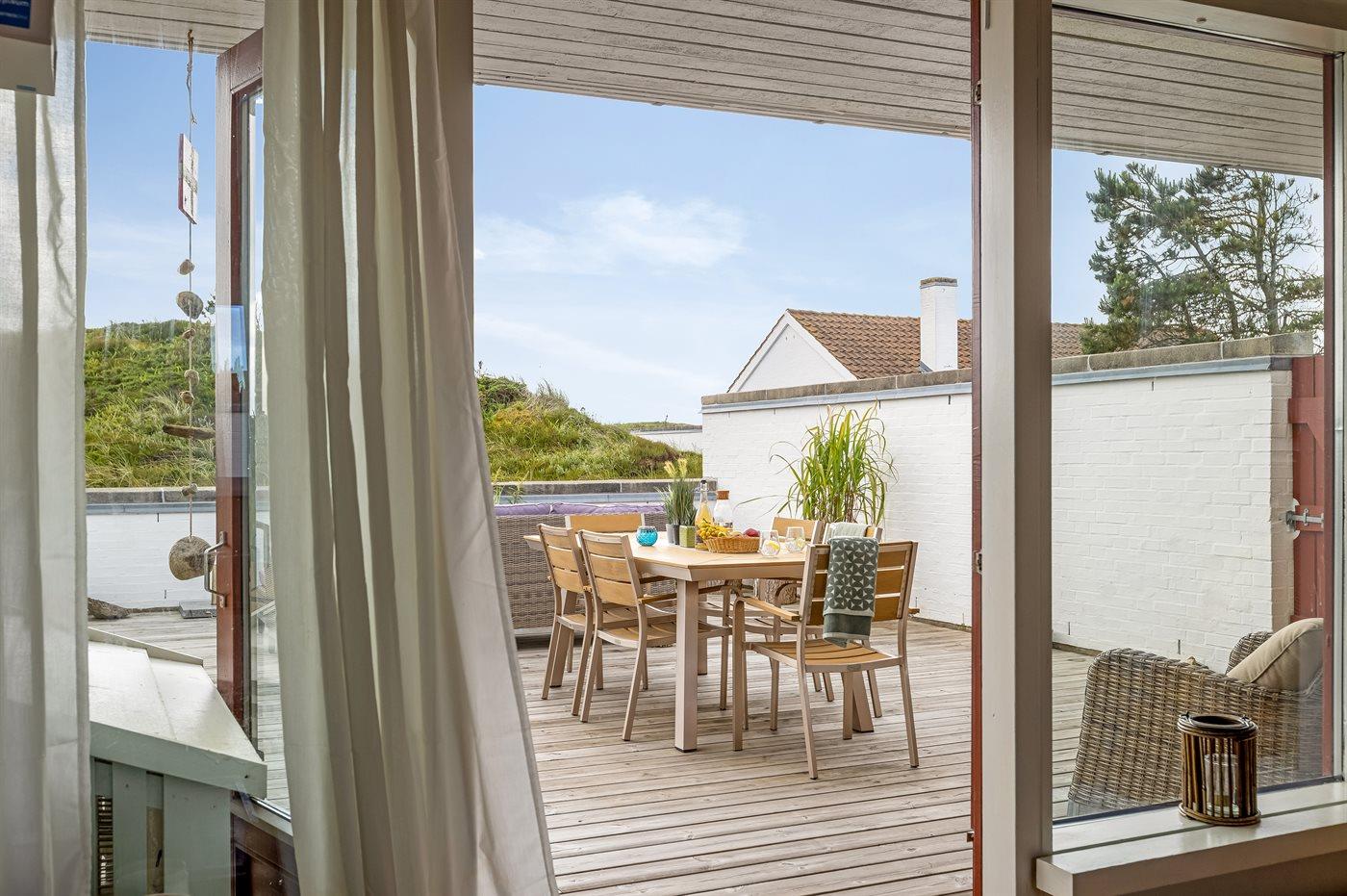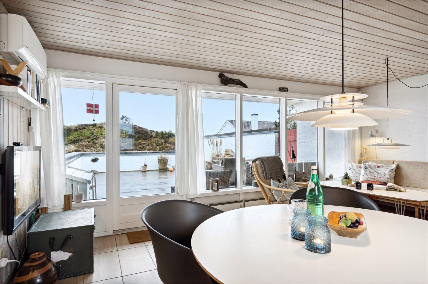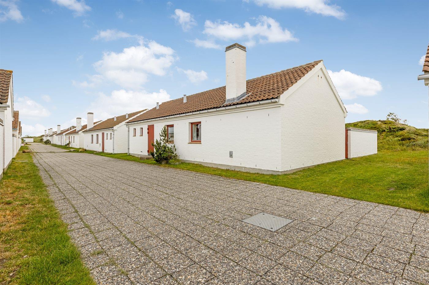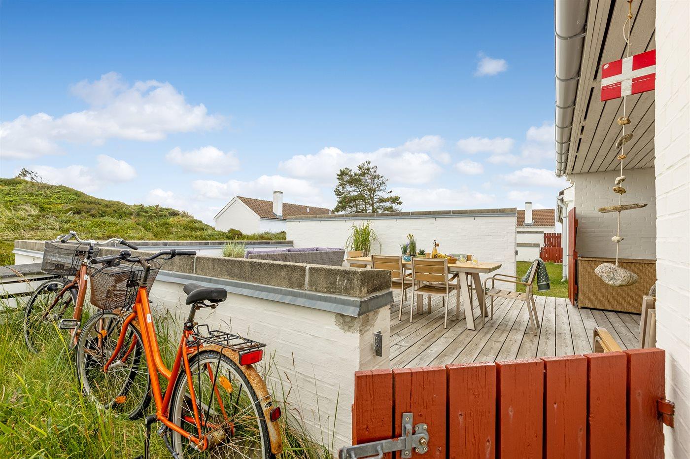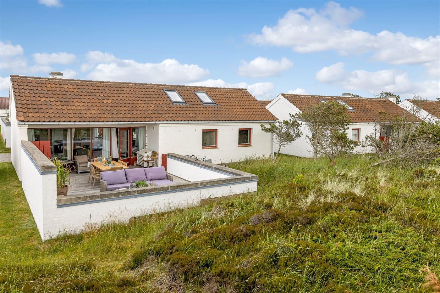 Hyggelig og lyst indrettet feriebolig beliggende i feriebyen lige bag klitterne til stranden og Vesterhavet i et naturskønt og kuperet område.