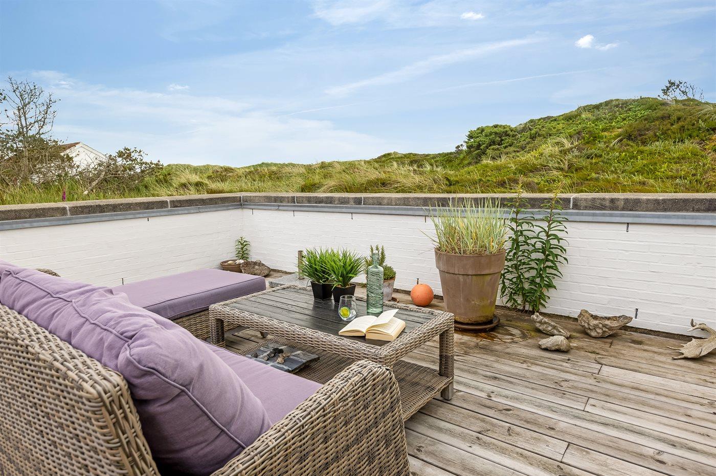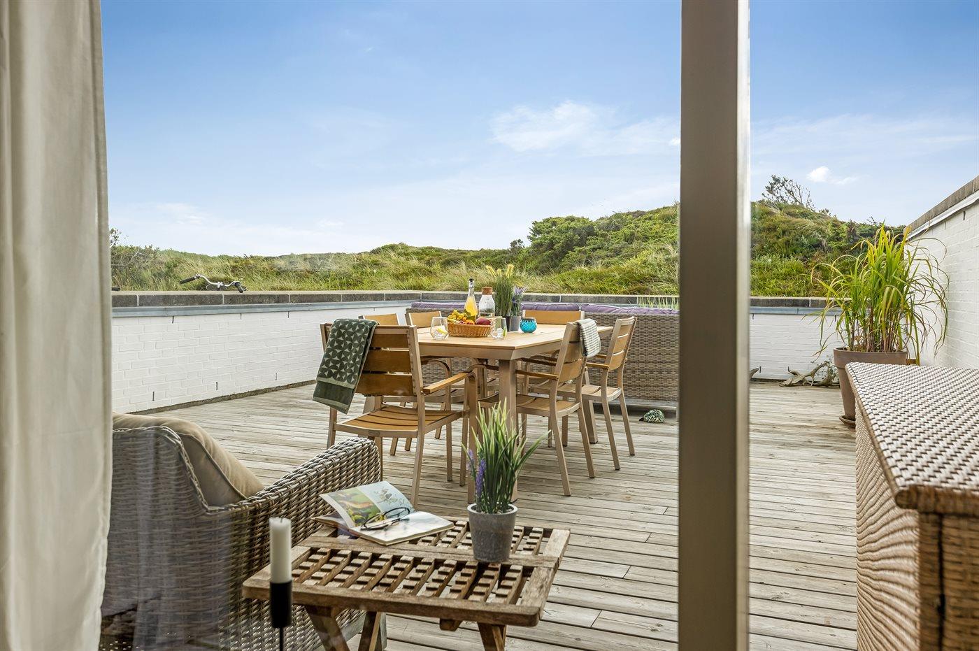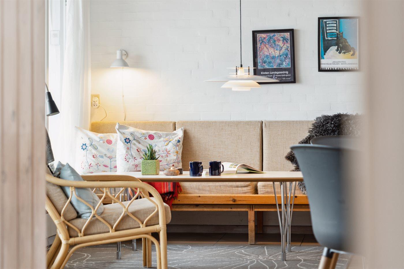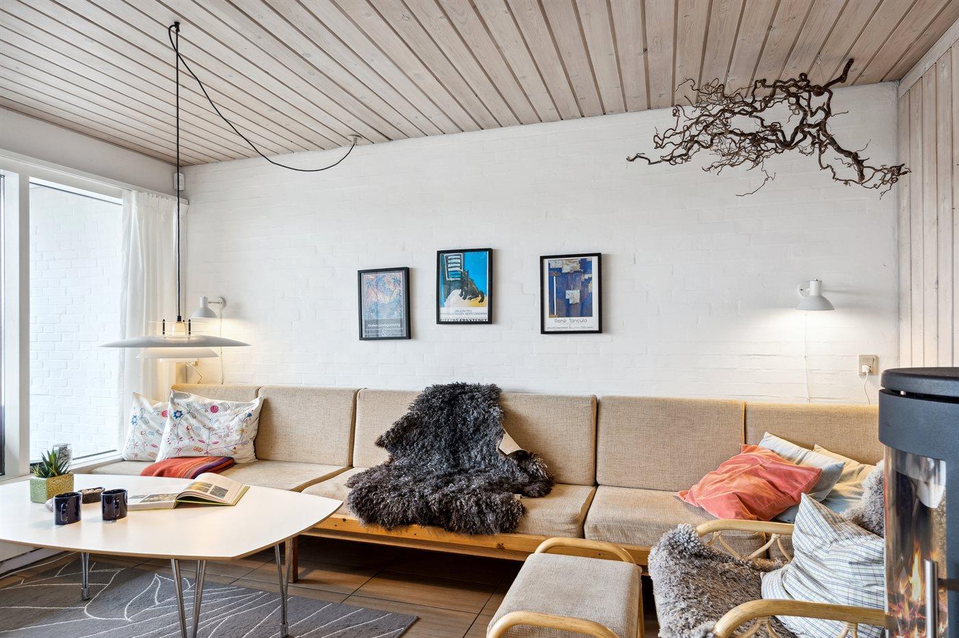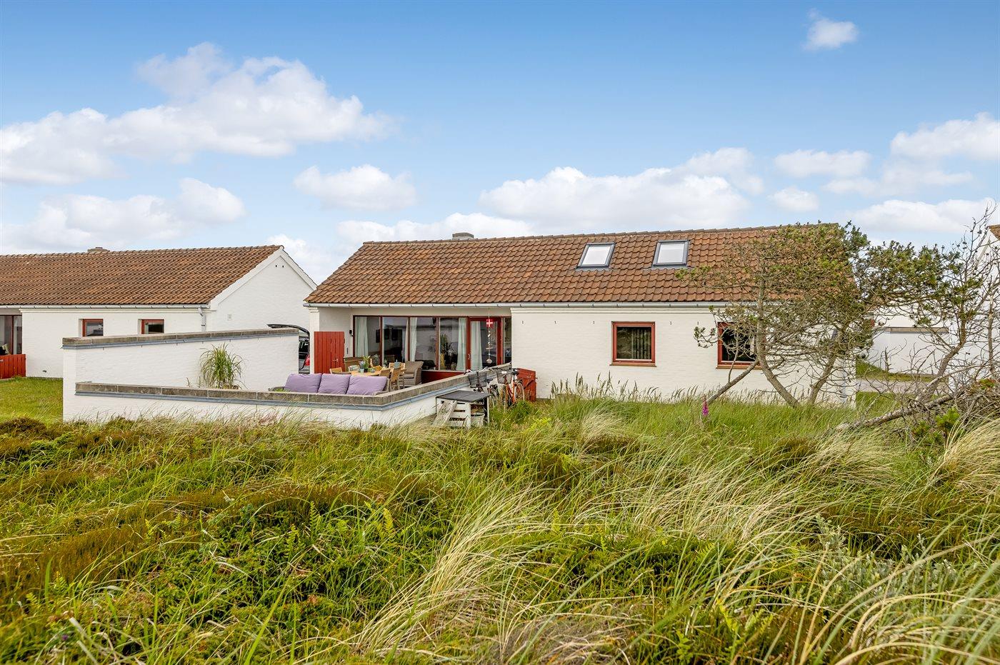 Hyggelig og lyst indrettet feriebolig beliggende i feriebyen lige bag klitterne til stranden og Vesterhavet i et naturskønt og kuperet område.