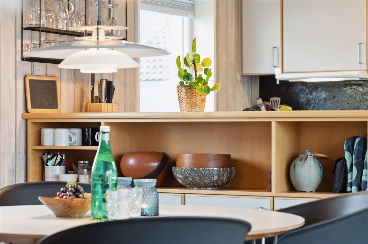 Køkkenet er udstyret med 1 køleskab. Der er 4 keramiske kogeplader, varmluftovn, mikrobølgeovn samt opvaskemaskine.