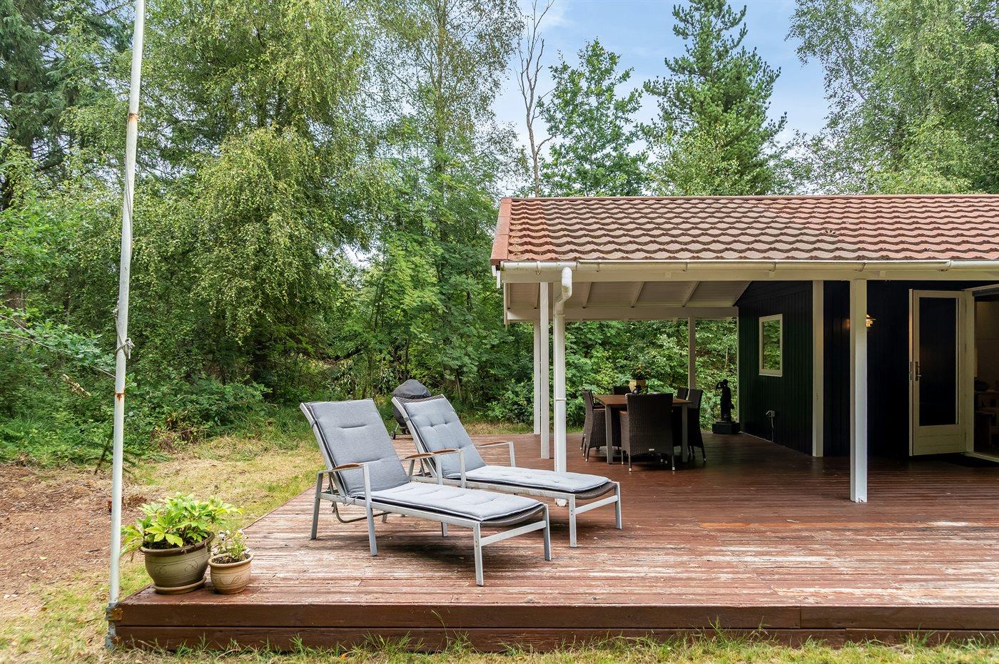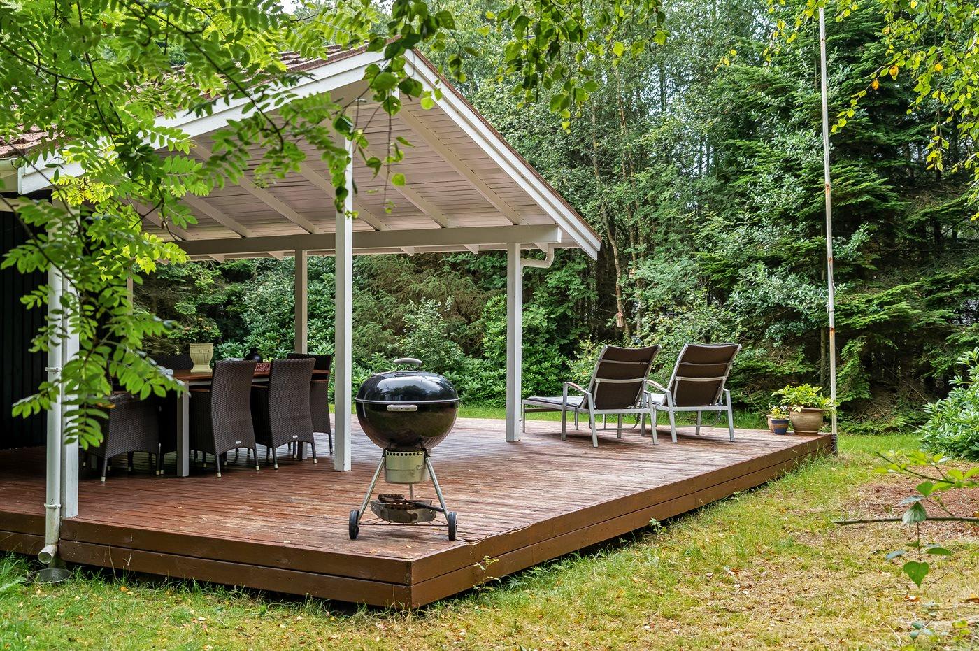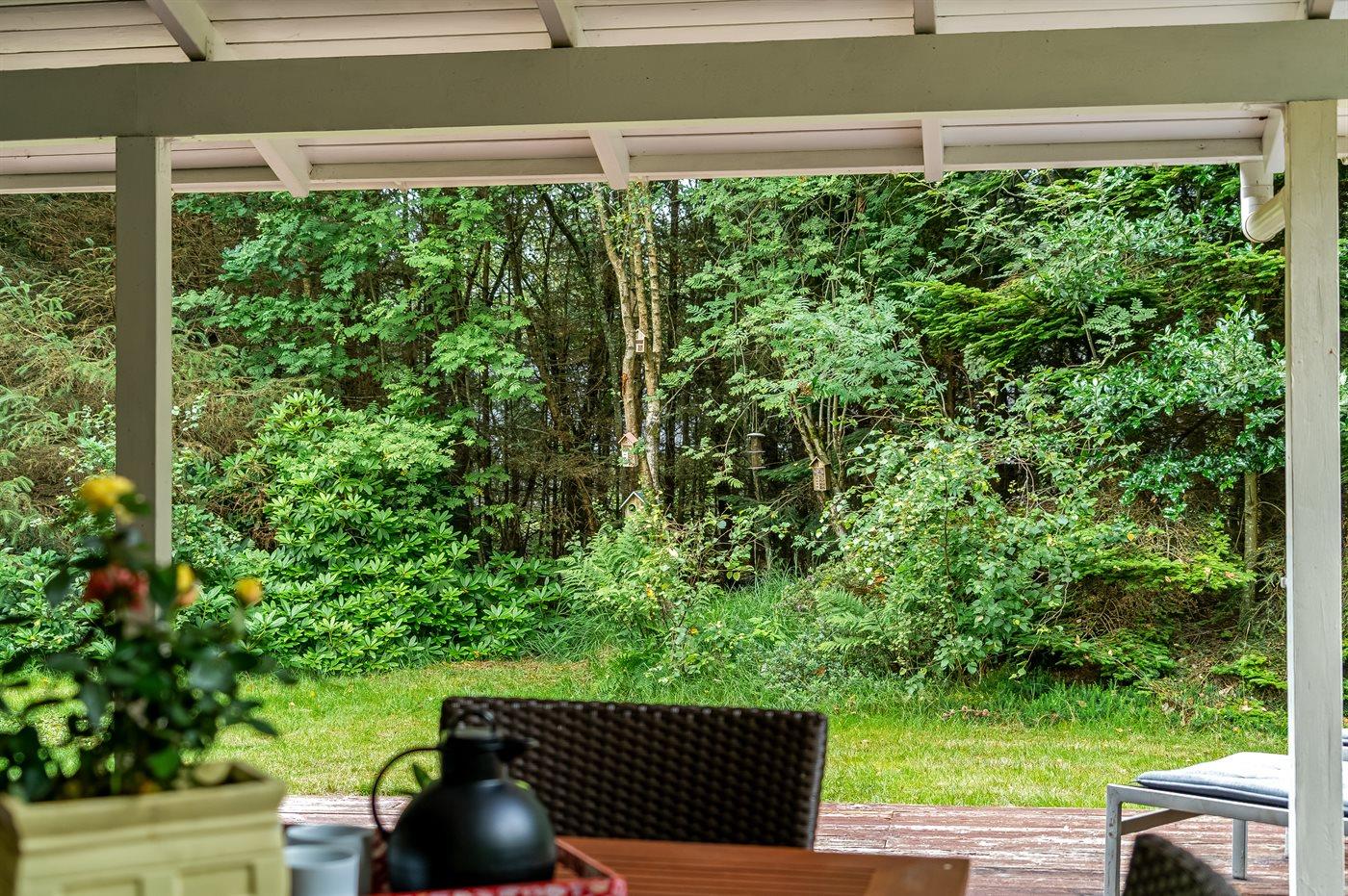 Udenfor kan du nyde livet på den overdækkede terrasse, hvor du er i læ for både sol og vind – perfekt til grillmiddage og lange sommeraftener.