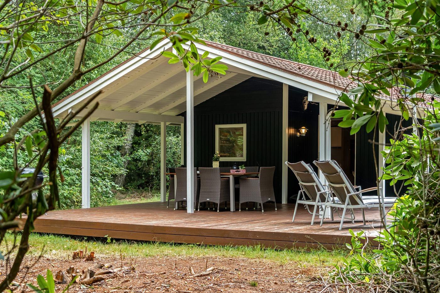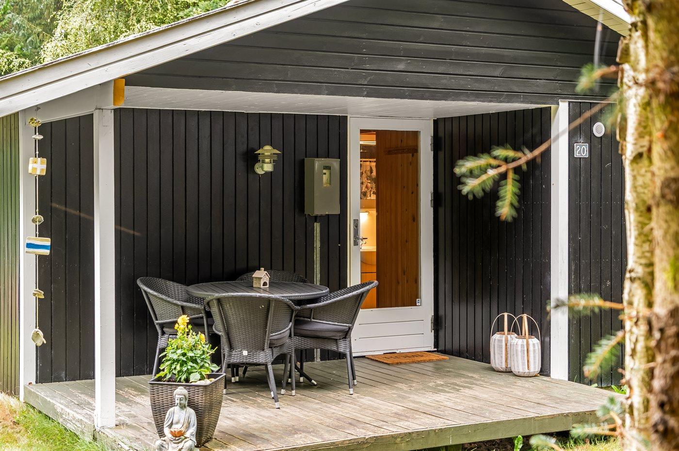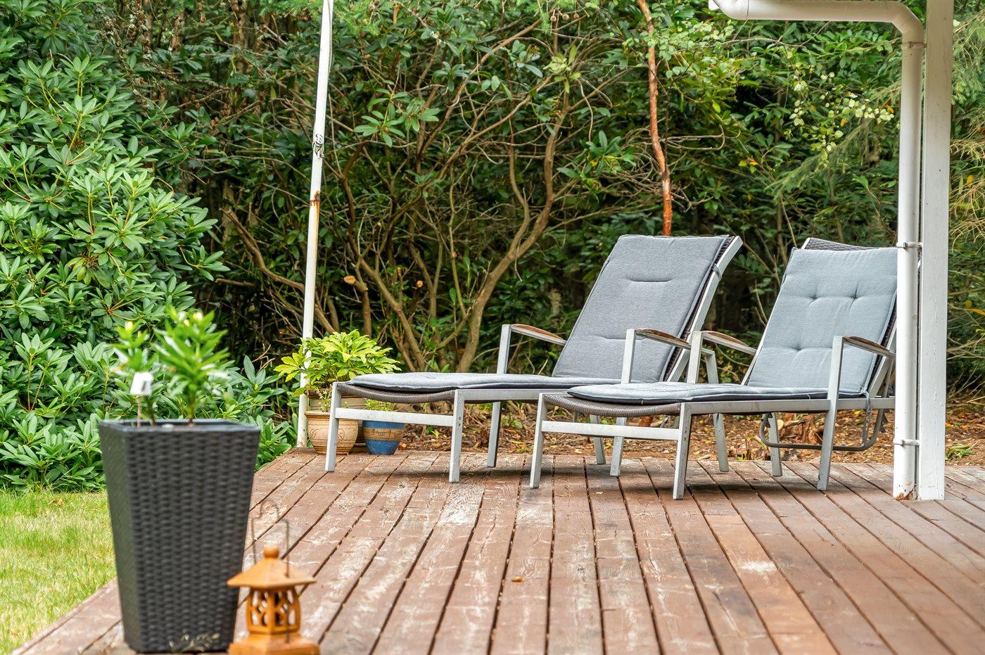 Udenfor kan du nyde livet på den overdækkede terrasse, hvor du er i læ for både sol og vind – perfekt til grillmiddage og lange sommeraftener.
