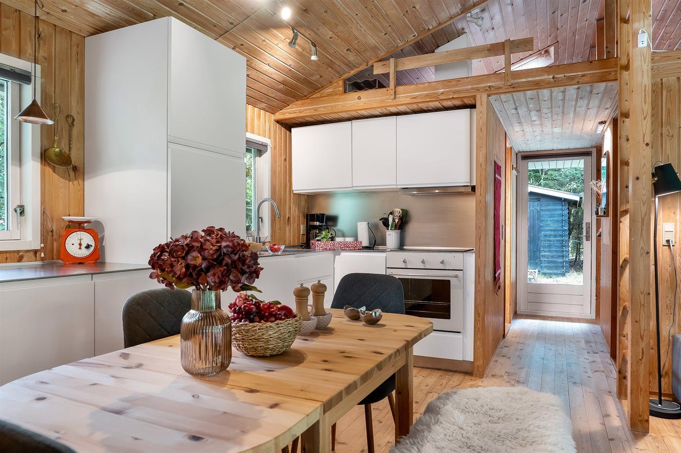 Køkkenet er udstyret med 1 køleskab. Der er 4 induktionskogeplader, miniovn, varmluftovn, mikrobølgeovn samt opvaskemaskine.