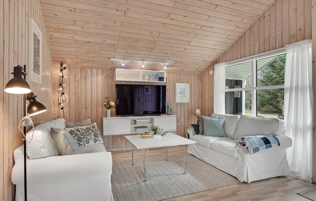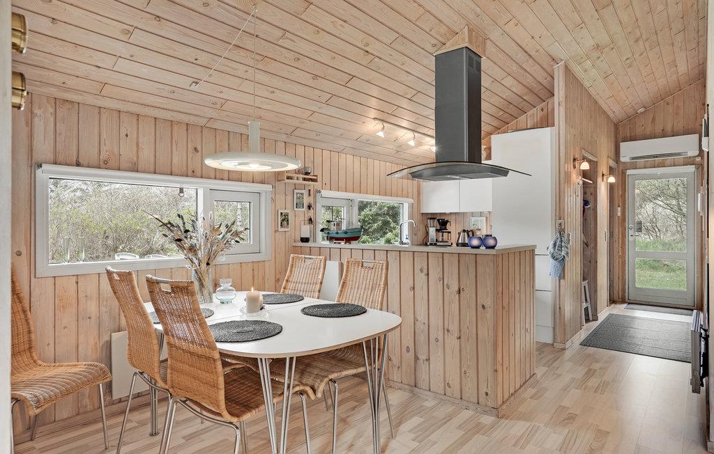 I vil føle jer hjemme, så snart I træder ind i huset. Åbent til kip i kombination med attraktiv indretning og trægulve, vægge- og lofter skaber en rendyrket sommerhusstemning. I det åbne køkken kan nogle af jer tilberede lækre feriemåltider, mens andre flader ud i sofaen foran fjernsynet.