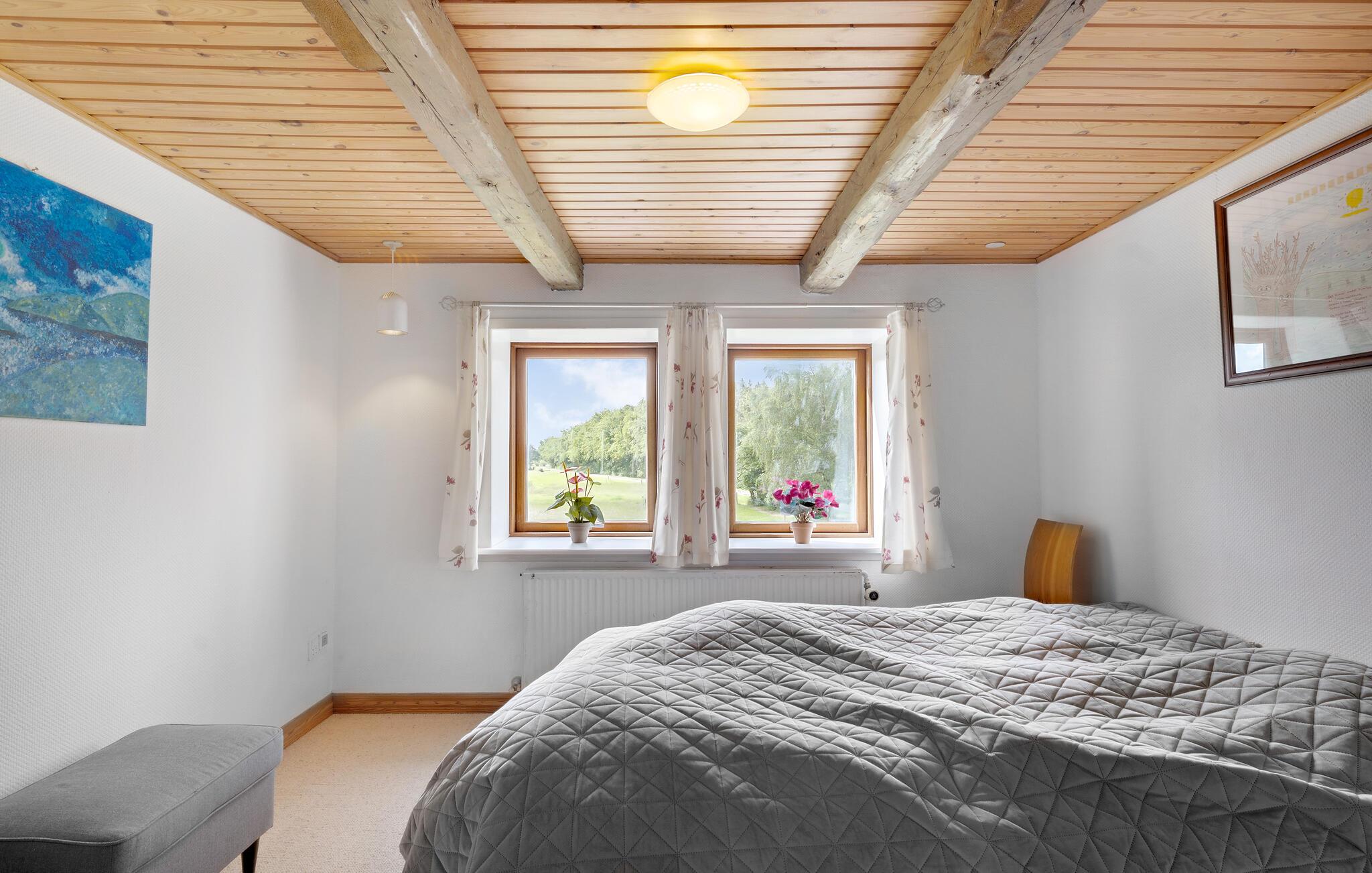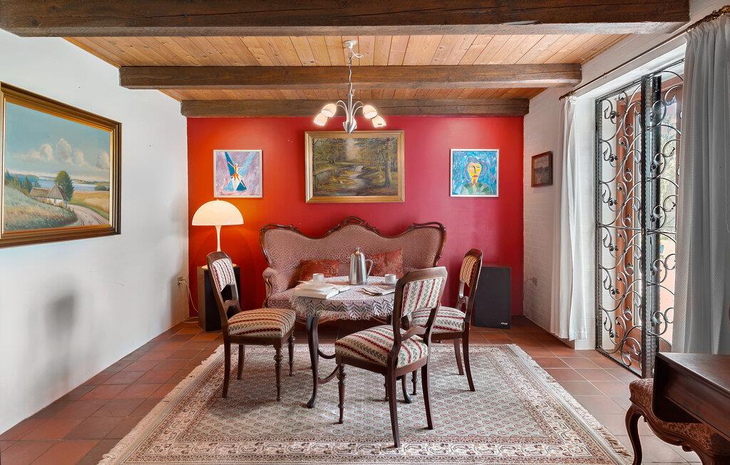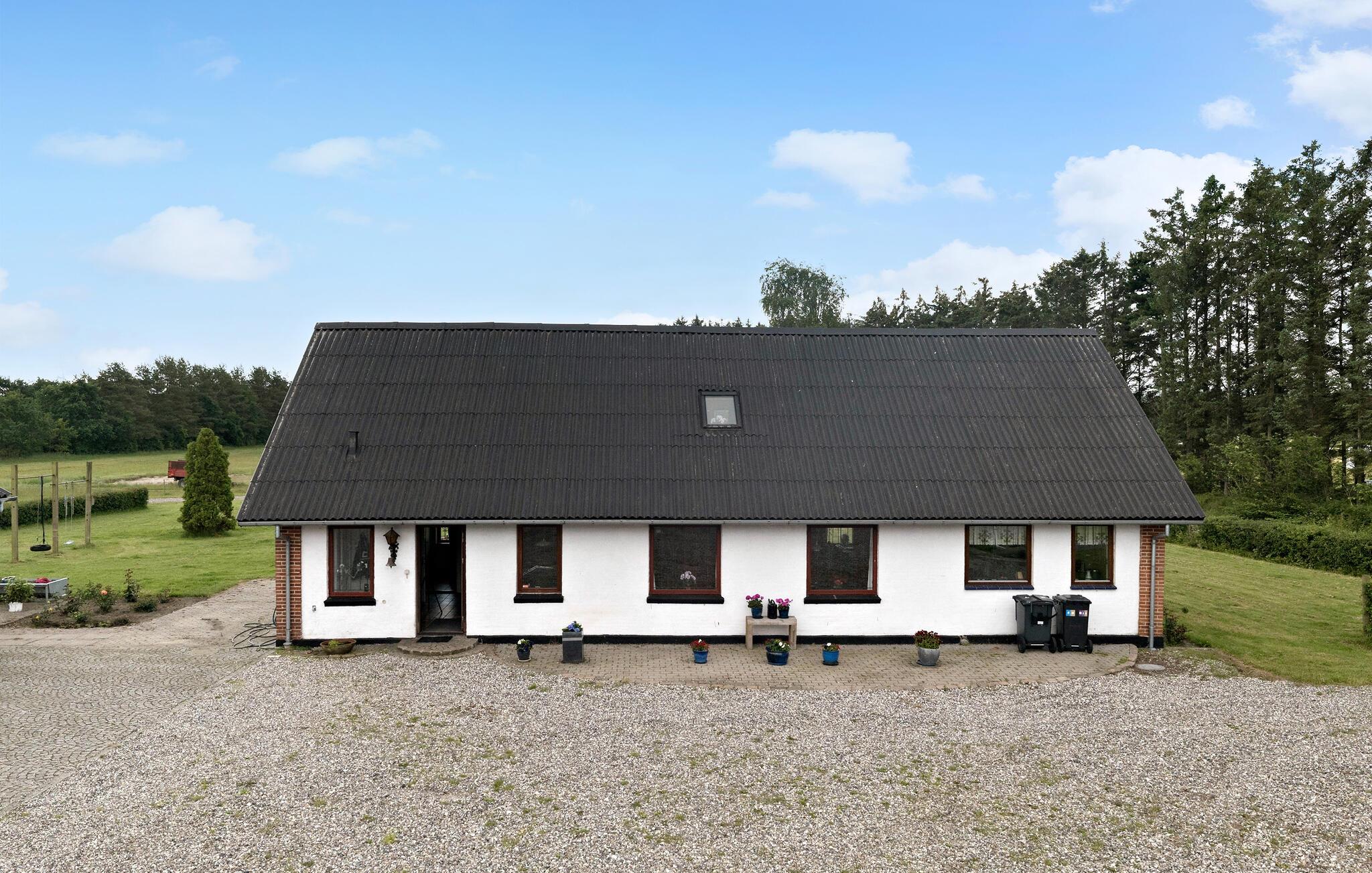 Jeres smukke og rummelige feriehus er en tidligere gård og tilbyder alt, hvad I har brug for til en afslappende og hyggelig ferie. Nyd roen og de naturnære omgivelser, der omkranser dette hus. Start dagen i det veludstyrede køkken, og tilbered en lækker morgenmad. Den rummelige stue er det oplagte sted til afslappende aftener med familien. Her mærker I også husets historie og kan drømme jer tilbage til gamle tider. Hyg jer sammen i de komfortable sofaer, og nyd den varme atmosfære, der blandt andet skabes af de gamle træbjælker i loftet.