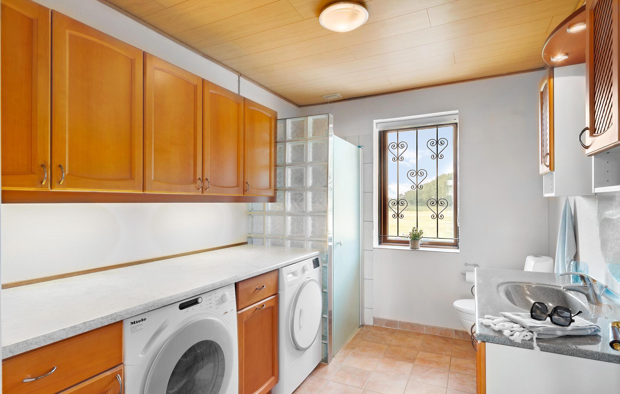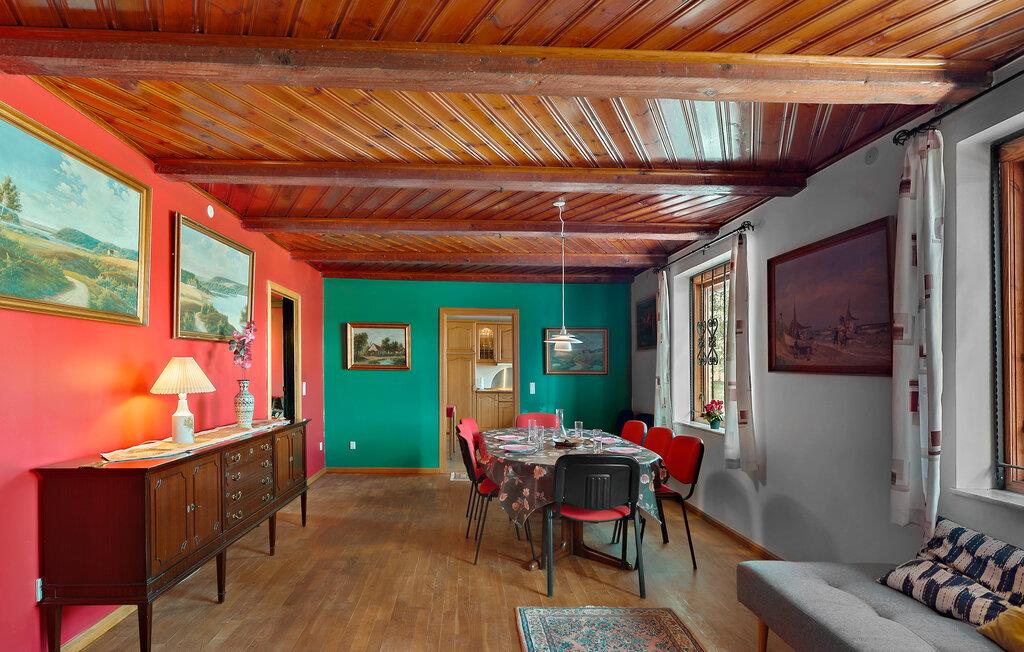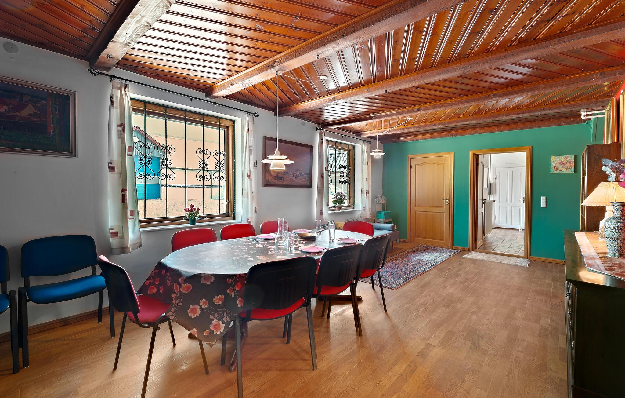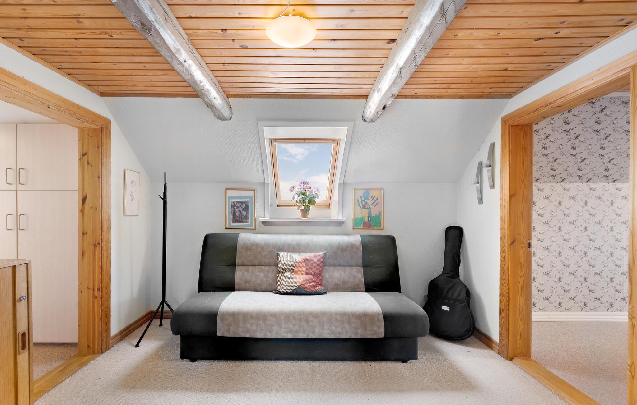 Jeres smukke og rummelige feriehus er en tidligere gård og tilbyder alt, hvad I har brug for til en afslappende og hyggelig ferie. Nyd roen og de naturnære omgivelser, der omkranser dette hus. Start dagen i det veludstyrede køkken, og tilbered en lækker morgenmad. Den rummelige stue er det oplagte sted til afslappende aftener med familien. Her mærker I også husets historie og kan drømme jer tilbage til gamle tider. Hyg jer sammen i de komfortable sofaer, og nyd den varme atmosfære, der blandt andet skabes af de gamle træbjælker i loftet.