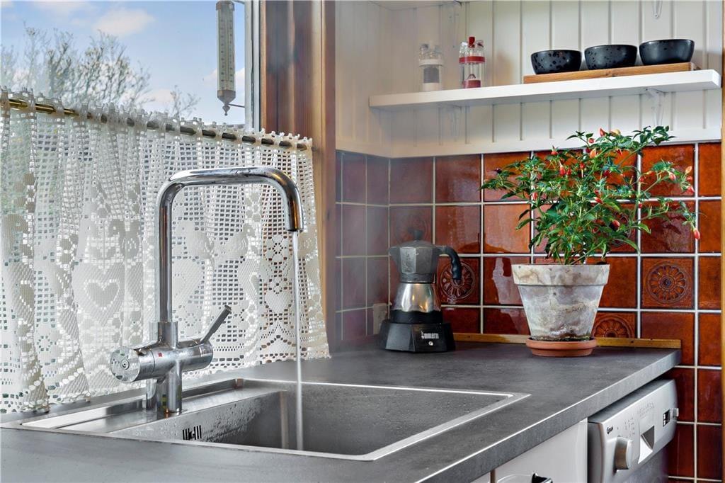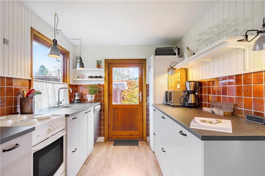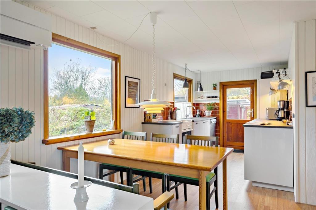 Stue/køkken ud i et. I køkkenet er der bl.a. quooker, komfur, køleskab, fryser, mikroovn, opvaskemaskine, samt alt øvrigt service og køkkengrej. Spiseplads i åben forbindelse med stuen. Fra køkkenet er der udgang til terrassen.