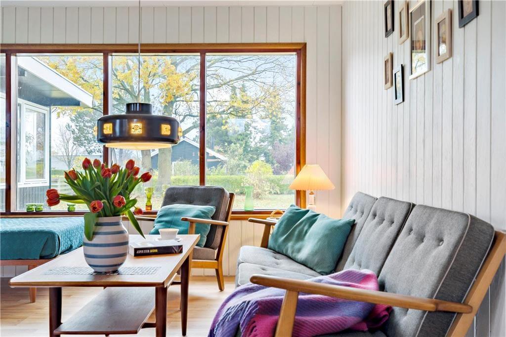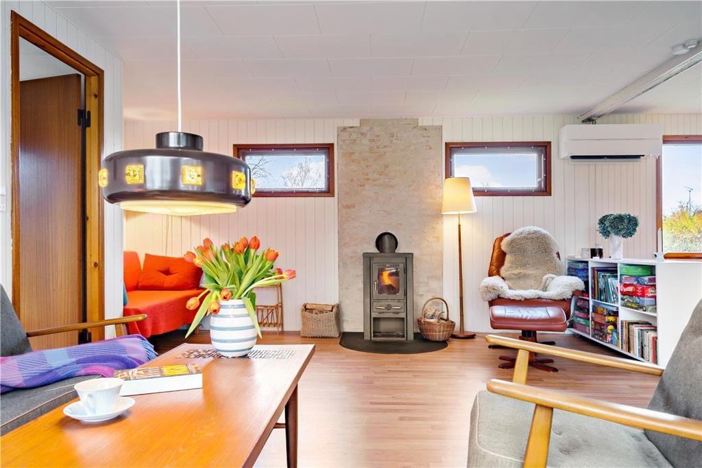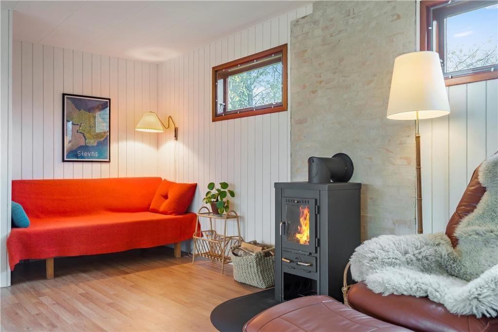 Stuen er hyggelig møbleret med brændeovn og sofahjørne. Tv og internet.