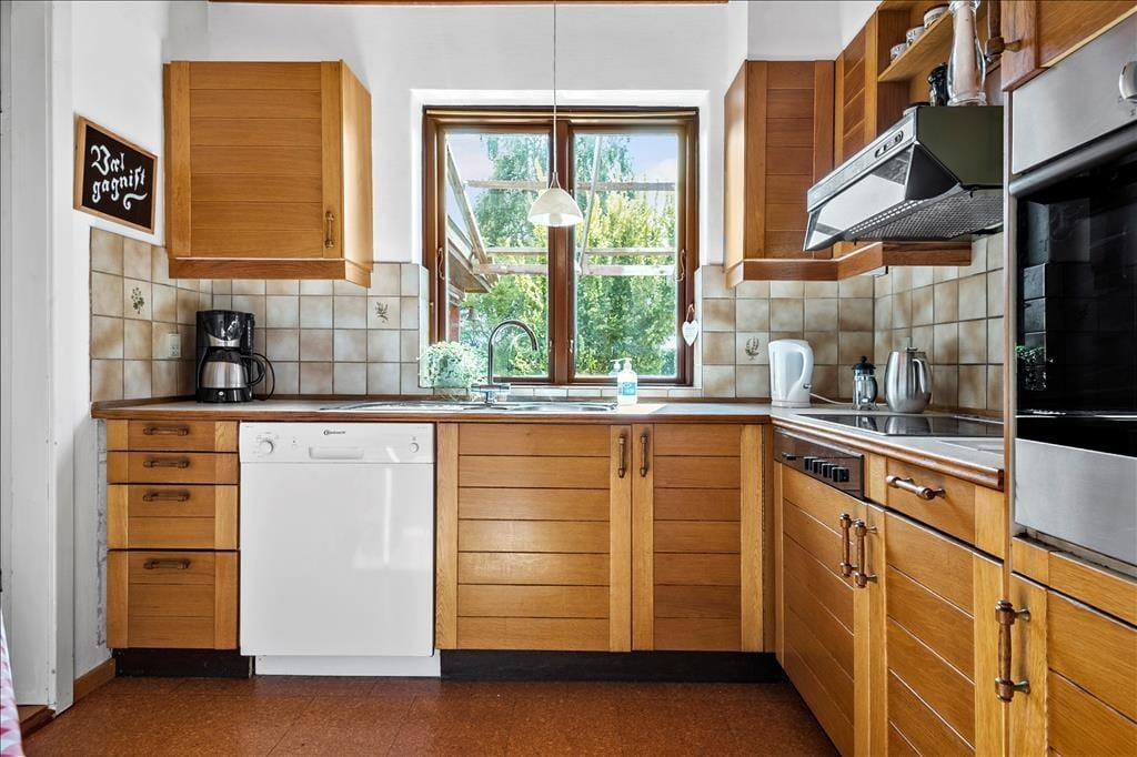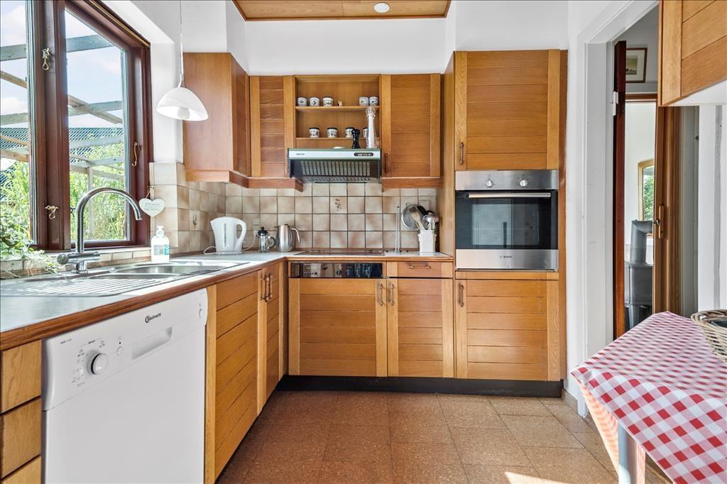 Køkken med 4 kogeplader, emhætte, ovn, opvaskemaskine, elkedel, kaffemaskine, samt alt service og køkkengrej.