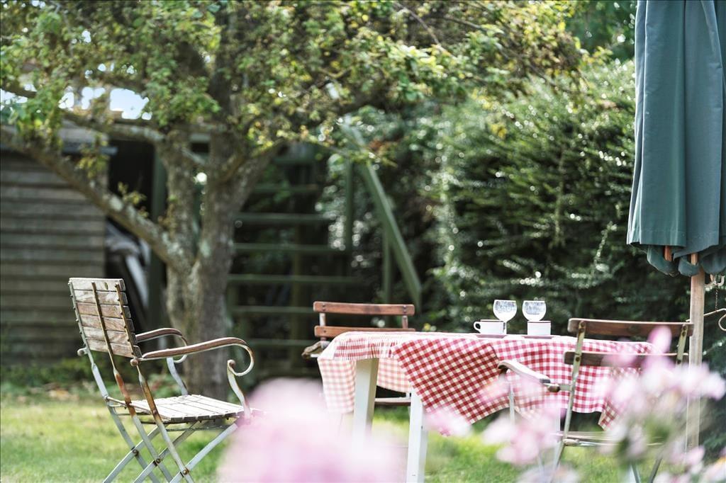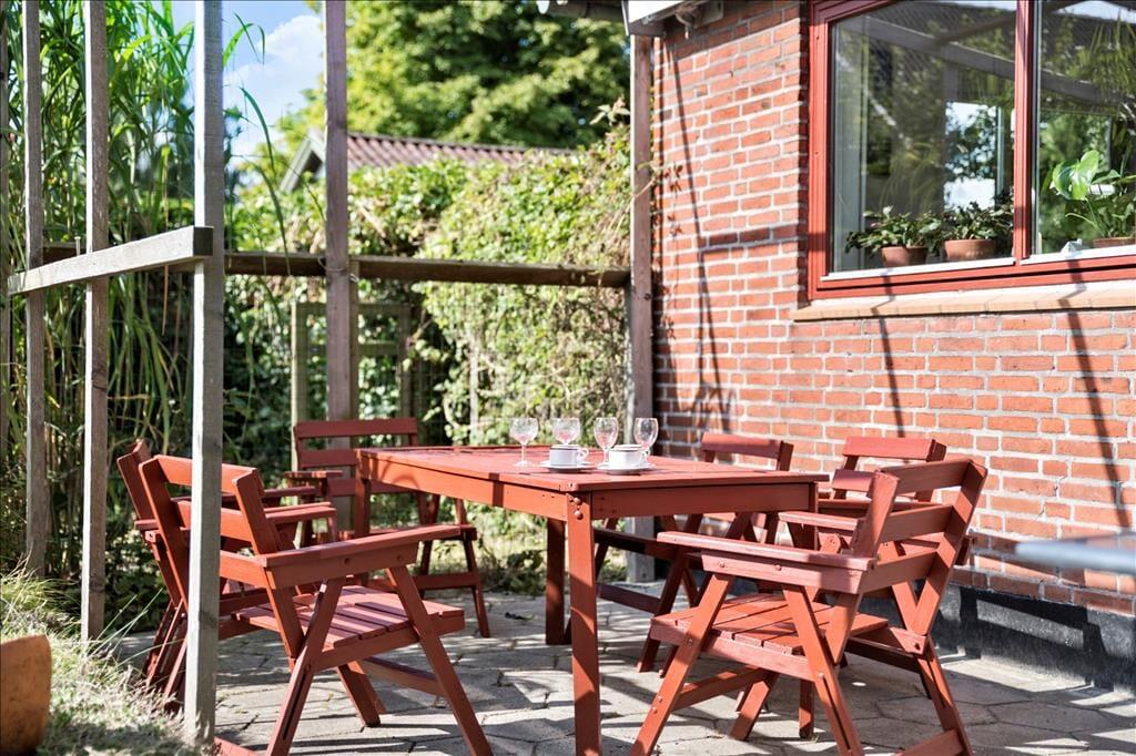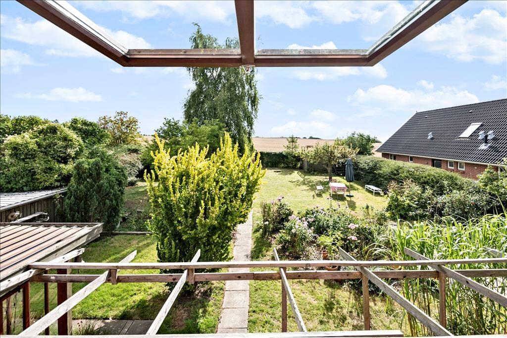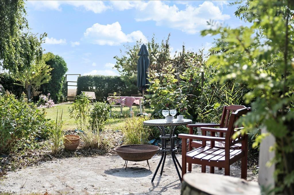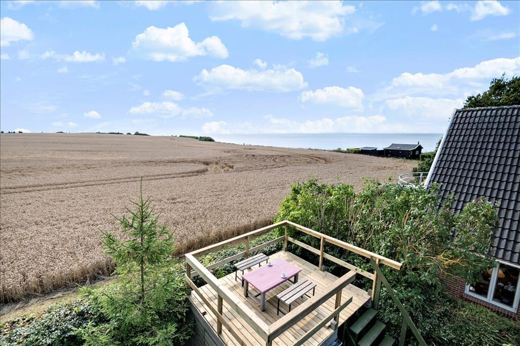 I haven er der en terrasse man kan gå op på, hvorfra der er den skønneste udsigt over bugten til Møns Klint.