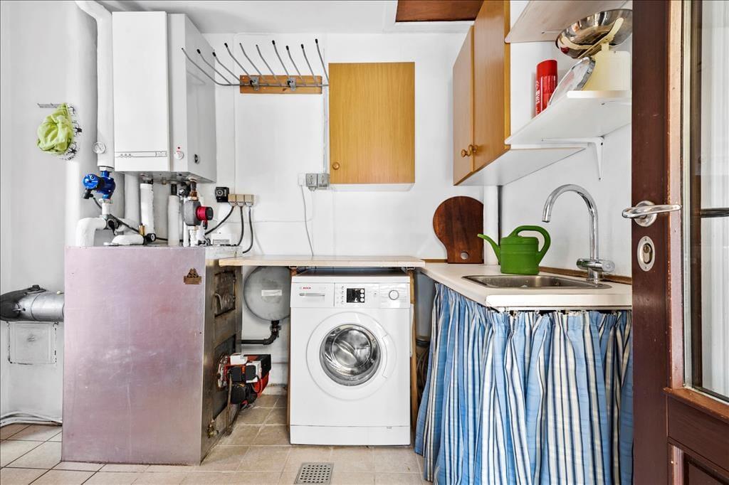 Bryggers med vaskemaskine, stort køleskab og mikroovn.