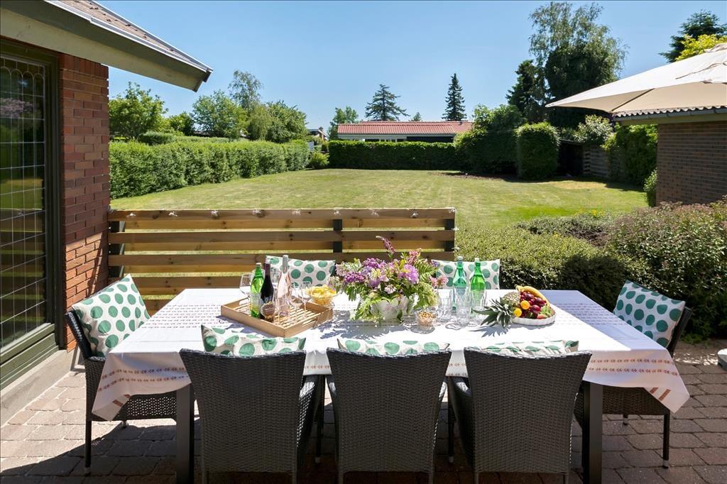 Køkkenet indeholder: Elkomfur med 4 kogeplader og ovn, emhætte, køleskab, fryser, opvaskemaskine, kaffemaskine, elkedel, samt alt øvrigt service og køkkengrej.