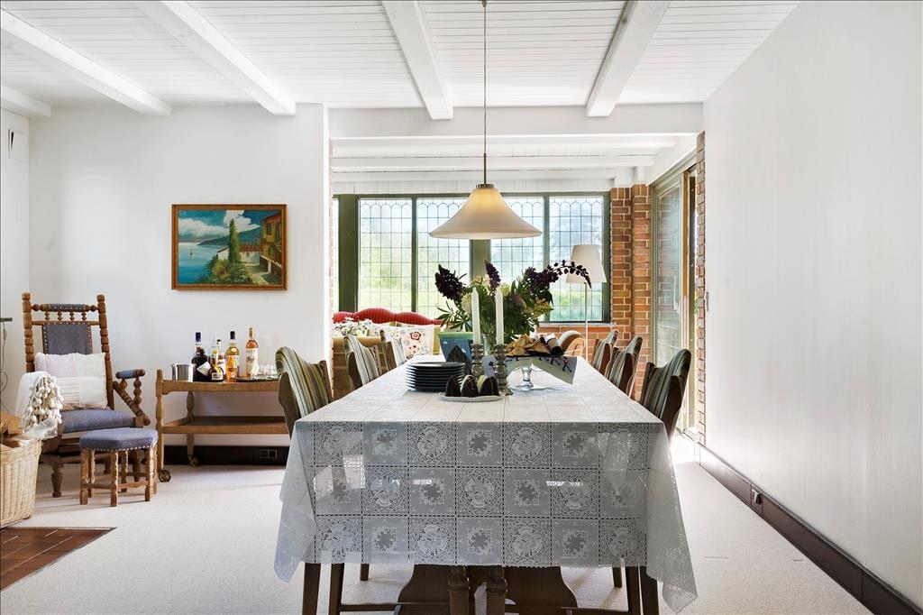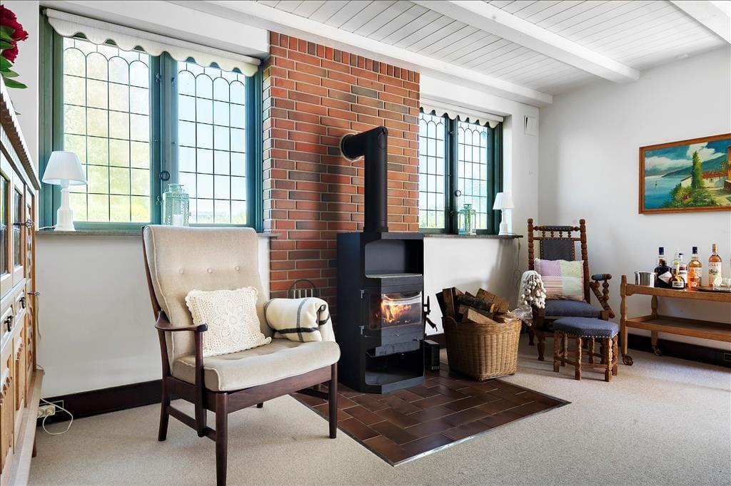 Stue med brændeovn, sofahjørne og spiseplads. TV & internet. Fra stuen er der udgang til terrassen.