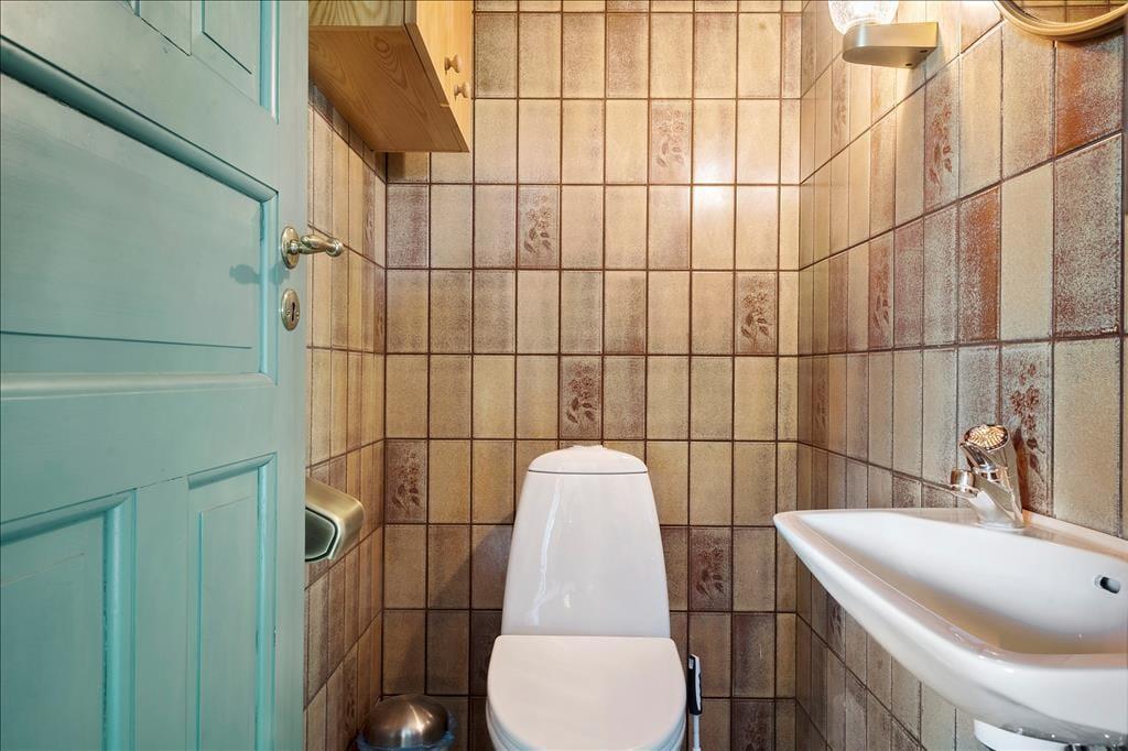 1 stort flot badeværelse med bruseniche, toilet og håndvask.