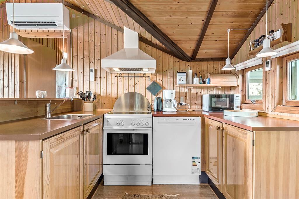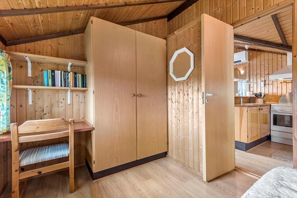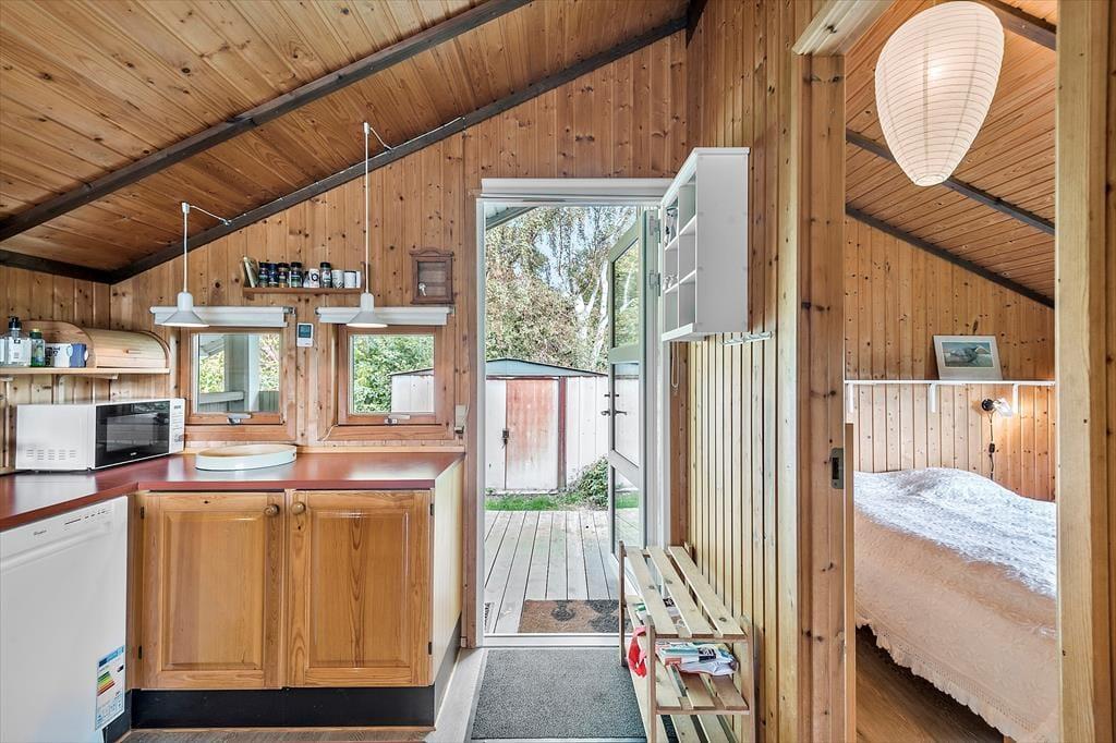 Fuldt udstyret køkken med bl.a. køle / svaleskab. Åben forbindelse til lys og dejlig stue med spisekrog og alkove med dobbeltseng. Badeværelse med brusekabine. 2 soveværelser . 1 Dobbeltseng, 1Dobbeltseng Delvis overdækket sydvendt terrasse med havemøbler og grill. Stor hyggelig have havkik