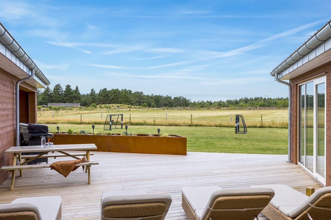 Udenfor er der masser af plads til leg og afslapning. Den store grund er perfekt til børnene og de firbenede i familien - her finder I både et legetårn, volleyballnet og fodboldmål, hvor man kan udfolde sig og have det sjovt – hvad enten man er til det ene eller det andet. Mellem pool-området og aktivitetsrummet ligger en stor sydvendt terrasse med mulighed for komme ud fra både aktivitetsrum, køkken-alrum samt pool-område. Den overdækkede terrasse giver mulighed for at sidde i læ og nyde middagen eller en god samtale, selv når vejret ikke er helt med os. Derudover står der en gasgrill på terrassen, så der kan blive grillet. På den store gårdsplads er der god plads til parkering af flere biler, her er der installeret type 2 stik til opladning af elbil.