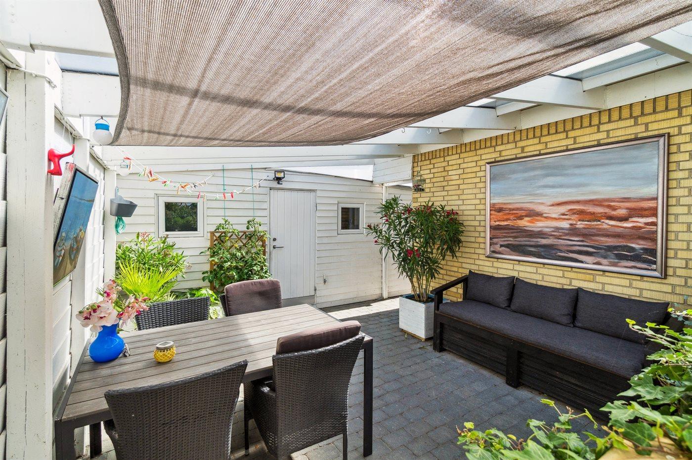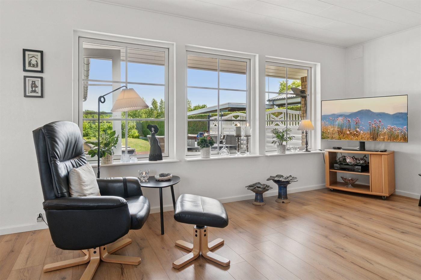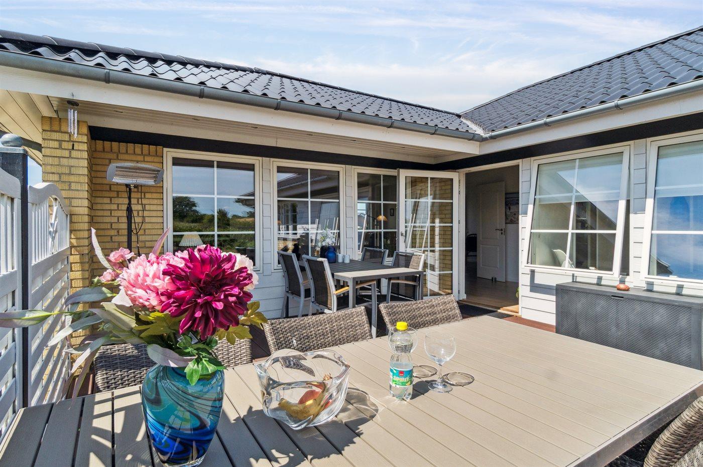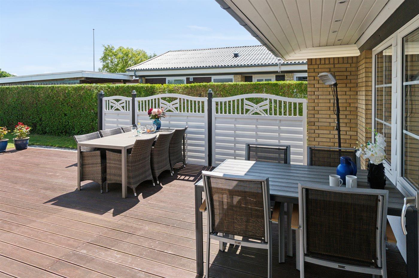 Den store velplejede grund indbyder til afslapning og på træterrassen eller den overdækkede terrasse kan man nyde frokosten eller en god kop kaffe i det fri. Den store stue er præget af det lyse interiør og den behagelige møblering. Køkkenet byder på alle de nødvendige faciliteter, man har brug for når feriemåltiderne skal tilberedes og fremstår velfungerende. Der findes et moderne badeværelse samt et gæstetoilet.