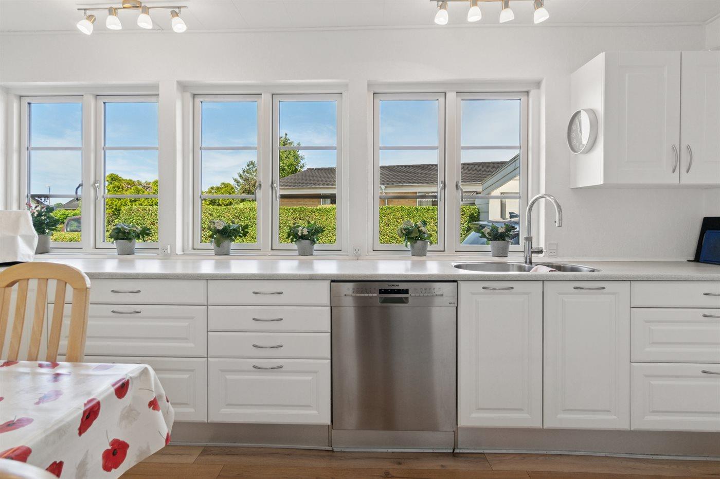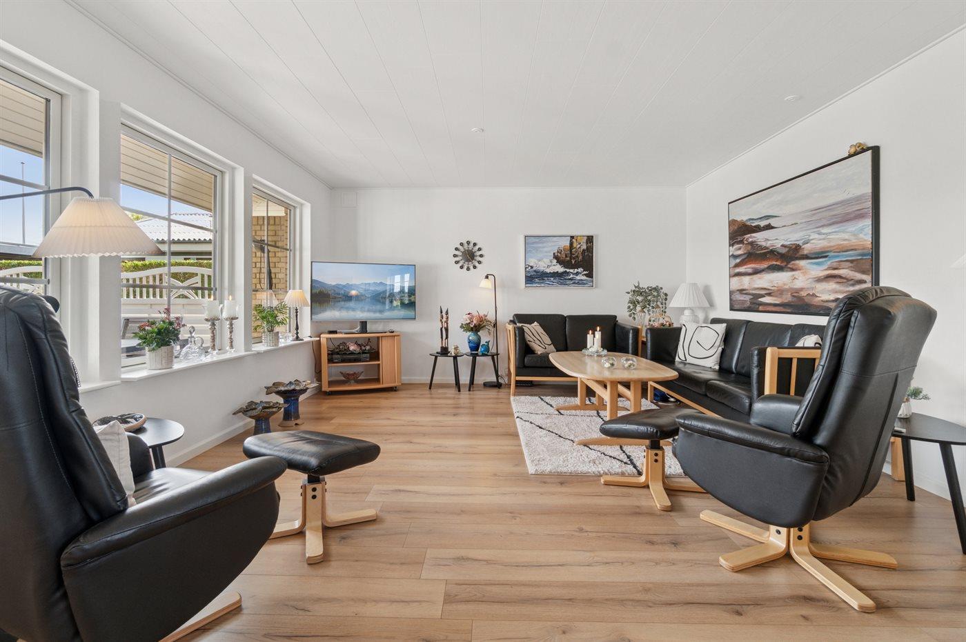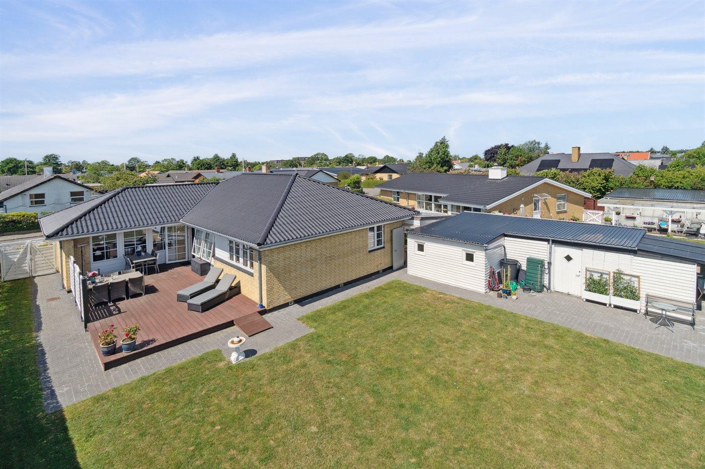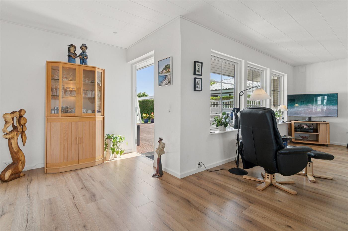 Den store velplejede grund indbyder til afslapning og på træterrassen eller den overdækkede terrasse kan man nyde frokosten eller en god kop kaffe i det fri. Den store stue er præget af det lyse interiør og den behagelige møblering. Køkkenet byder på alle de nødvendige faciliteter, man har brug for når feriemåltiderne skal tilberedes og fremstår velfungerende. Der findes et moderne badeværelse samt et gæstetoilet.