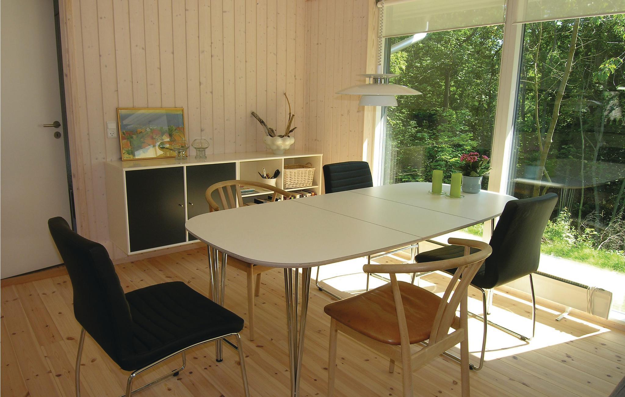 Huset består af et åbent køkken, kombineret spise- og opholdsstue med udgang til træterrasse, hvor man kan sidde og grille og hygge sig med et glas vin på lune sommeraftener. Boligen er velegnet til en ferie uanset årstid, og skulle I komme til at fryse, kan I tænde op i brændeovnen og nyde den hyggelige stemning. Stilen er lys og klassisk, så I får gode rammer til at slappe af efter en lang dag på farten.