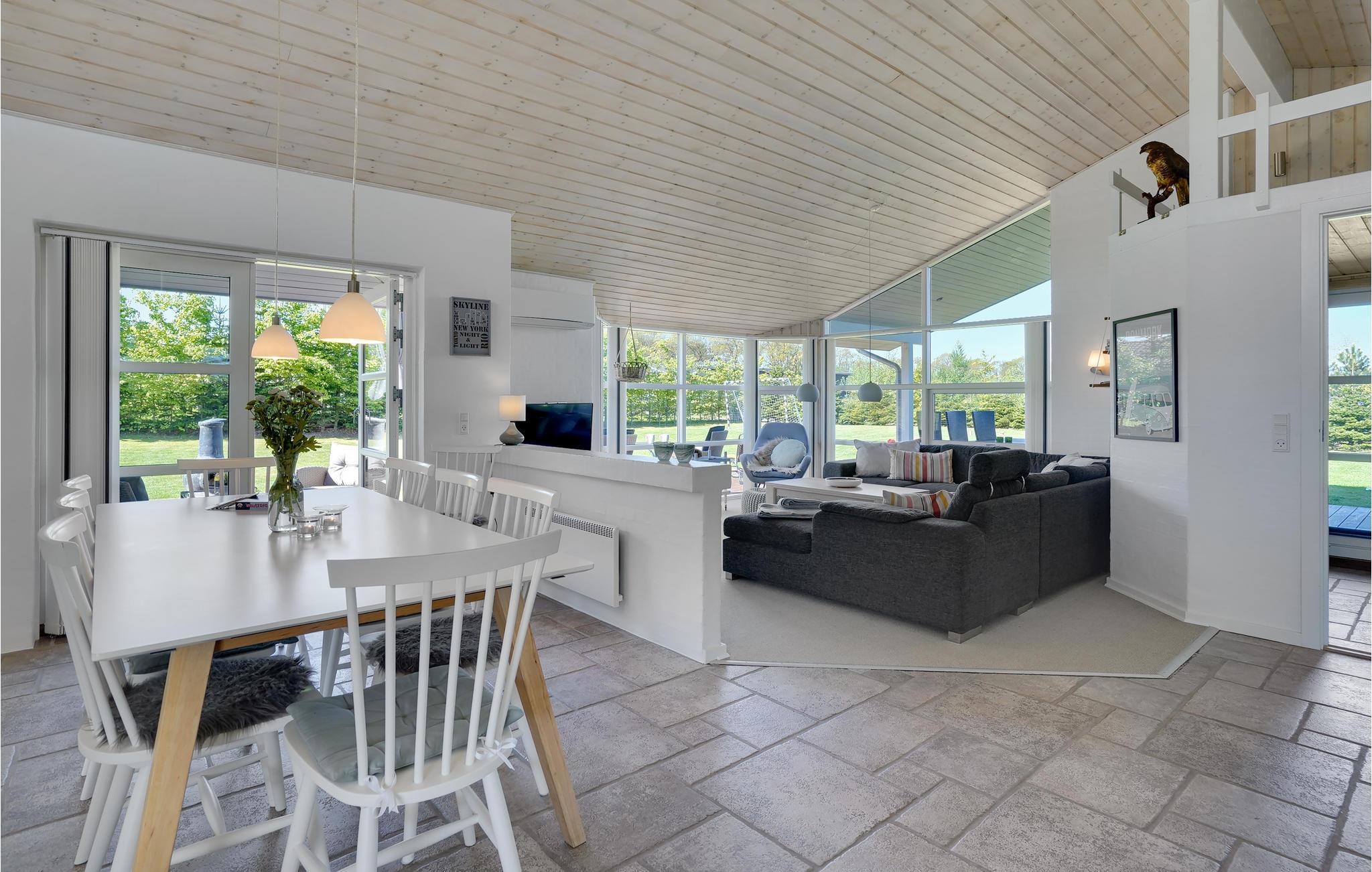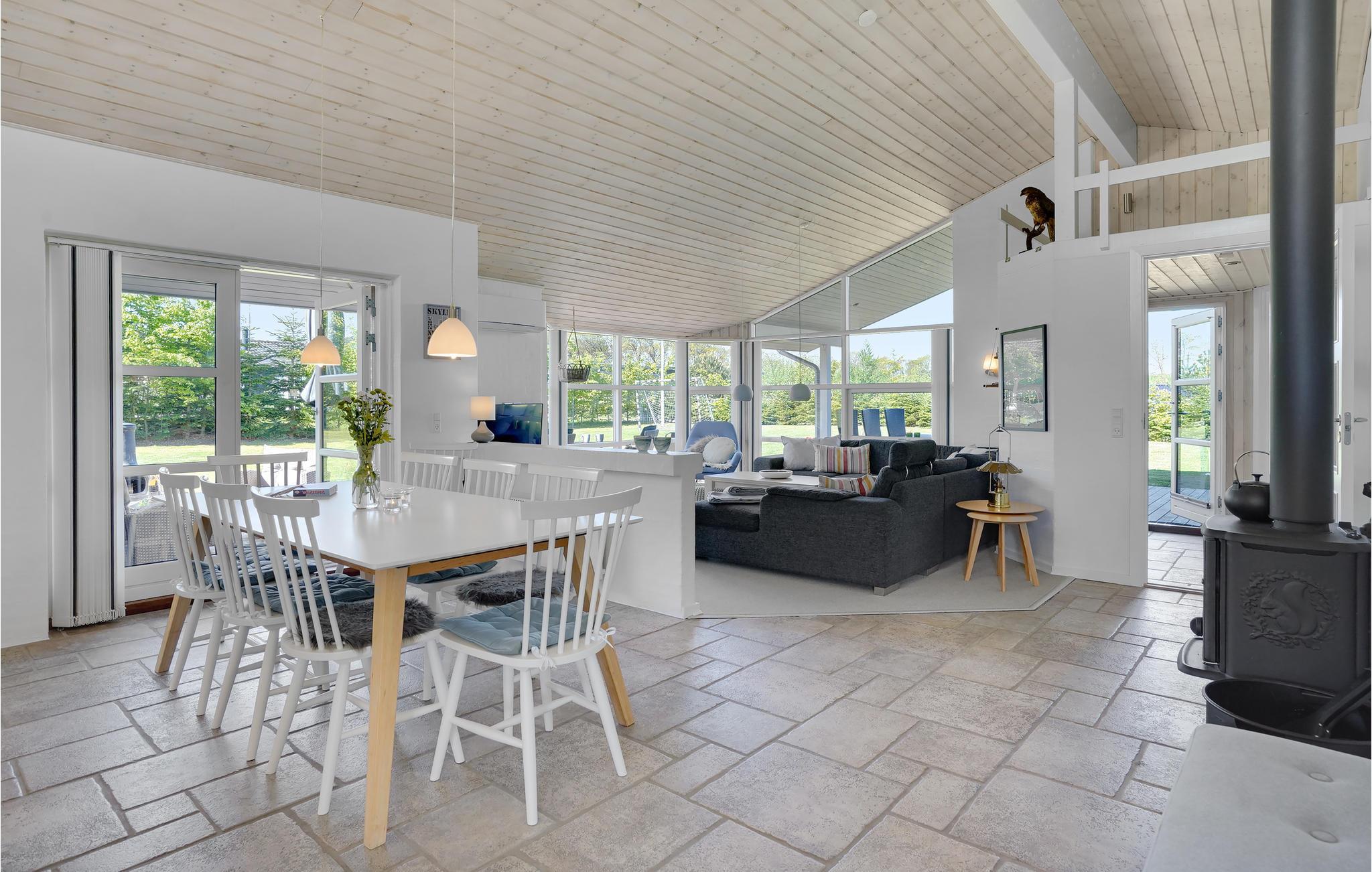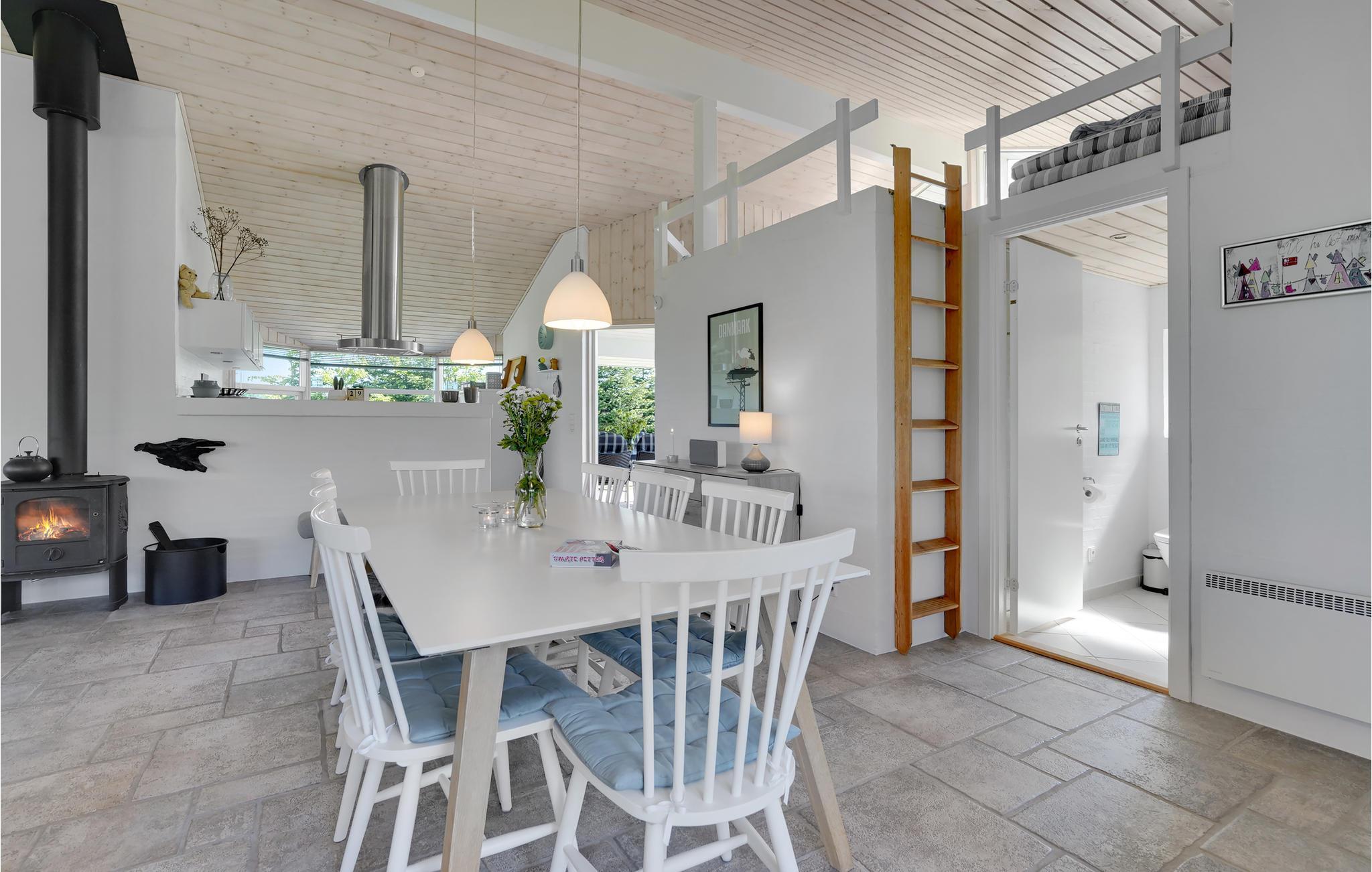 Huset har varmepumpe og er indrettet med stor stue i åben forbindelse med fuldt udstyret køkken (med bl.a. vinkøler), tre gode soveværelser samt stor hems med vinduer, hvor der er to sovepladser. Perfekt til de lidt større børn, som både kan være lidt sig selv og stadig følge med i, hvad den øvrige familie foretager sig. Der er stort badeværelse med spabad og brusehjørne, derudover monteret med vaskemaskine. Et mindre badeværelse med brusebad.