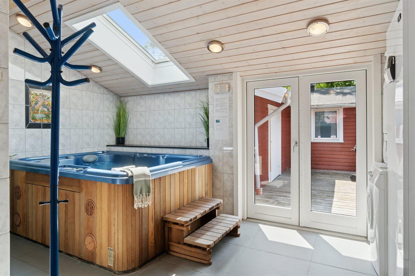 Der er 2 badeværelser med bruseniche og 3 toiletter, heraf 1 gæstetoilet I saunaen er der mulighed for afslapning.