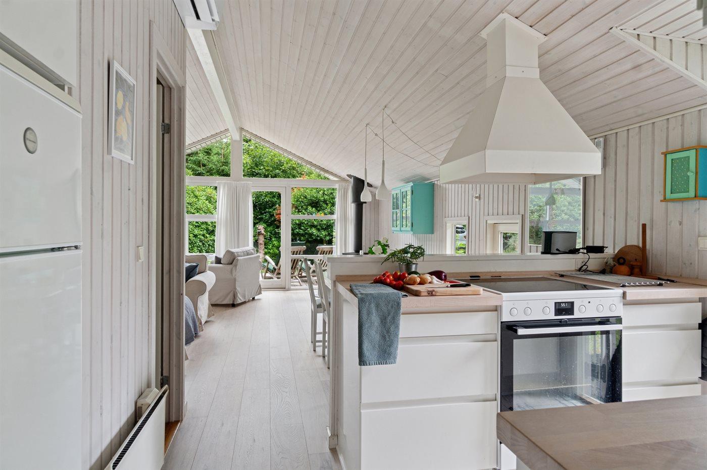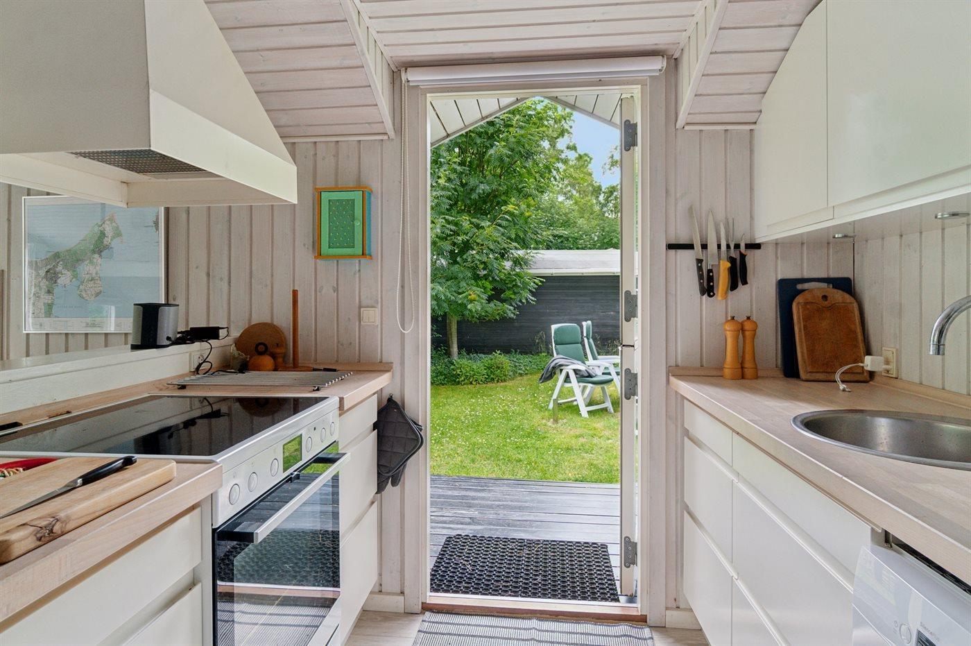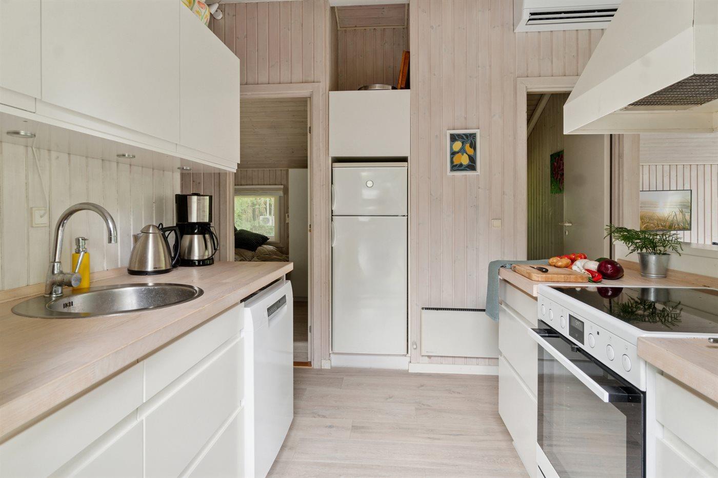 Køkkenet er udstyret med 1 køleskab. Der er 4 keramiske kogeplader, varmluftovn samt opvaskemaskine.