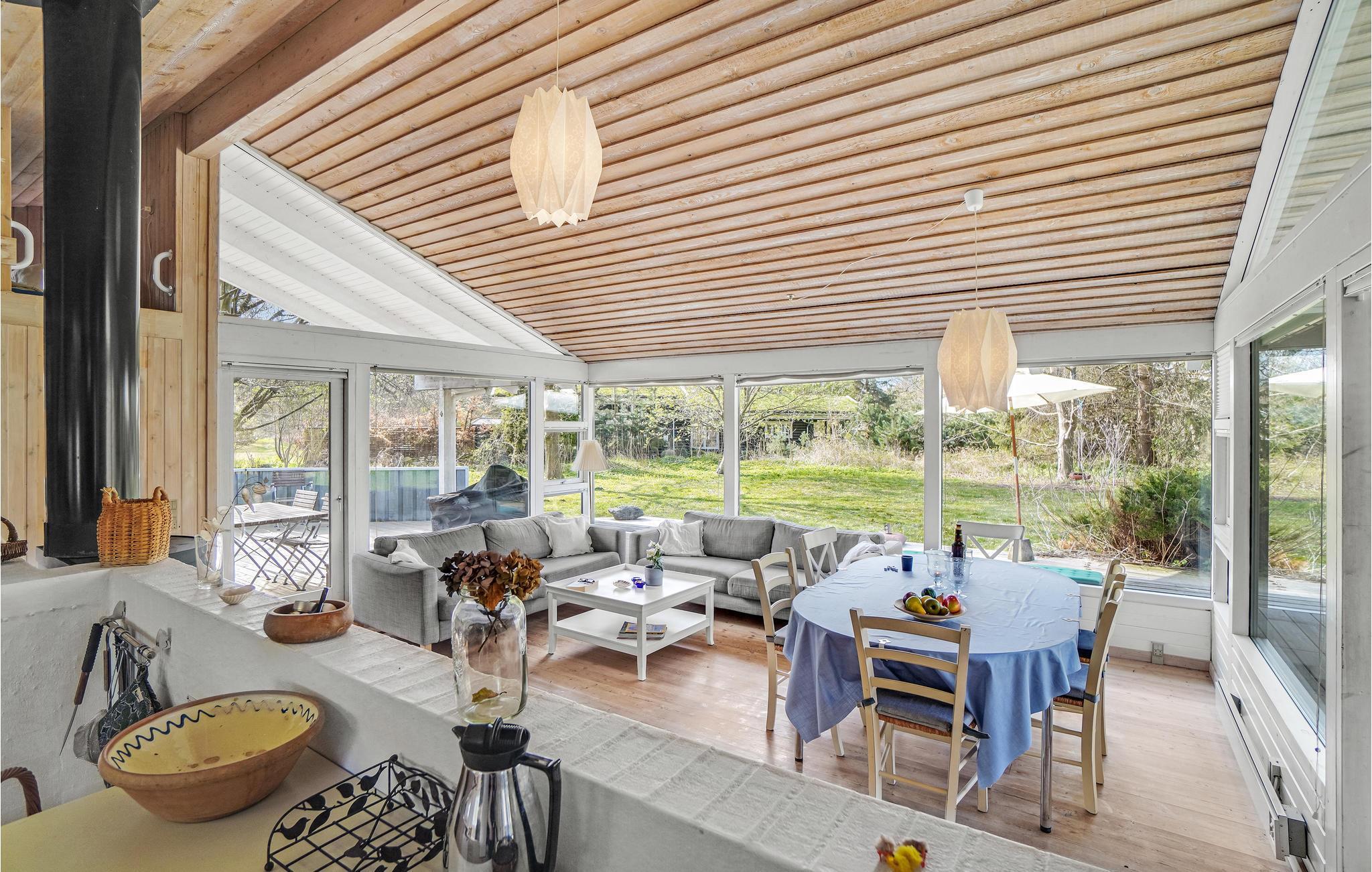 Husets hjerte er den rummelige stue med åbent køkken. Her er der åbent til kip og har store gulv til loft-vinduer, hvilket skaber en rummelig og behagelig atmosfære. I det veludstyrede køkken kan I forkæle jer selv og hinanden med lækre ferieretter, mens I holder samtalen kørende med de andre gæster. Det hyggelige spisebord bliver både omdrejningspunktet for måltiderne, men sikkert også hyggelige spilaftener eller en kop morgenkaffe, mens I holder øje med fuglelivet på grunden.