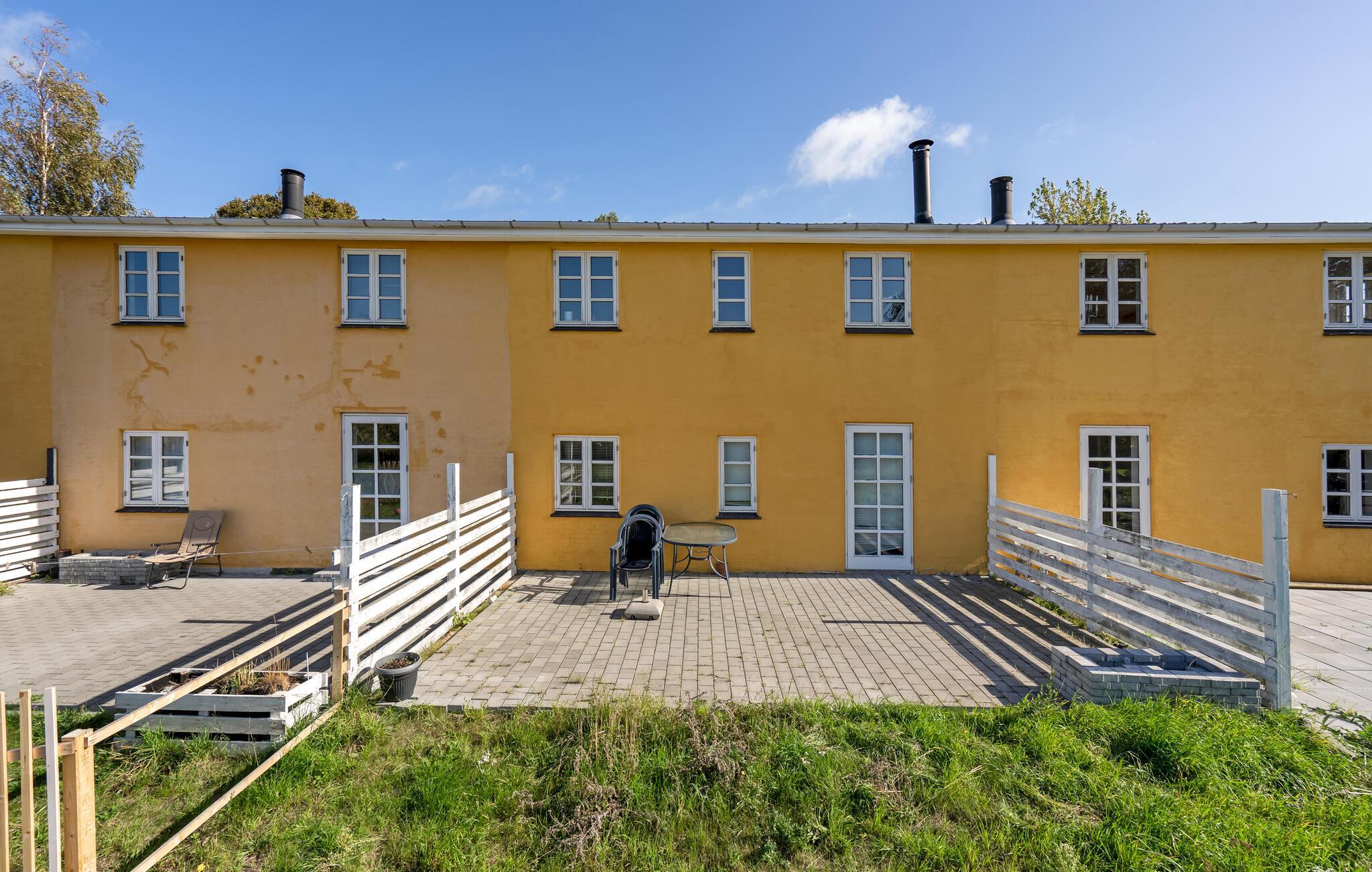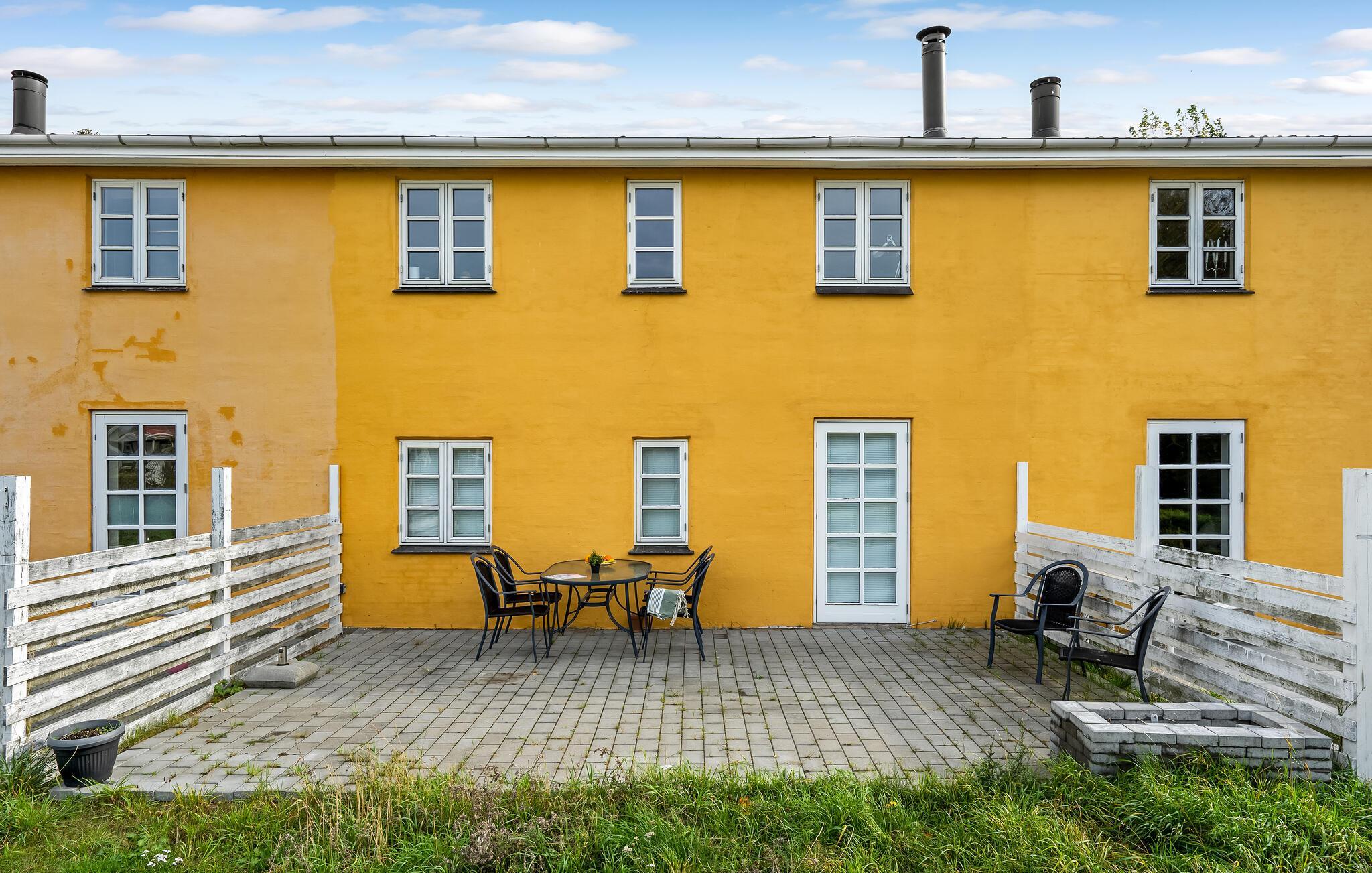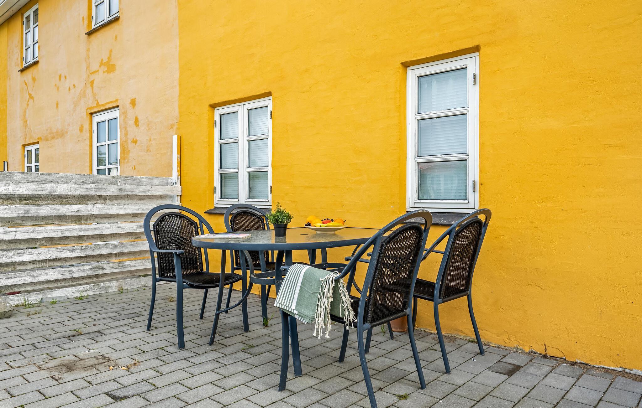 Charmerende gul ferielejlighed på Reersø med åben terrasse og kort afstand til sandstrand.