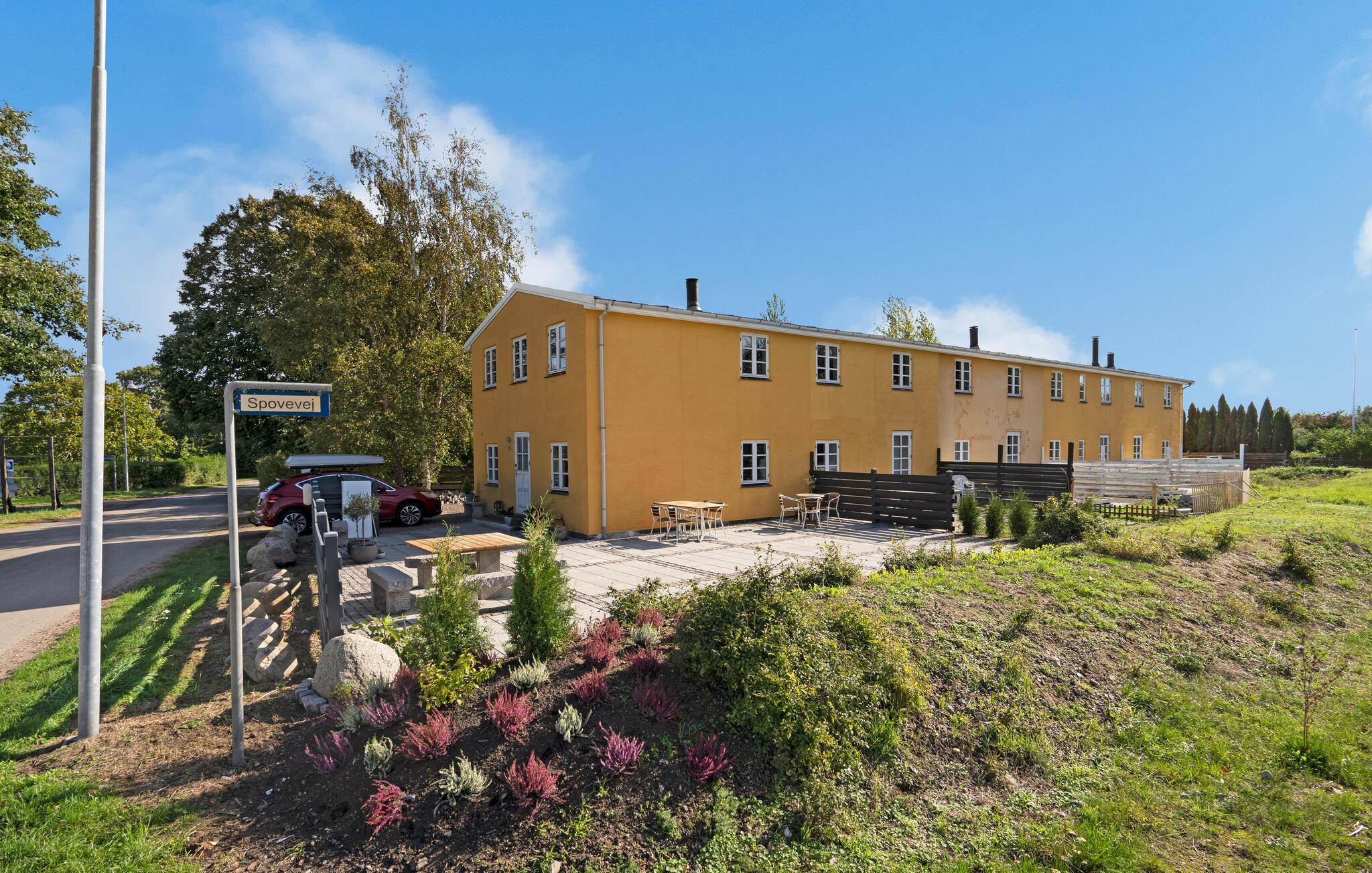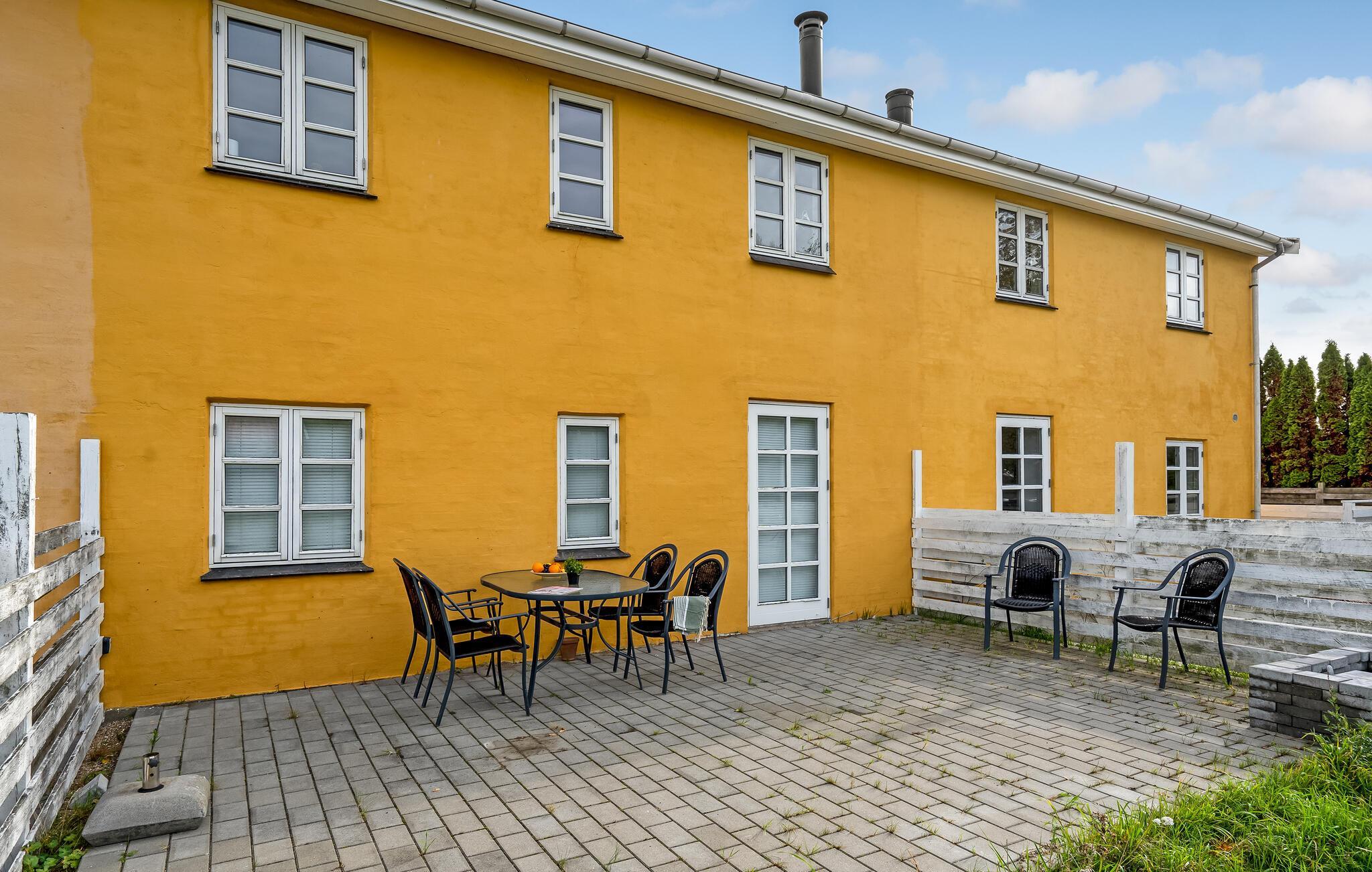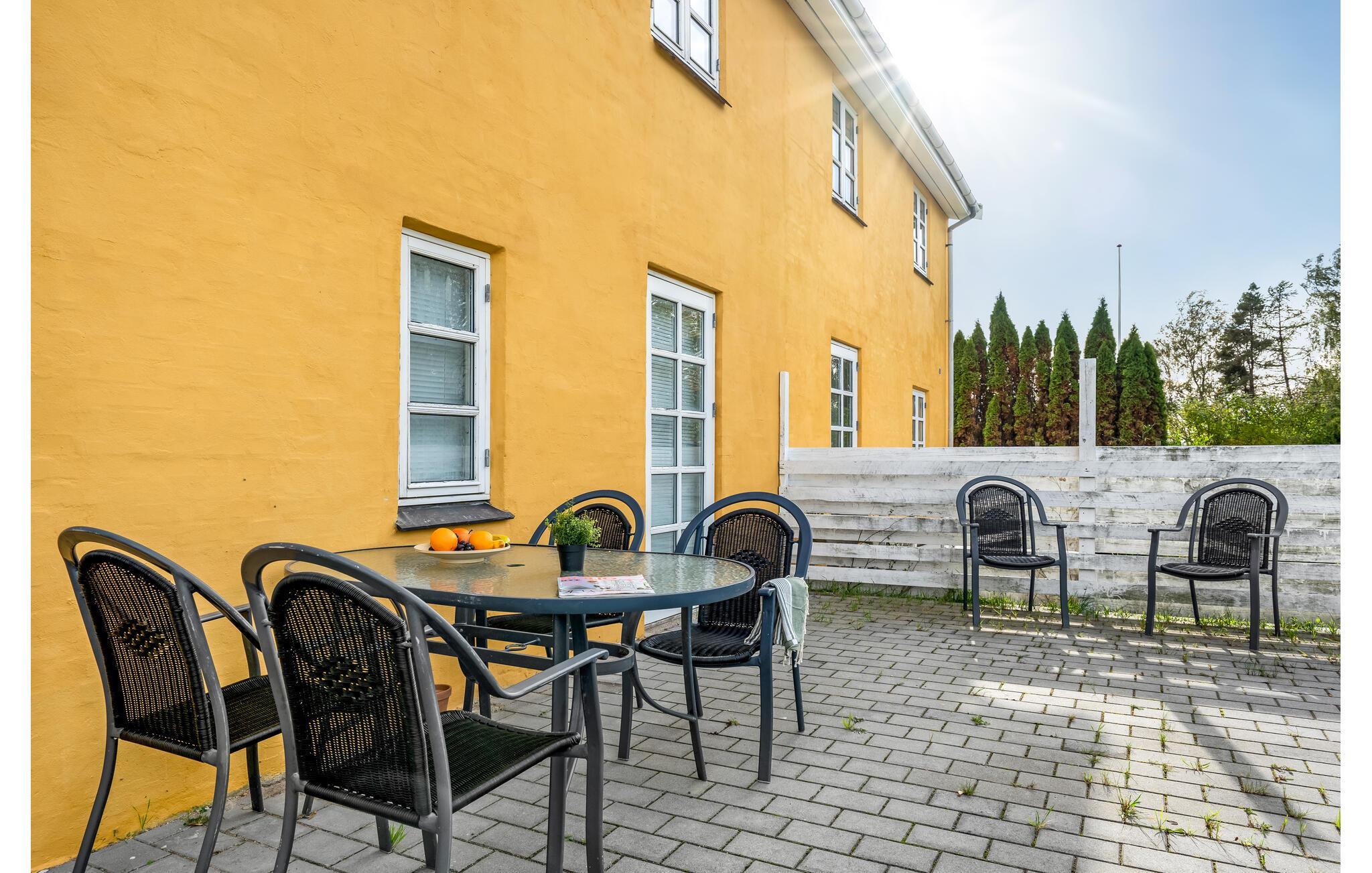 Charmerende gul ferielejlighed på Reersø med åben terrasse og kort afstand til sandstrand.