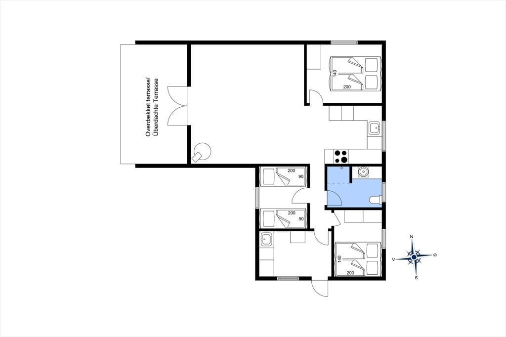 Feriehuset er indrettet med kombineret køkken og opholdsstue. Lyst Køkken som indeholder keramisk komfur, opvaskemaskine, mikroovn, Airfryer og køleskab med fryser. Opholdsstue med udgang til delvist overdækket træterrasse, brændeovn, sofaer, god spiseplads, Smart-TV med adgang til streamingtjenester (kræver eget login). Bryggers med vaskemaskine og tørretumbler. Badeværelse med klinkegulv, bruseniche og gulvvarme. Tre soveværelser, Et med dobbeltseng, et med en dobbelt sovesofa og et med en enkeltseng. Huset opvarmes med varmepumpe, Brændeovn og elvarme.
