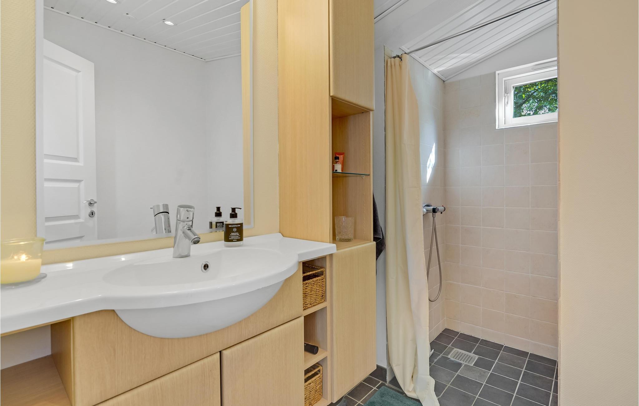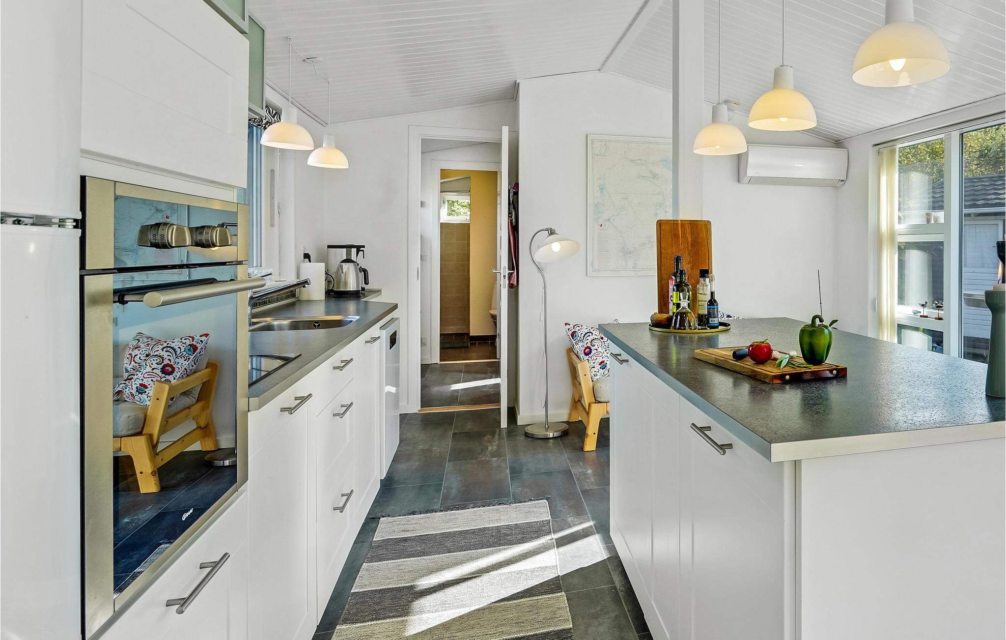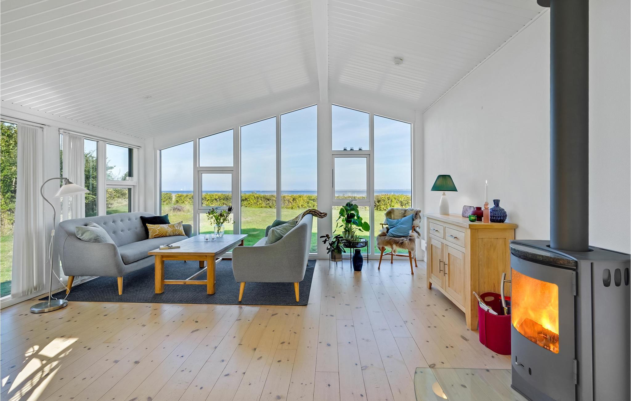 Sommerhuset er komfortabelt indrettet og skaber ideelle rammer for et ophold, I vil huske med glæde i lang tid. Store vinduer giver et dejligt lysindfald og en vidunderlig panoramaudsigt over vandet. Der er behagelig gulvvarme på badeværelset. Om aftenen kan I slappe af foran brændeovnen og lytte til flammernes knitren.