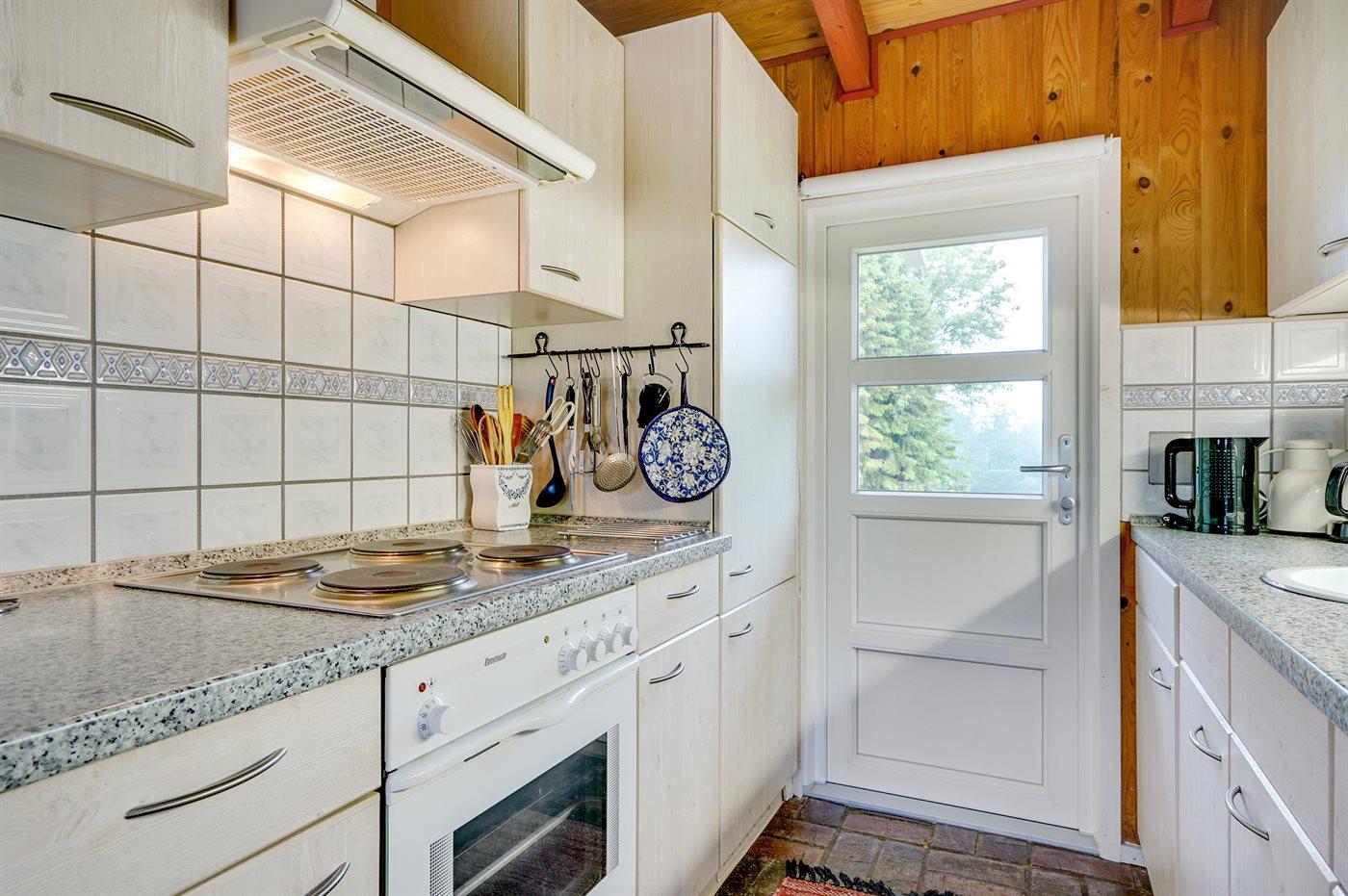Køkkenet er udstyret med 1 køleskab. Der er 4 elkogeplader, varmluftovn, mikrobølgeovn.