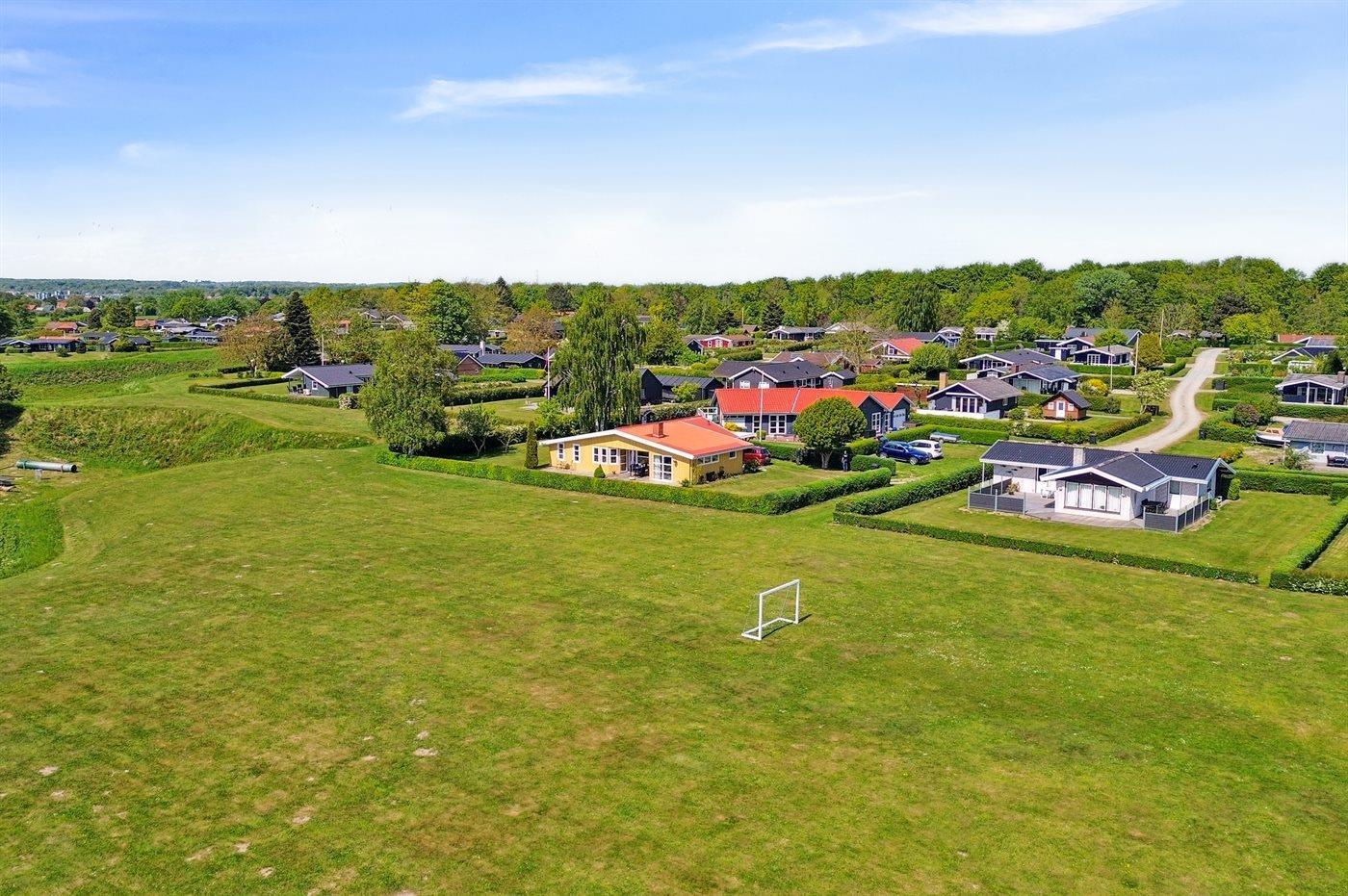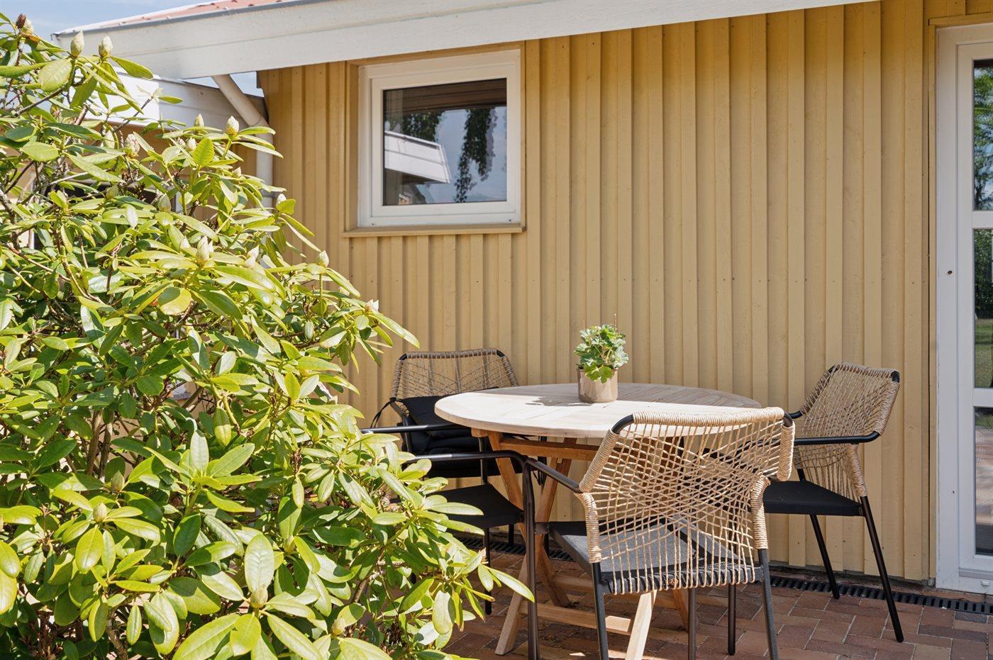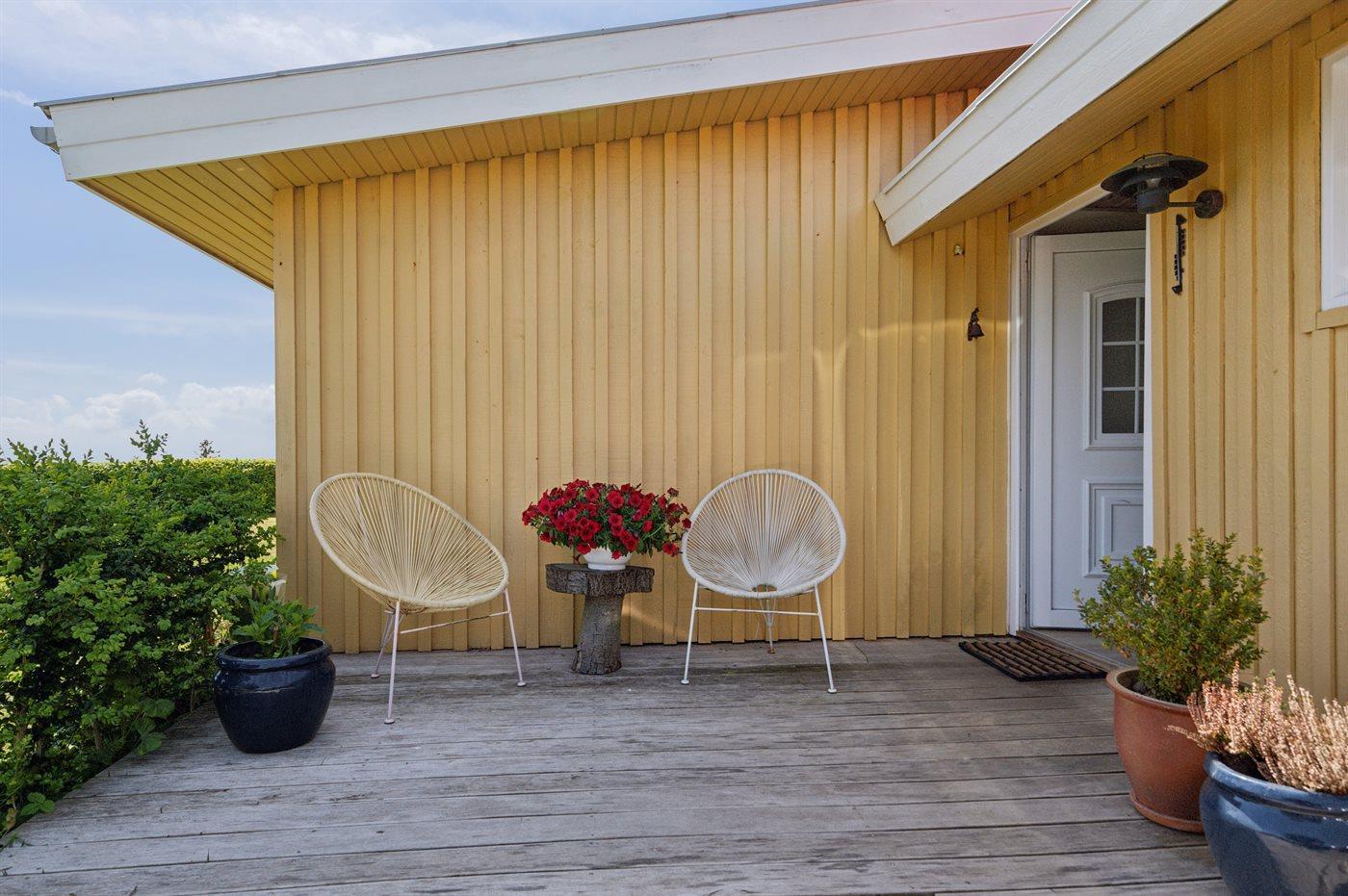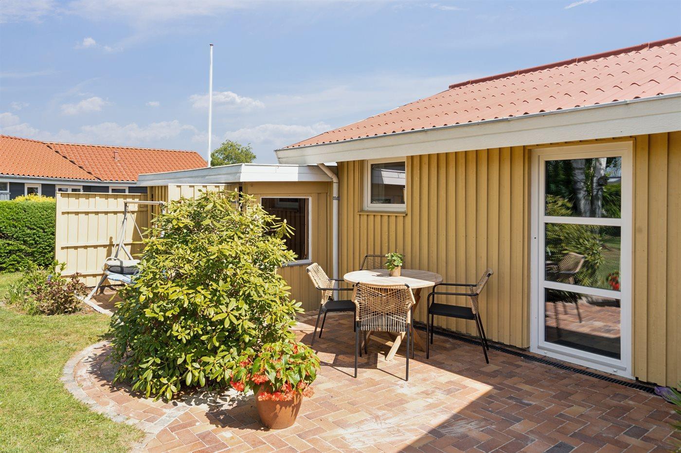 Ferieboligen er beliggende på en 800 m² stor havegrund. Der er 200 m til havet. Til ferieboligen hører åbent terrasseareal. Desuden er der overdækket terrasse. Grill til rådighed. Der er carport til rådighed. Parkering ved ferieboligen.