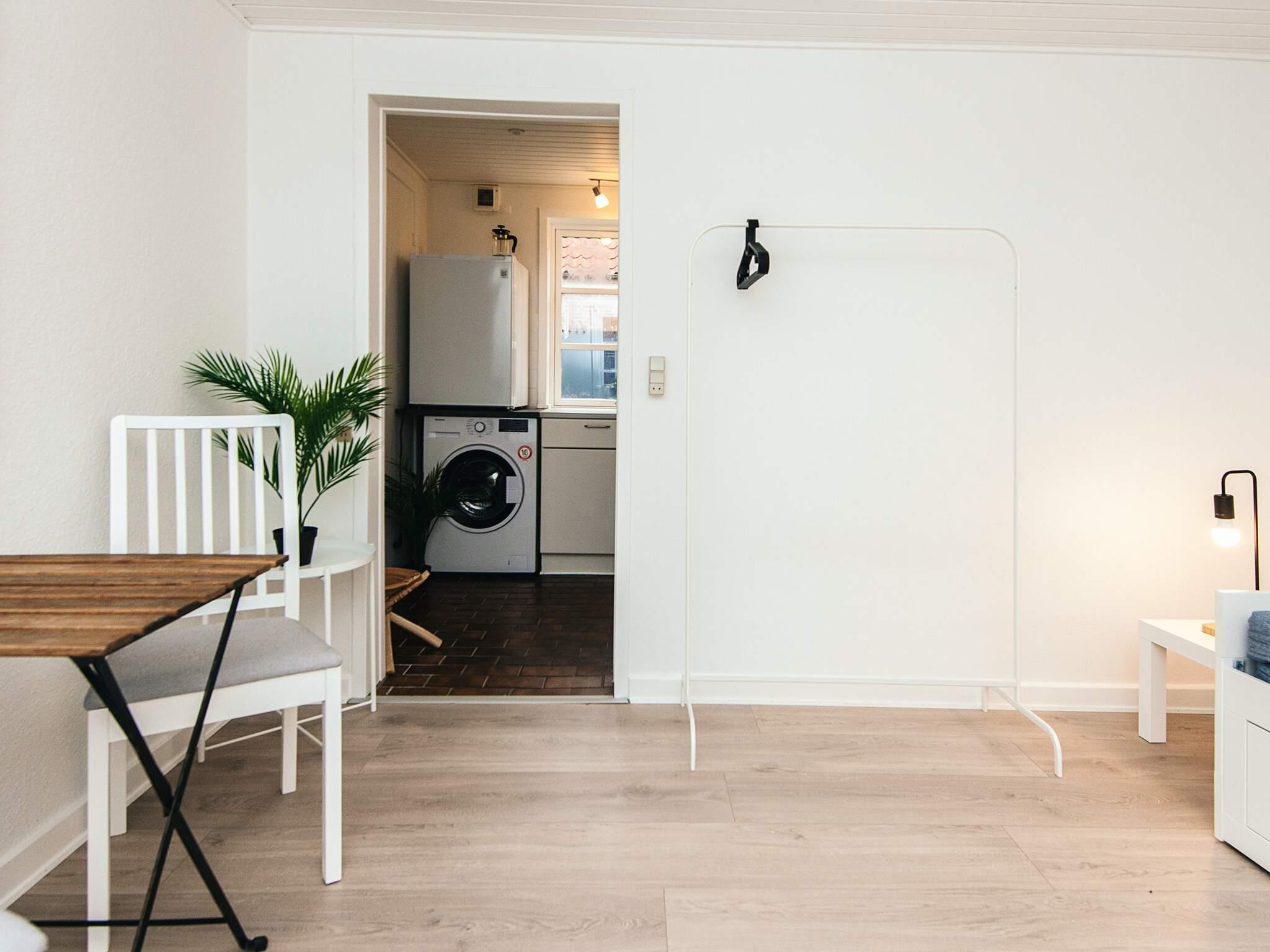 Lejligheden har et minikøkken med elkomfur og køle-fryseskab samt et badeværelse med vaskemaskine, håndvask og bruser. Fjernvarme sikrer et behageligt ophold. Gæsterne kan også nyde den udendørs gårdhave, som er perfekt til at slappe af og nyde den fredelige atmosfære.