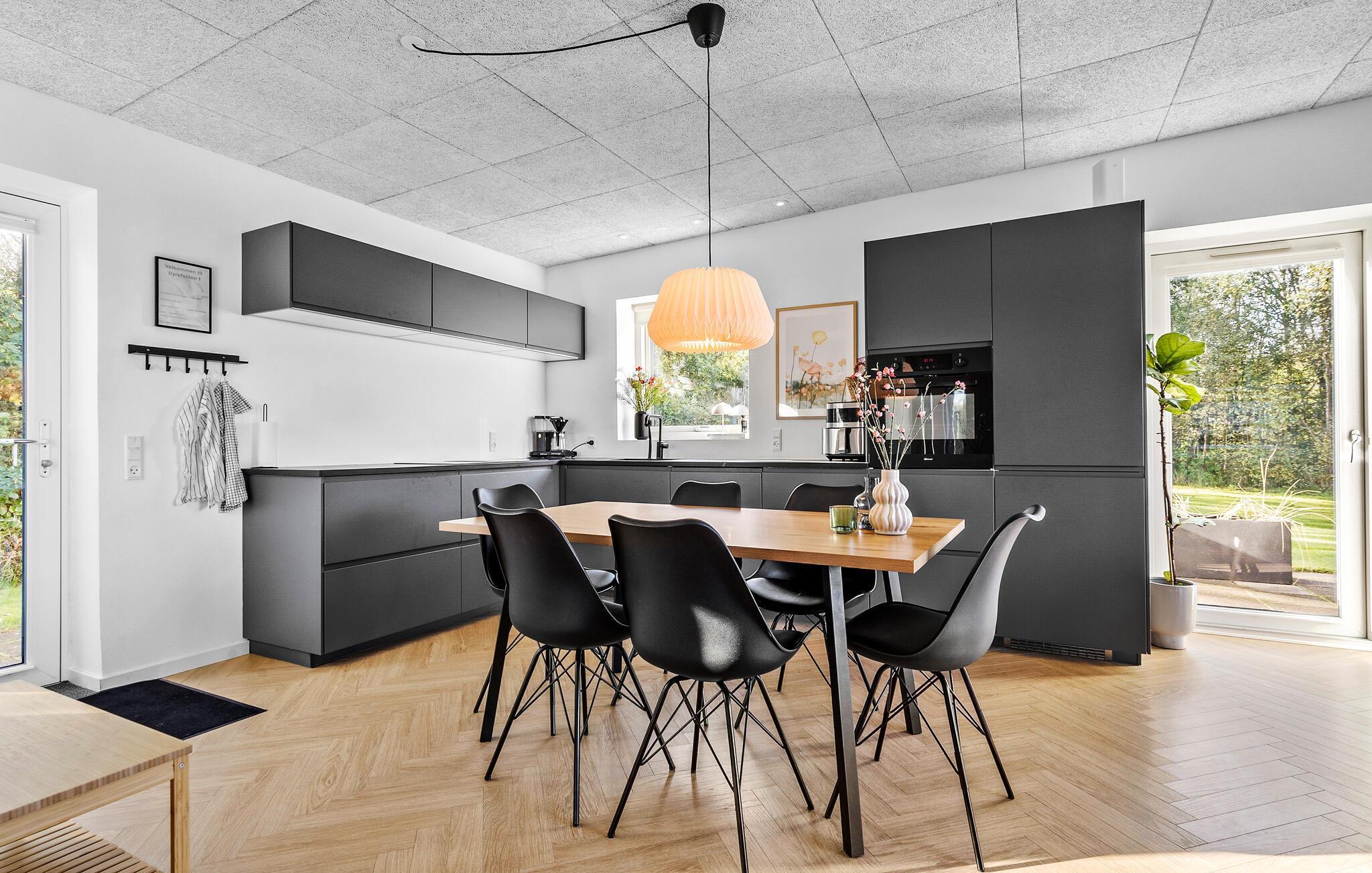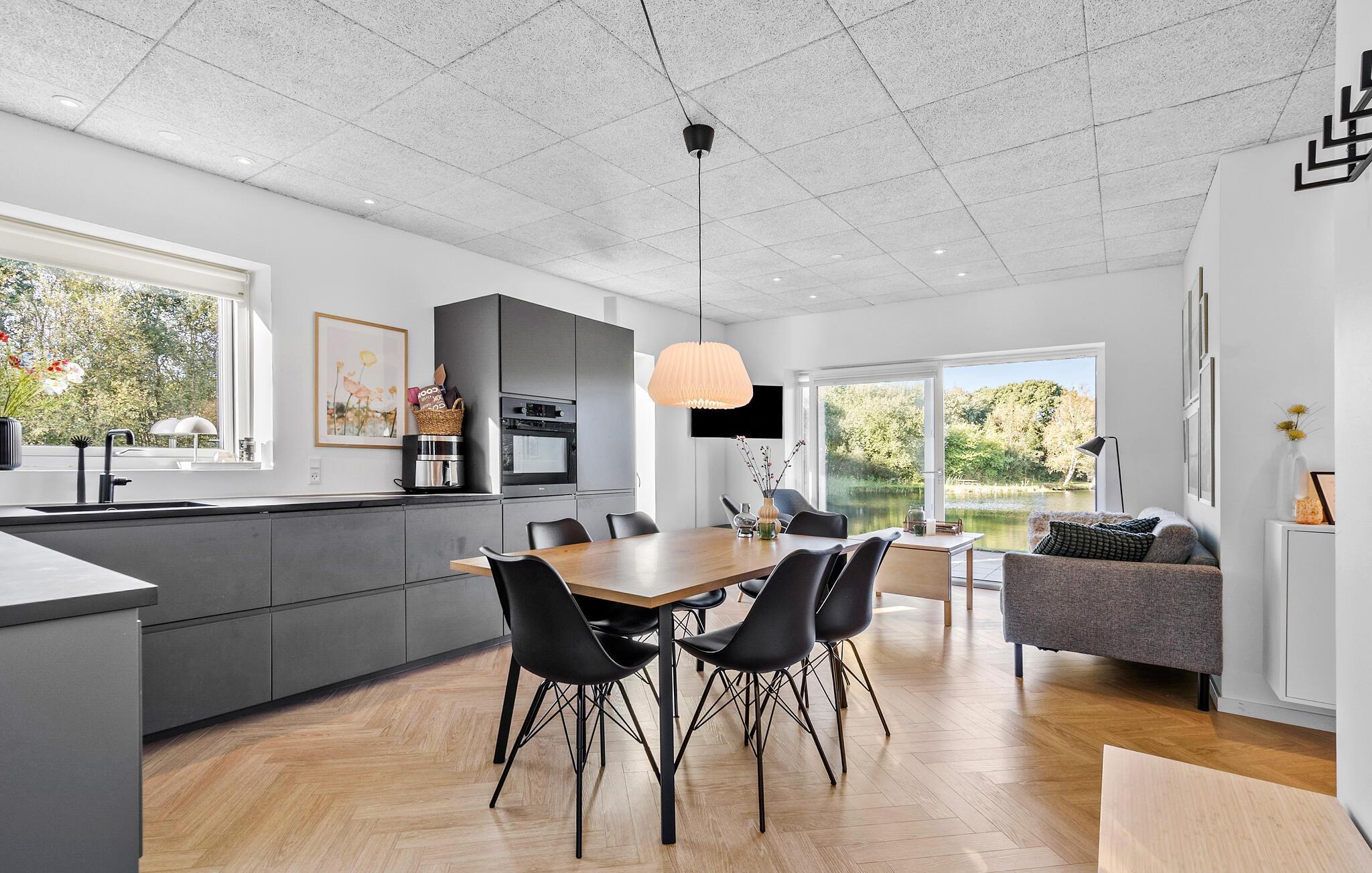 I bor lige ud til en sø i dette elegante feriehus, som ligger i fredfyldte rammer og giver jer et herligt udgangspunkt for ferien i det vestjyske. Huset emmer af moderne kvalitetsløsninger og har udsigt både fra stuen og terrassen. I kan derfor begynde feriedagene på bedste vis med en kop kaffe, mens I skuer ud på omgivelserne og lige så stille beslutter jer for, hvad dagen skal bruges på. De brede vinduespartier lukker de grønne rammer smukt ind i boligen, så ude og inde næsten smelter sammen. Efter dagens udflugter kan I samles her og læne jer godt tilbage i de bløde møbler, hygge jer med brætspil eller gøre klar til aftenens store middag i det veludstyrede køkken.
