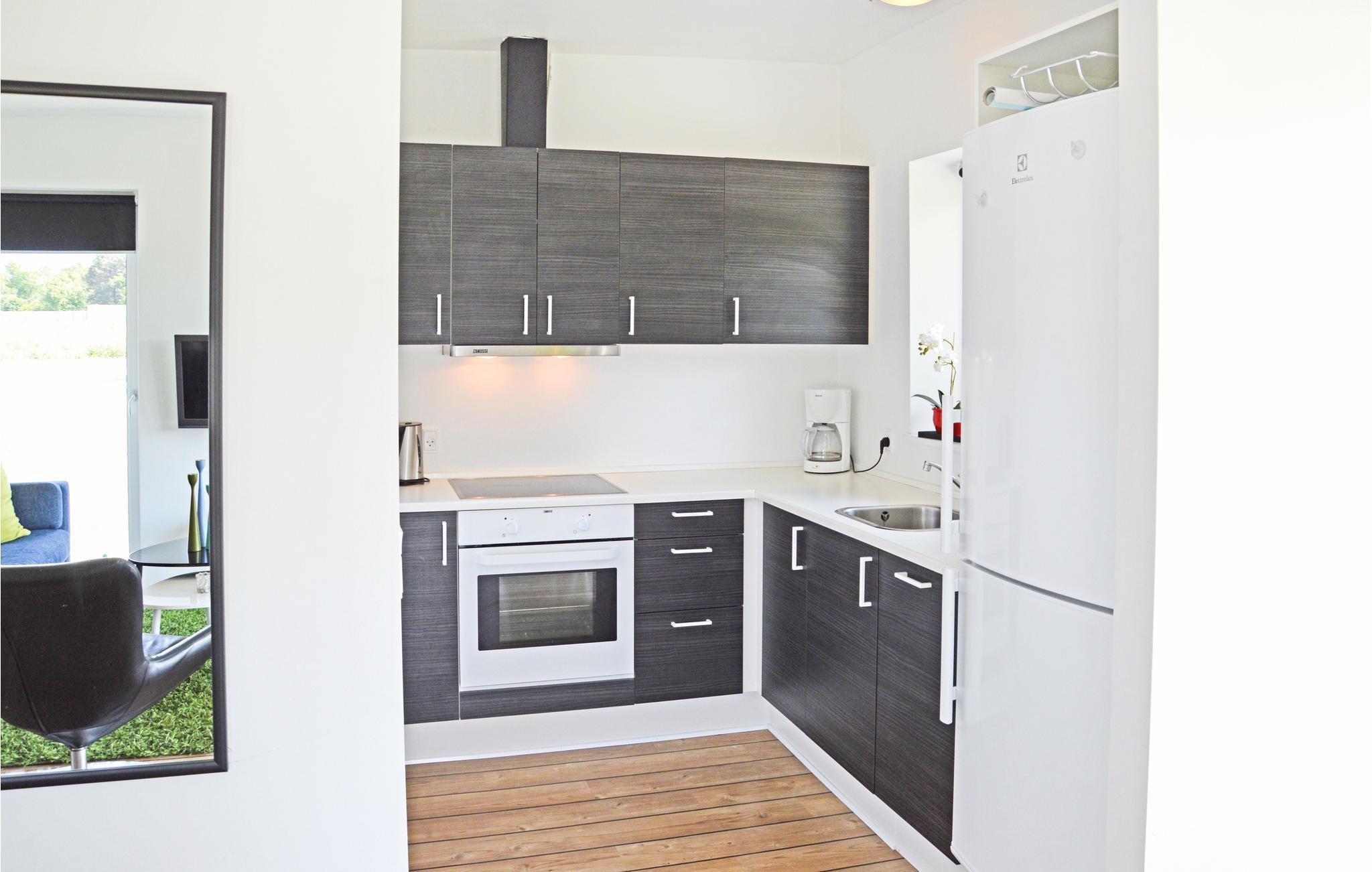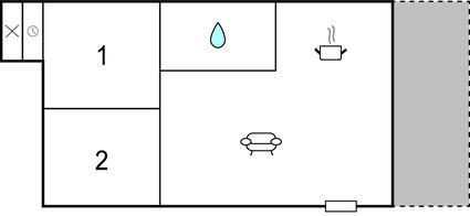 Huset er indrettet med 2 soveværelser samt badeværelse med bruser. Køkkenet og stuen ligger i åben forbindelse, og herfra er der udgang til terrassen.
