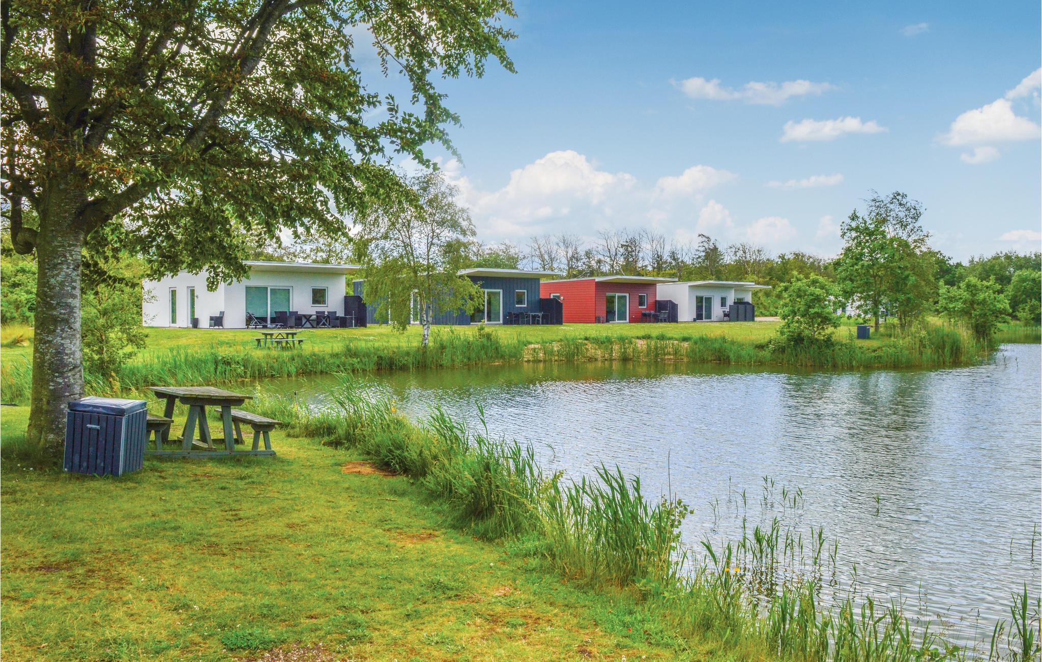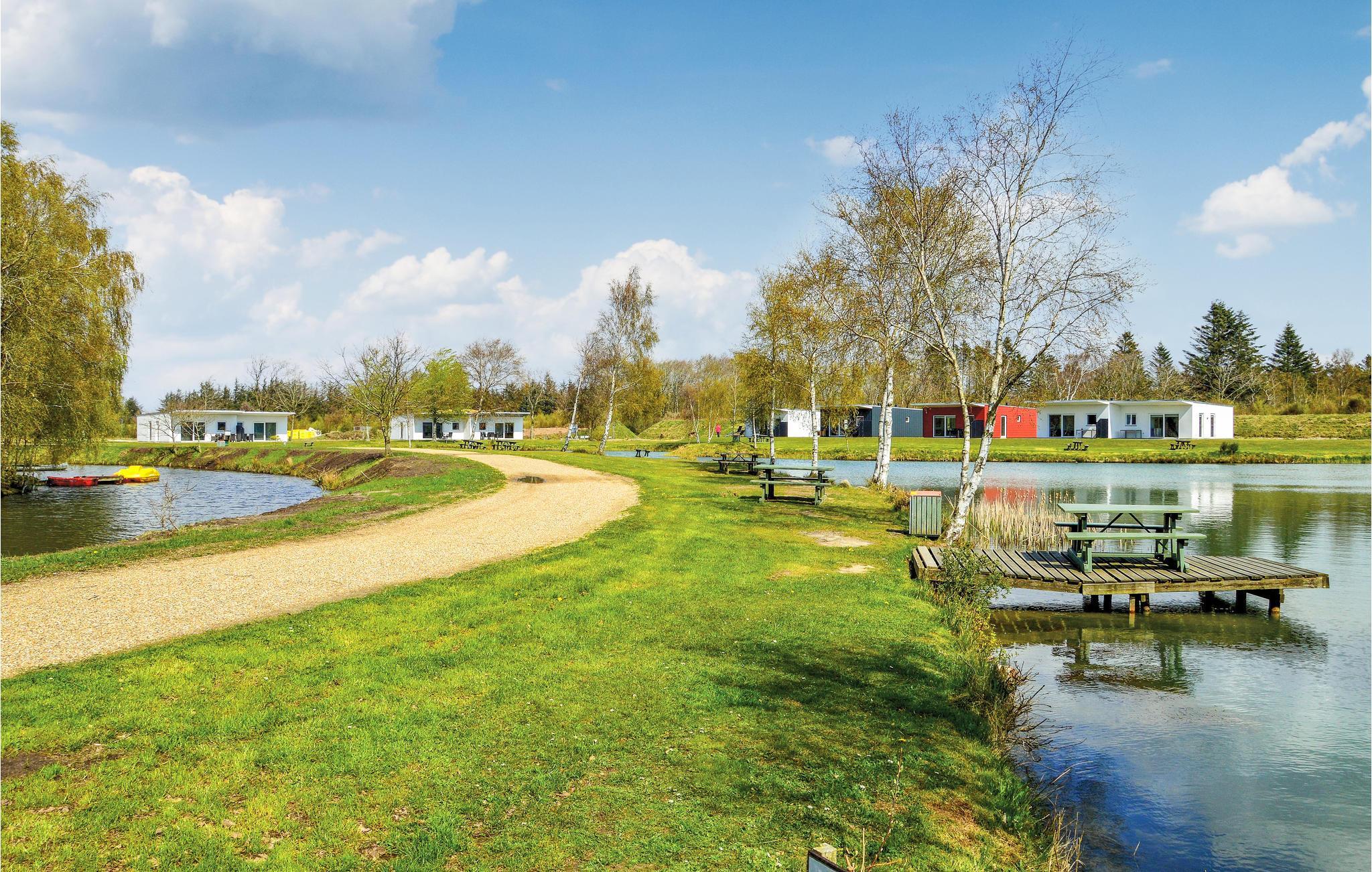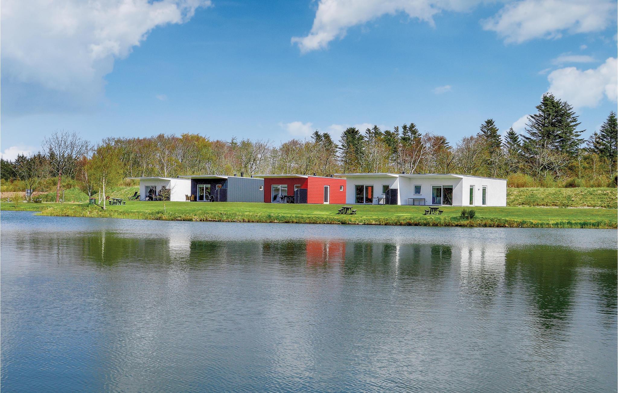Dette energivenlige sommerhus ligger i Camping og Familiepark West i Hee med udsigt over en smuk fiskesø, der ligger lige ude foran terrassen.