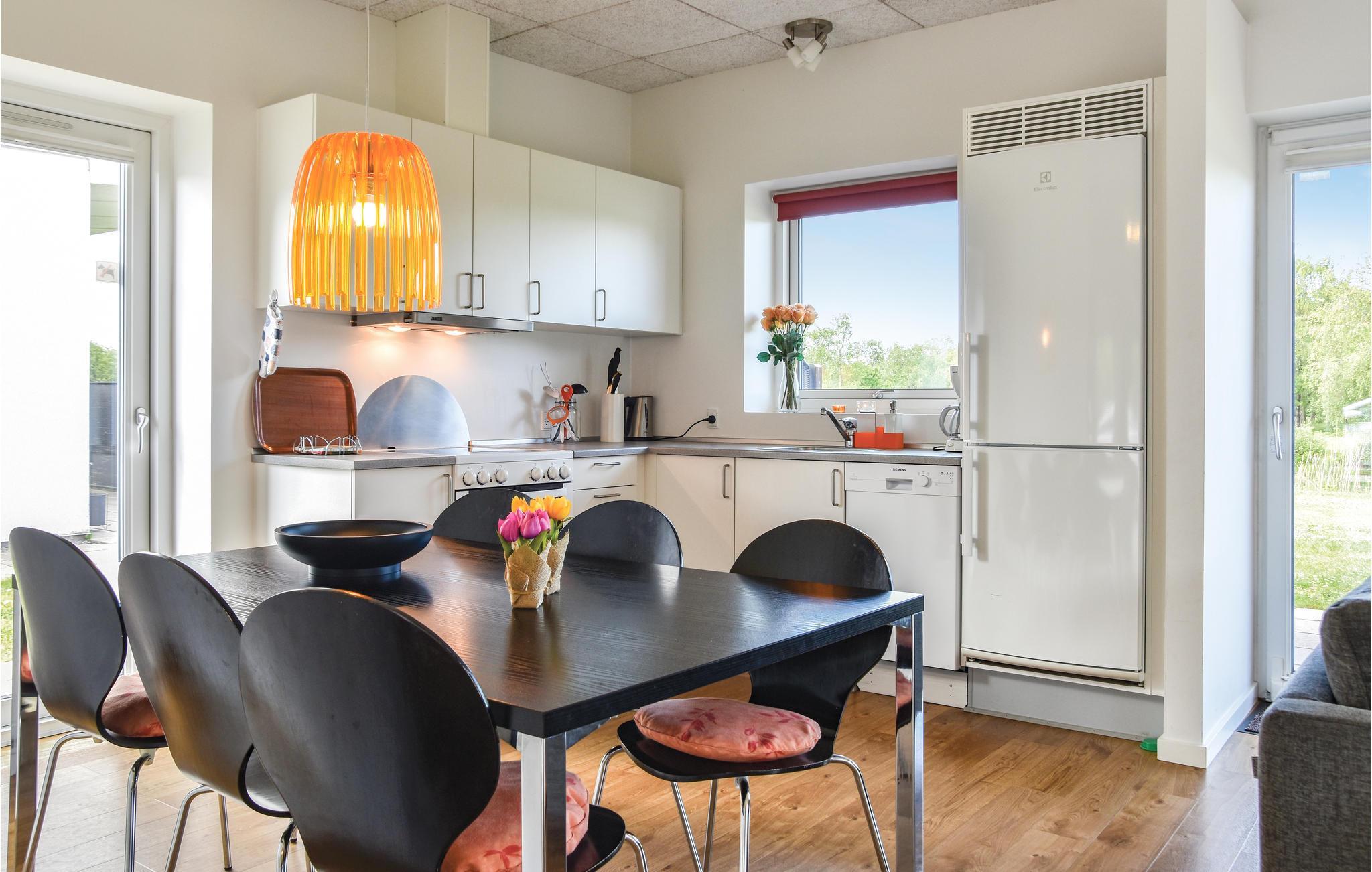 Huset er indrettet med 3 soveværelser samt badeværelse med brusekabine. Køkkenet og stuen ligger i åben forbindelse, og herfra er der udgang til terrassen.
