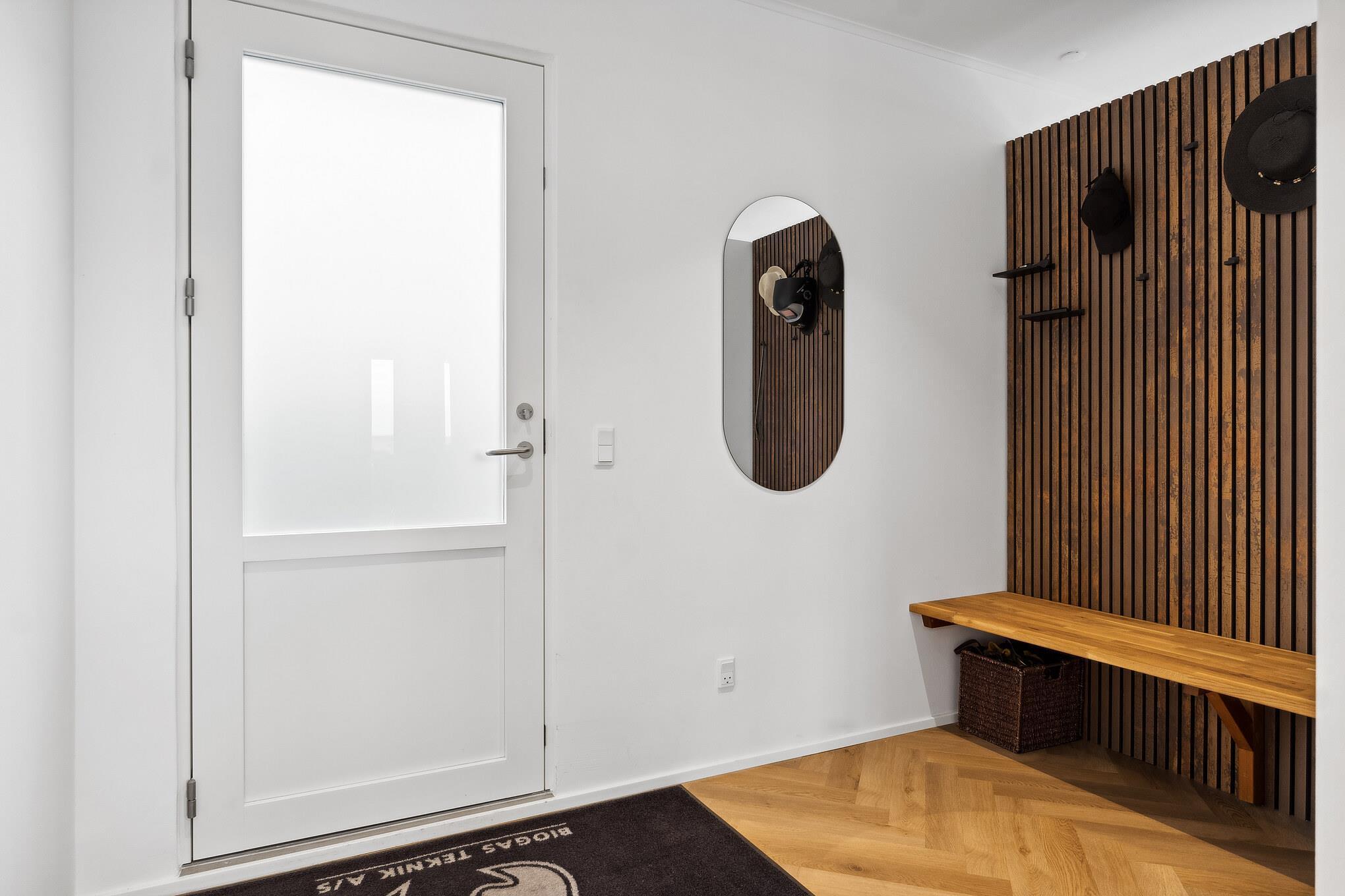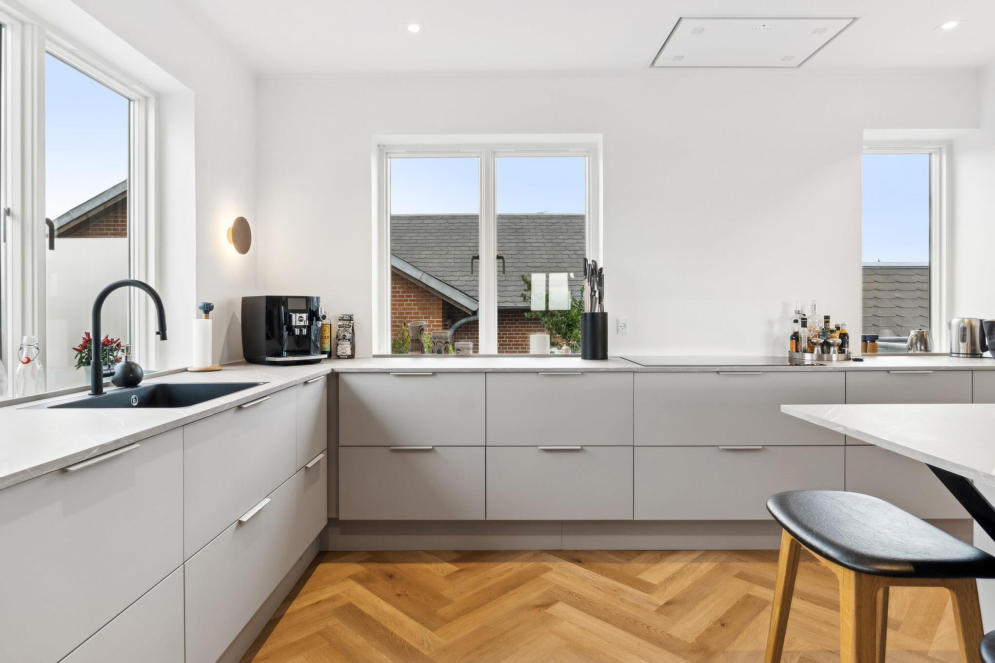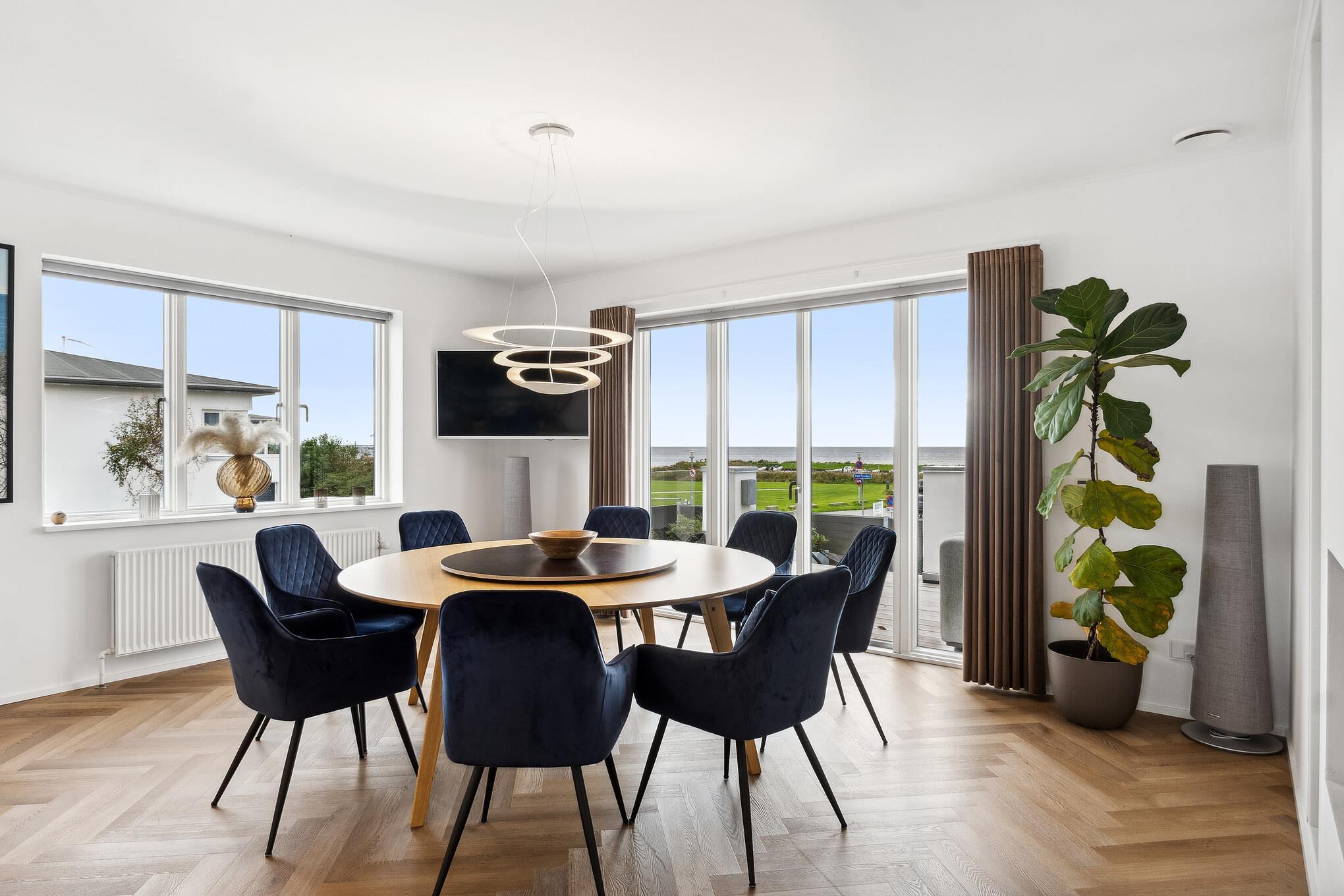 Boligen byder på et lyst og elegant køkken-alrum med moderne faciliteter, lysegrå elementer og god opbevaringsplads. Det smukke sildebensparket breder sig ud i opholdsstuen, hvor store vinduespartier lukker lyset ind og giver jer en fantastisk udsigt over fjorden. Her er det oplagt at samles til hyggelige måltider eller bare nyde roen og udsigten.