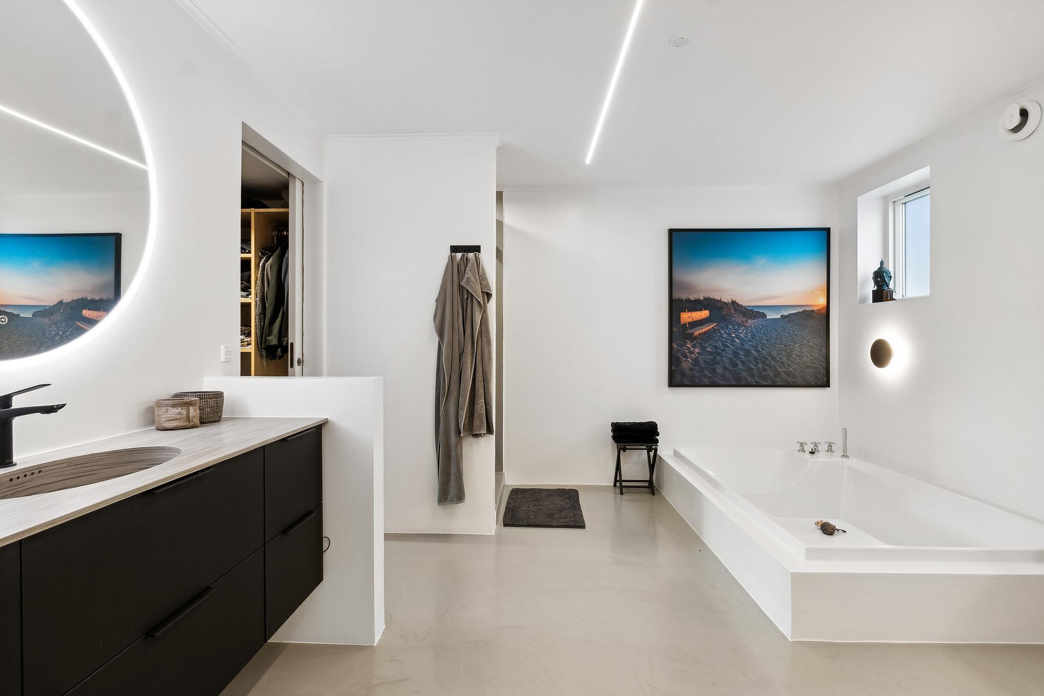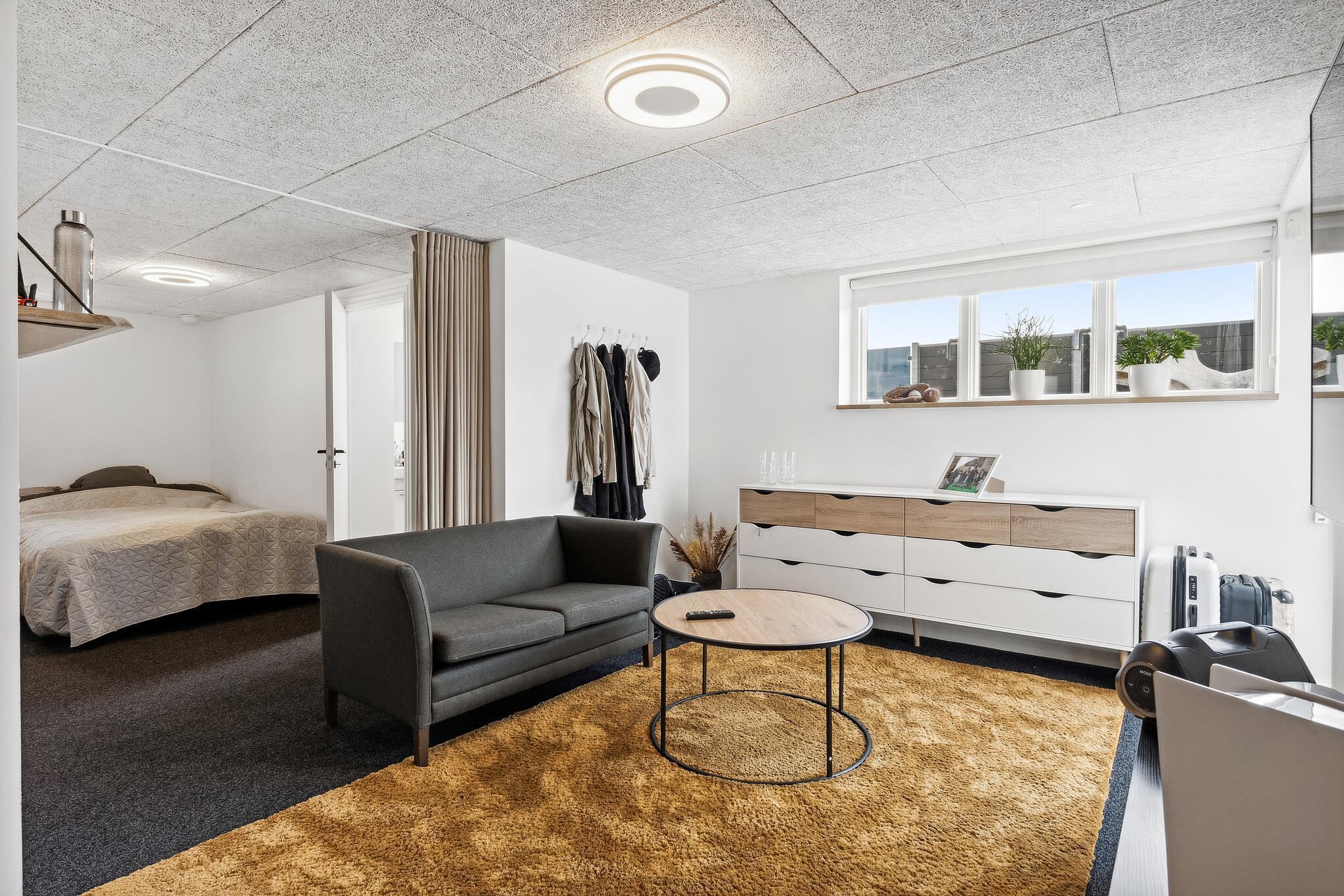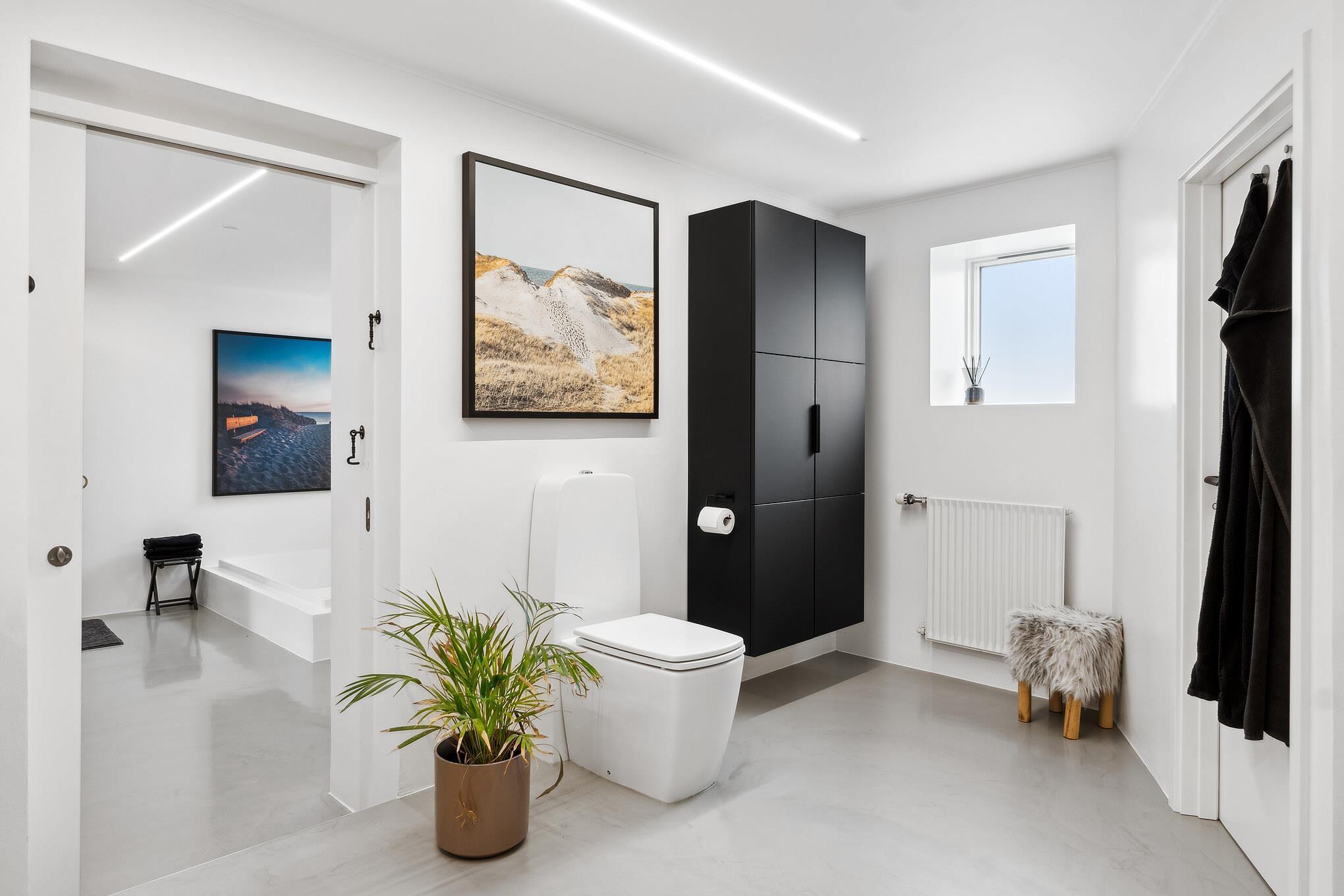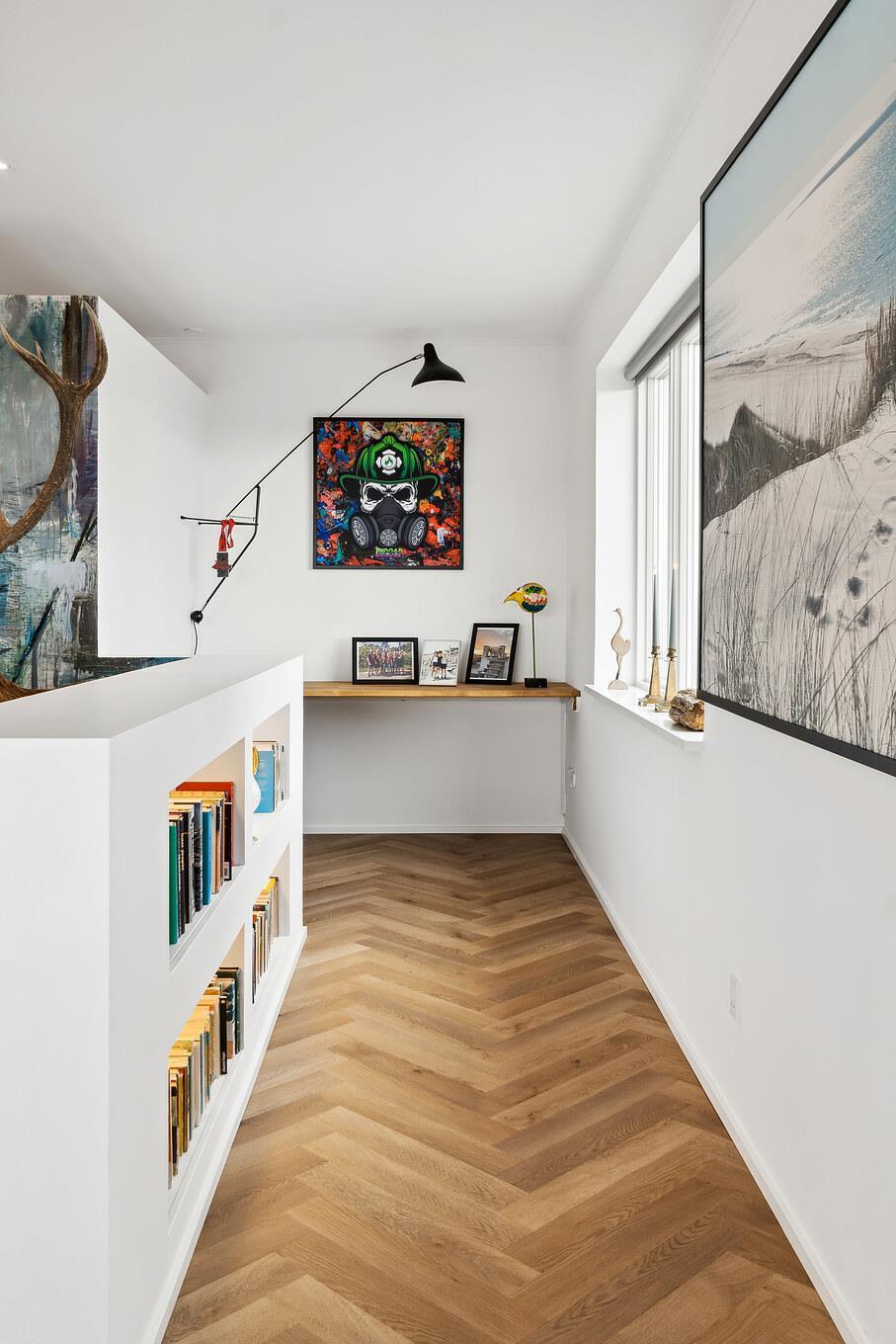 Boligen byder på et lyst og elegant køkken-alrum med moderne faciliteter, lysegrå elementer og god opbevaringsplads. Det smukke sildebensparket breder sig ud i opholdsstuen, hvor store vinduespartier lukker lyset ind og giver jer en fantastisk udsigt over fjorden. Her er det oplagt at samles til hyggelige måltider eller bare nyde roen og udsigten.